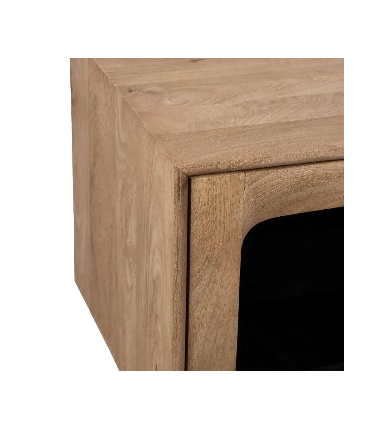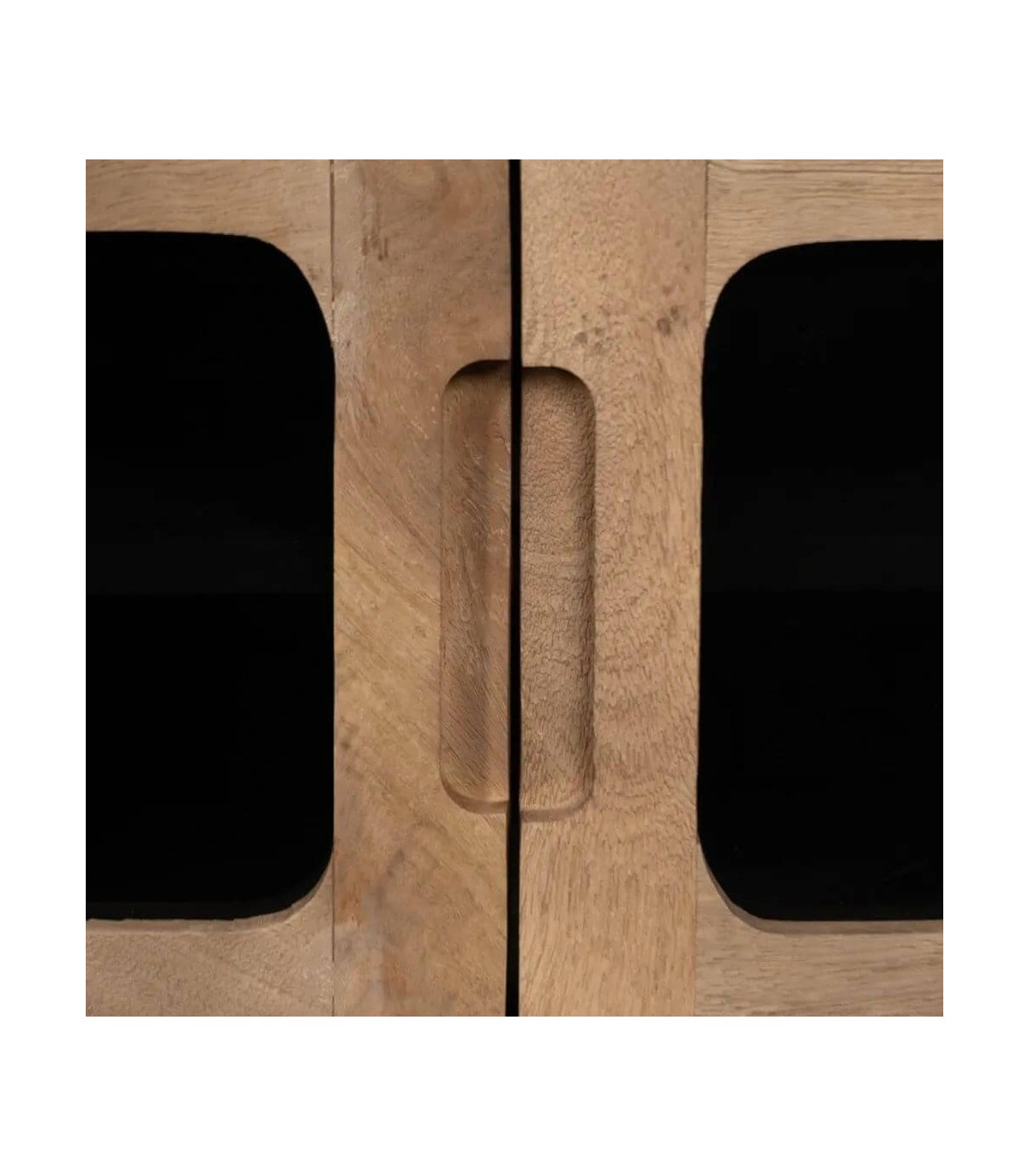 Los detalles en cristal ahumado gris oscuro aportan un contraste elegante y un aire contemporáneo dentro de la calidez natural del conjunto. Su estructura sólida transmite estabilidad y resistencia, convirtiéndose en pieza central del espacio sin sobrecargarlo. El acabado natural revela la riqueza de la madera, con vetas y matices.