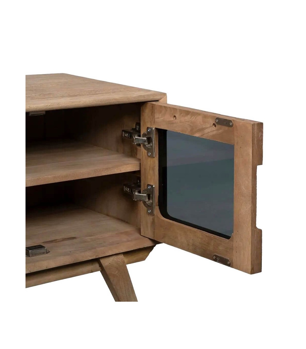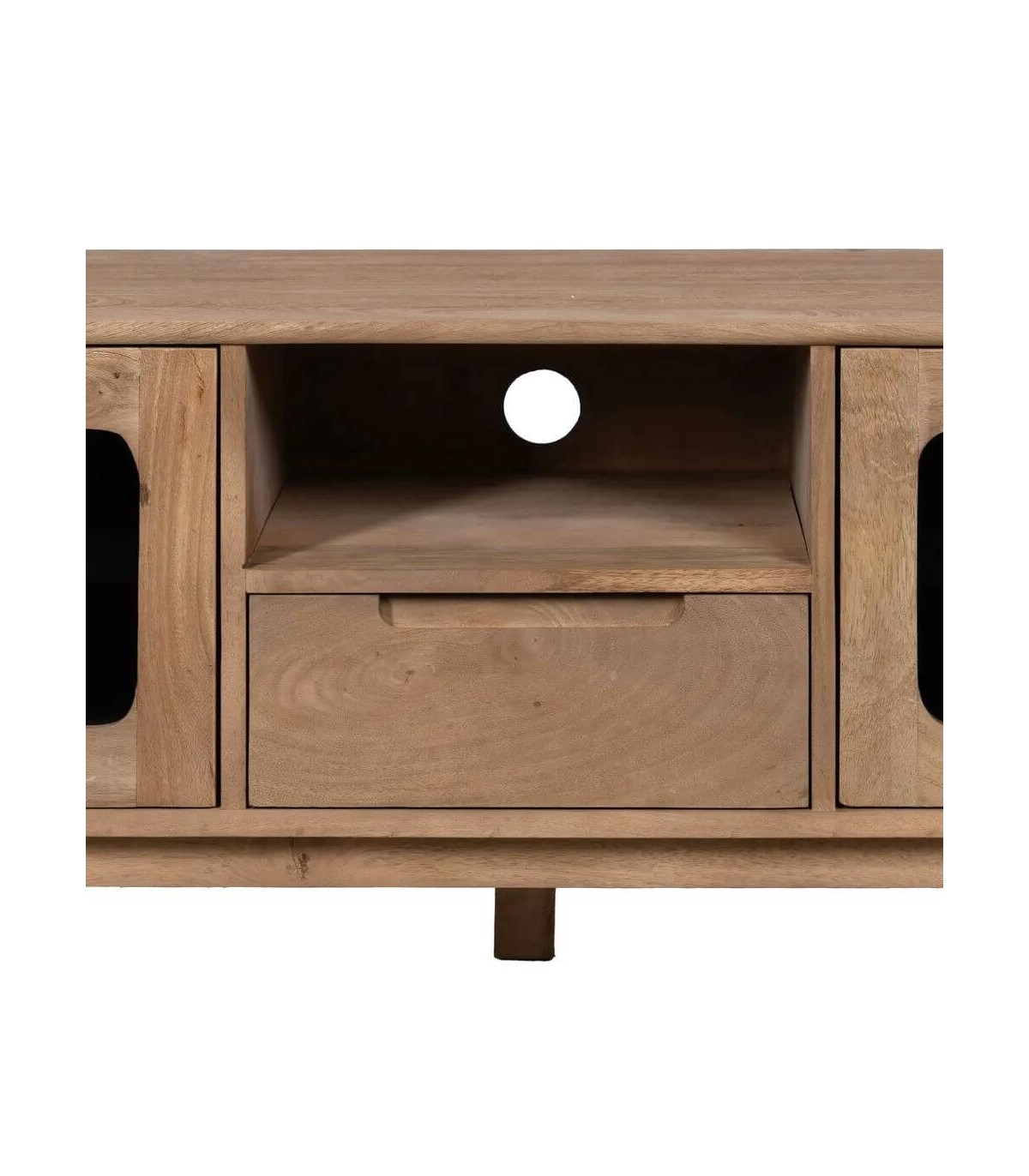 📺 Mueble TV Madera Mango Natural y Cristal Ahumado – Estilo Boho 🌿