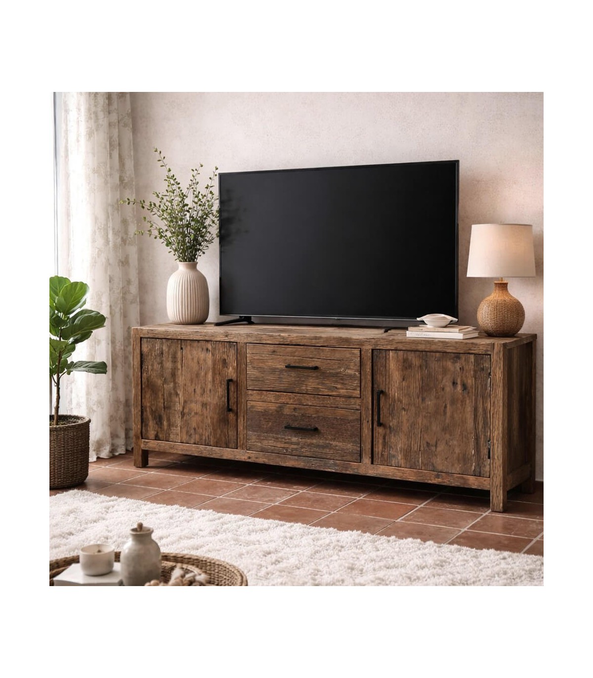 Inspirado en la autenticidad de los interiores rústico boho, este mueble de TV aporta carácter y calidez visual al espacio. La madera maciza de pino reciclado transmite una sensación robusta y natural que envuelve el conjunto. Las dos puertas y los dos cajones crean un equilibrio práctico y decorativo que refuerza su presencia.