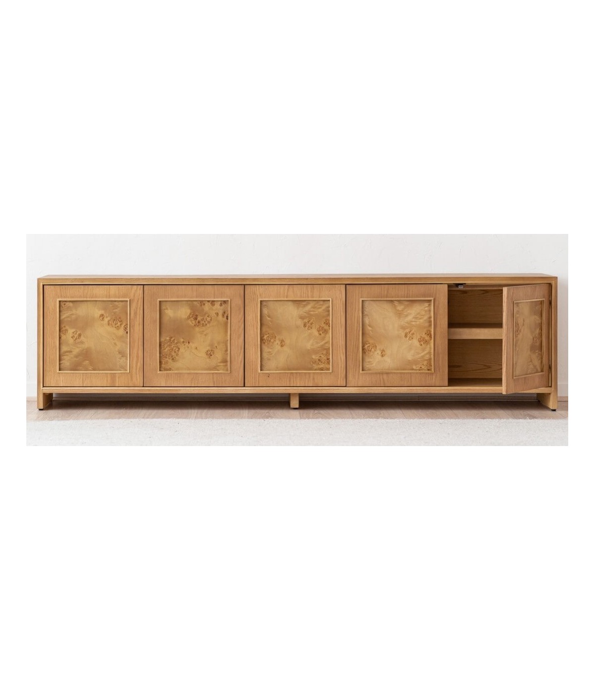 La textura tostada del roble y el dibujo único de la raíz crean un mueble de TV con un carácter boho sereno que aporta calidez y equilibrio al salón, mientras su formato bajo y alargado suaviza la perspectiva y mantiene una presencia ligera que no invade el espacio.