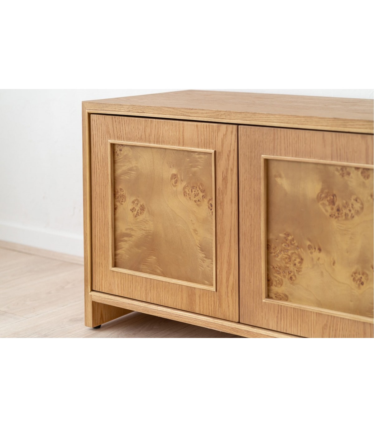 Las puertas enmarcadas muestran vetas cambiantes que añaden profundidad visual y un toque artesanal, y el interior ofrece un almacenamiento práctico que mantiene el orden sin romper la armonía. Es una pieza pensada para quienes buscan materiales nobles, un diseño cuidado y una belleza natural que acompaña la vida diaria con discreción y autenticidad.