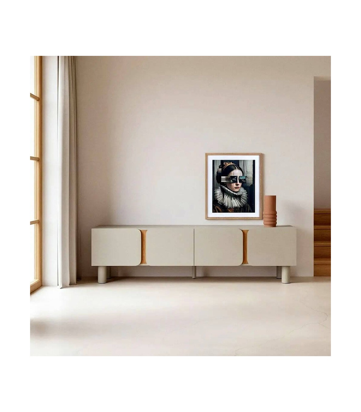 Mueble de televisión grande con estructura en madera DM y detalles en roble natural que aportan equilibrio entre sobriedad y calidez. Su diseño de líneas puras y cuatro puertas sin tiradores crea una estética limpia y contemporánea, perfecta para salones actuales.