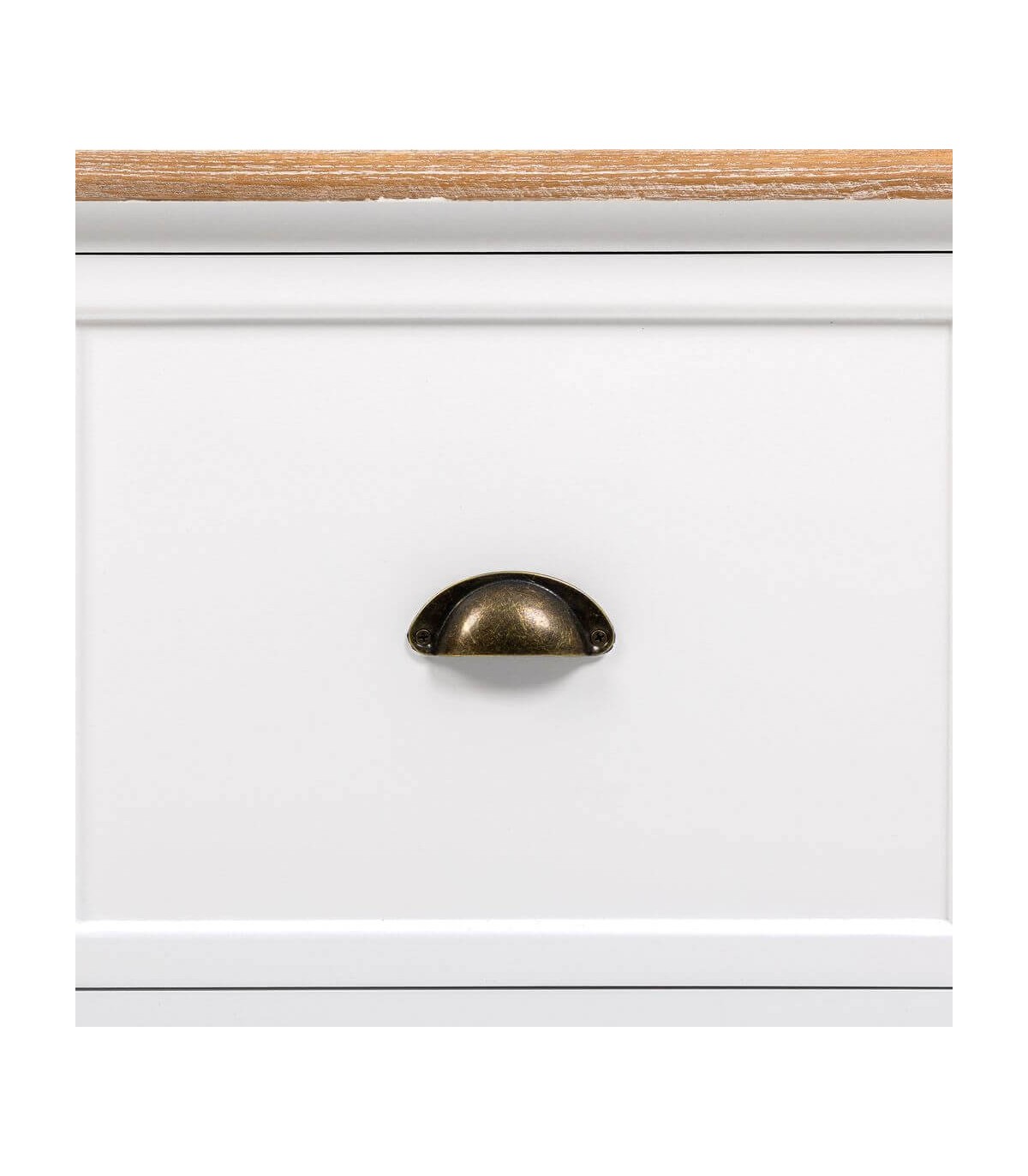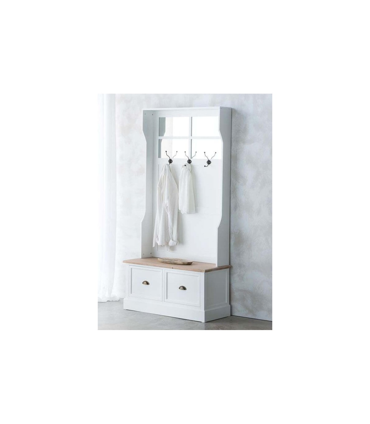 Perchero de nuestra colección Mirlo, una colección que se caracteriza por su luminosidad, realizada en madera lacada en blanco con la tapa en madera natural patinada en blanco, de líneas rectas con el contraste del tirador tipo concha en metal acabado bronce.