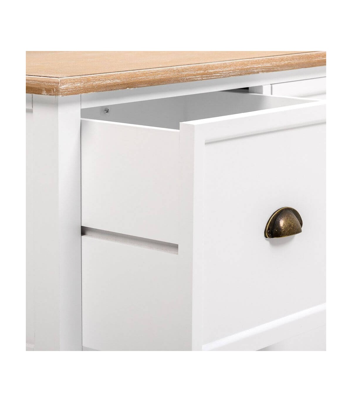 Acabado, tapa madera natural patinada en blanco, cuerpo lacado en blanco, tiradores bronce, colgadores negros.