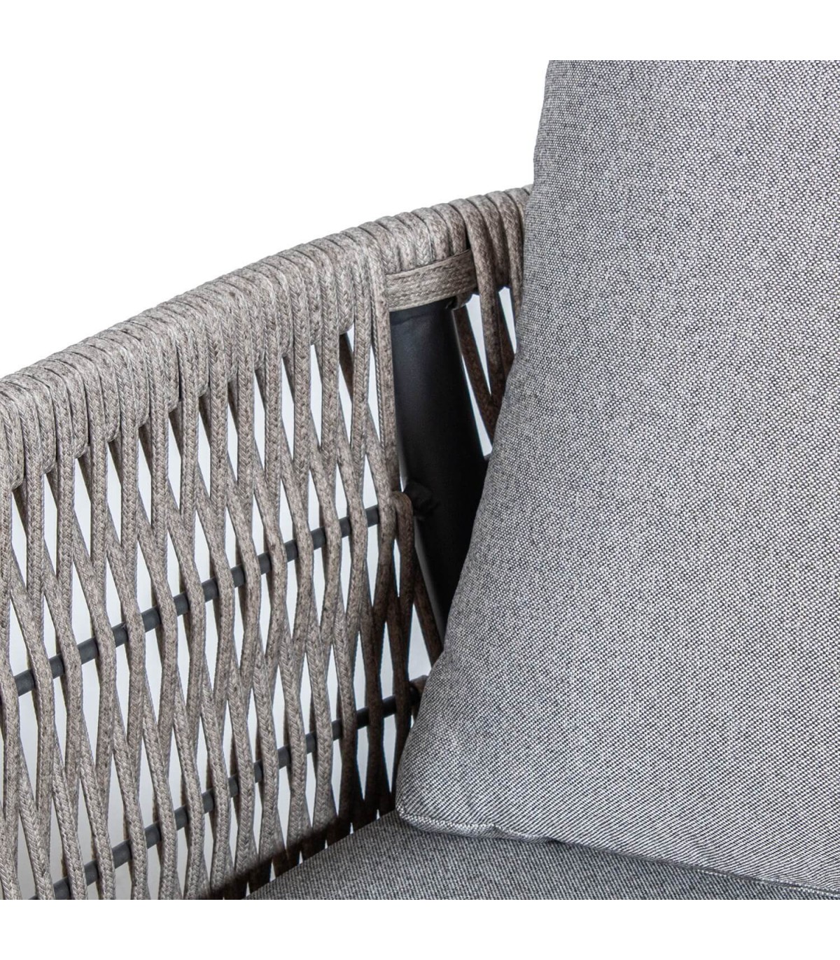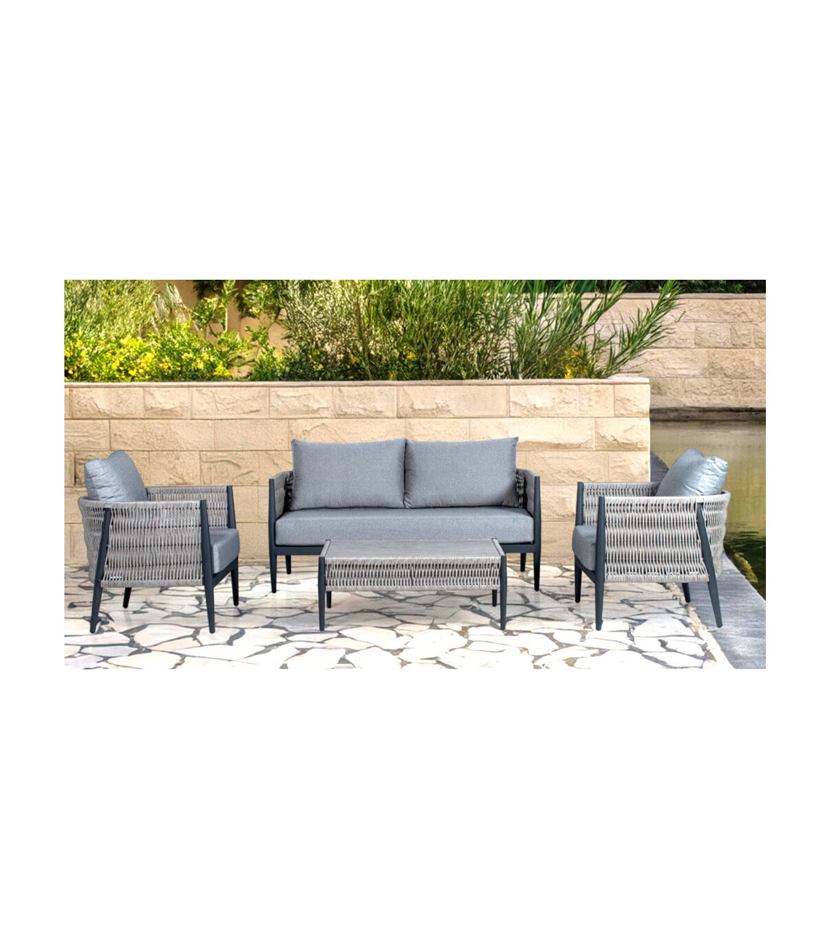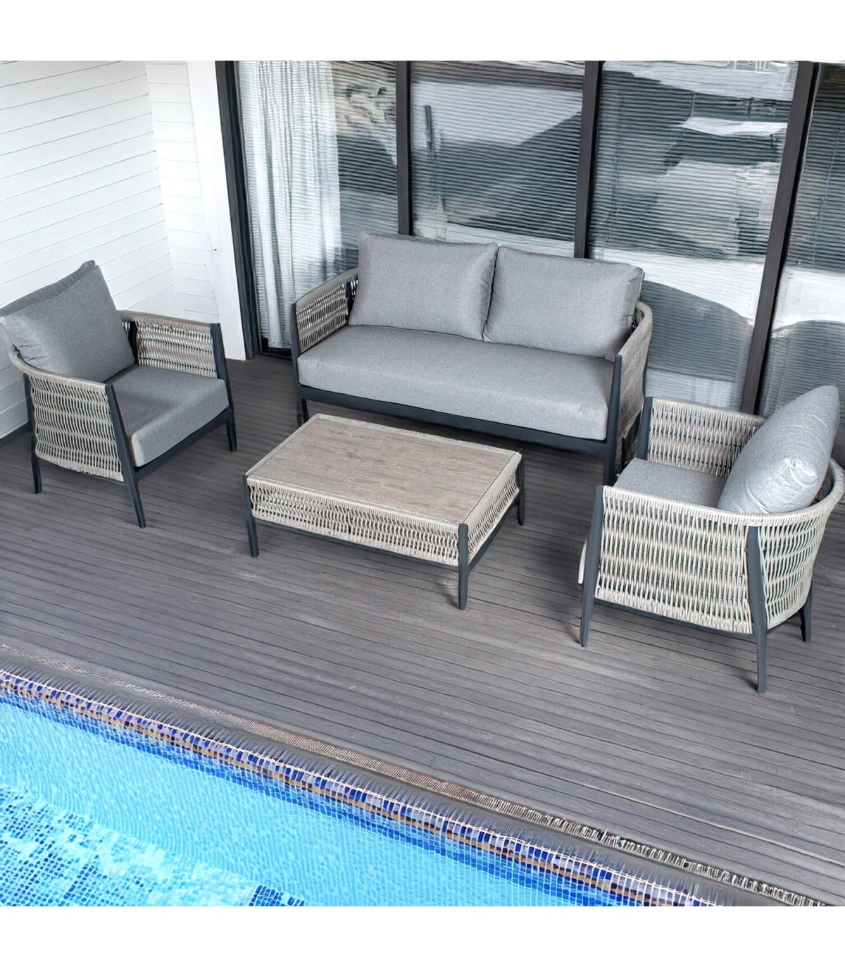 Set de 4 piezas para el jardín, sofá, 2 sillones y mesa de centro, realizado en aluminio color negro, recubrimiento lateral y trasera en ratán efecto cuerda natural, cojines desenfundables en algodón color gris, tapa de la mesa de centro en cerámica a juego imitación madera., una conjunto resistente y cómodo que encaja bien en ambientes contemporáneos. Para exteriores, hogar o para hostelería.
