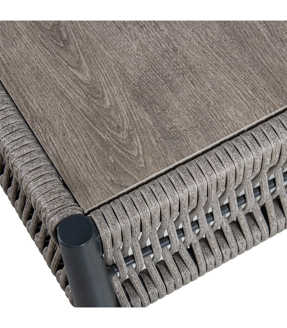 - Acabado, artesanal, estructura de aluminio color negro, recubrimiento lateral y trasera en ratán efecto cuerda natural, cojines desenfundables en algodón color gris, tapa de la mesa de centro en cerámica a juego imitación madera.