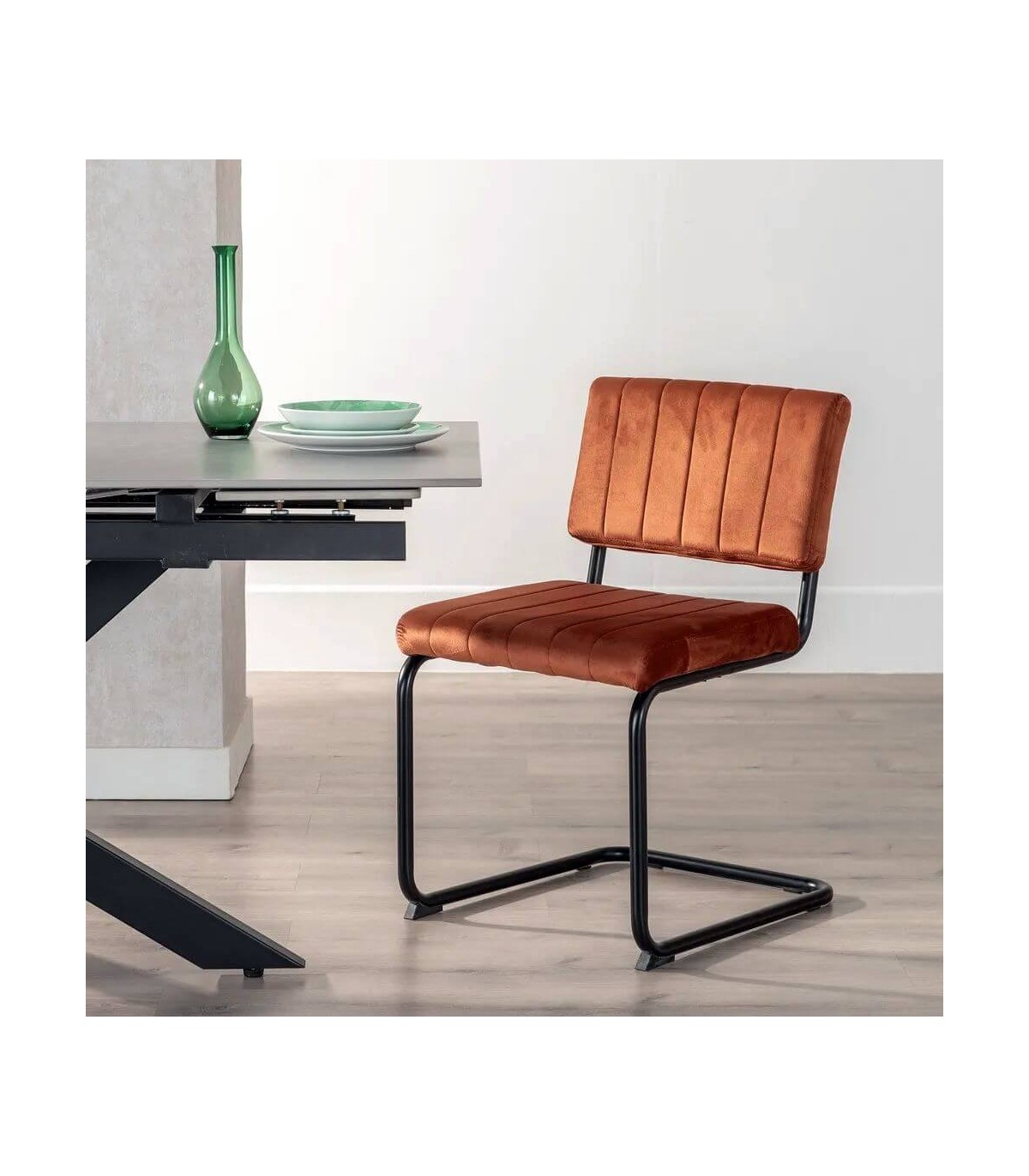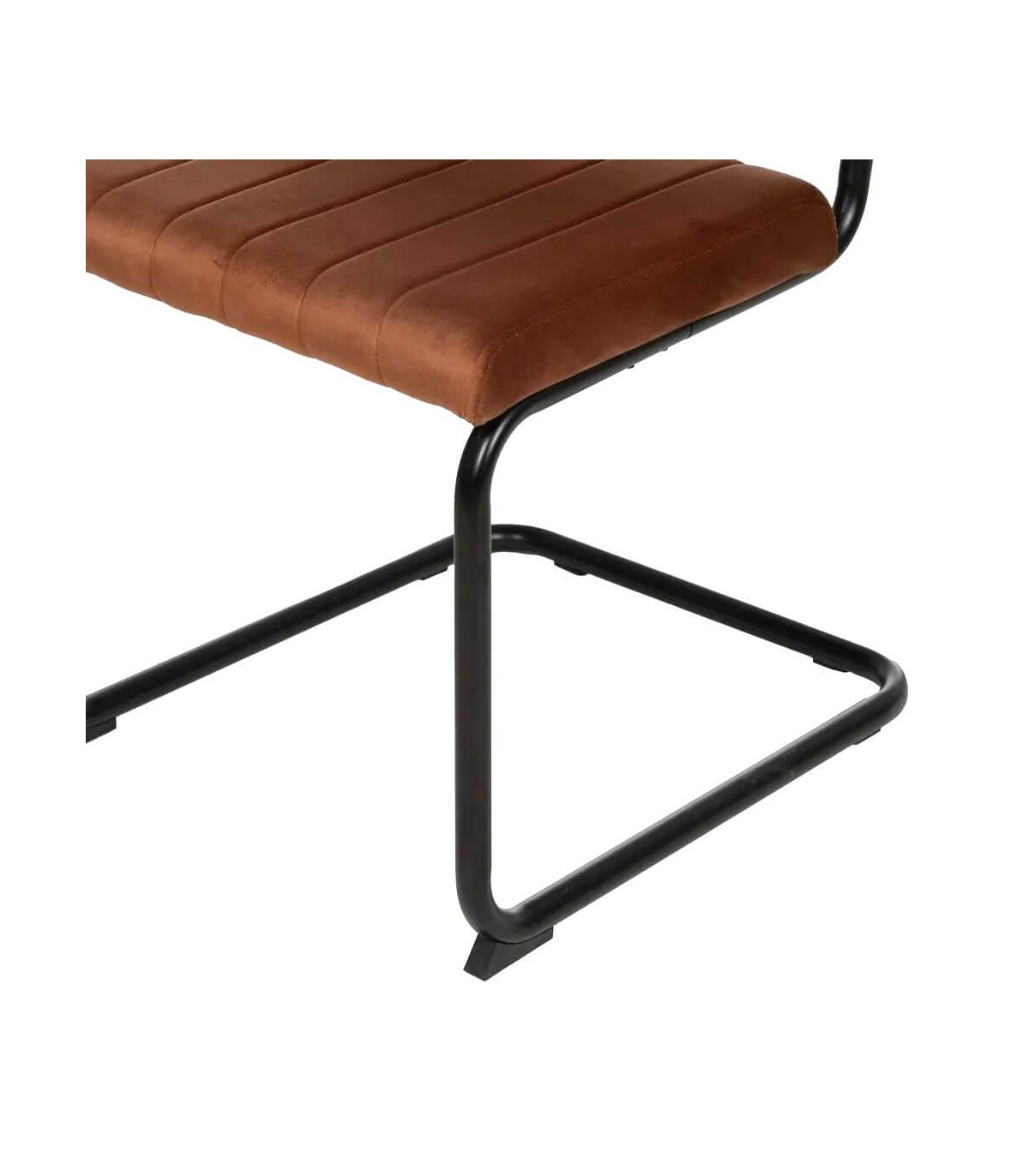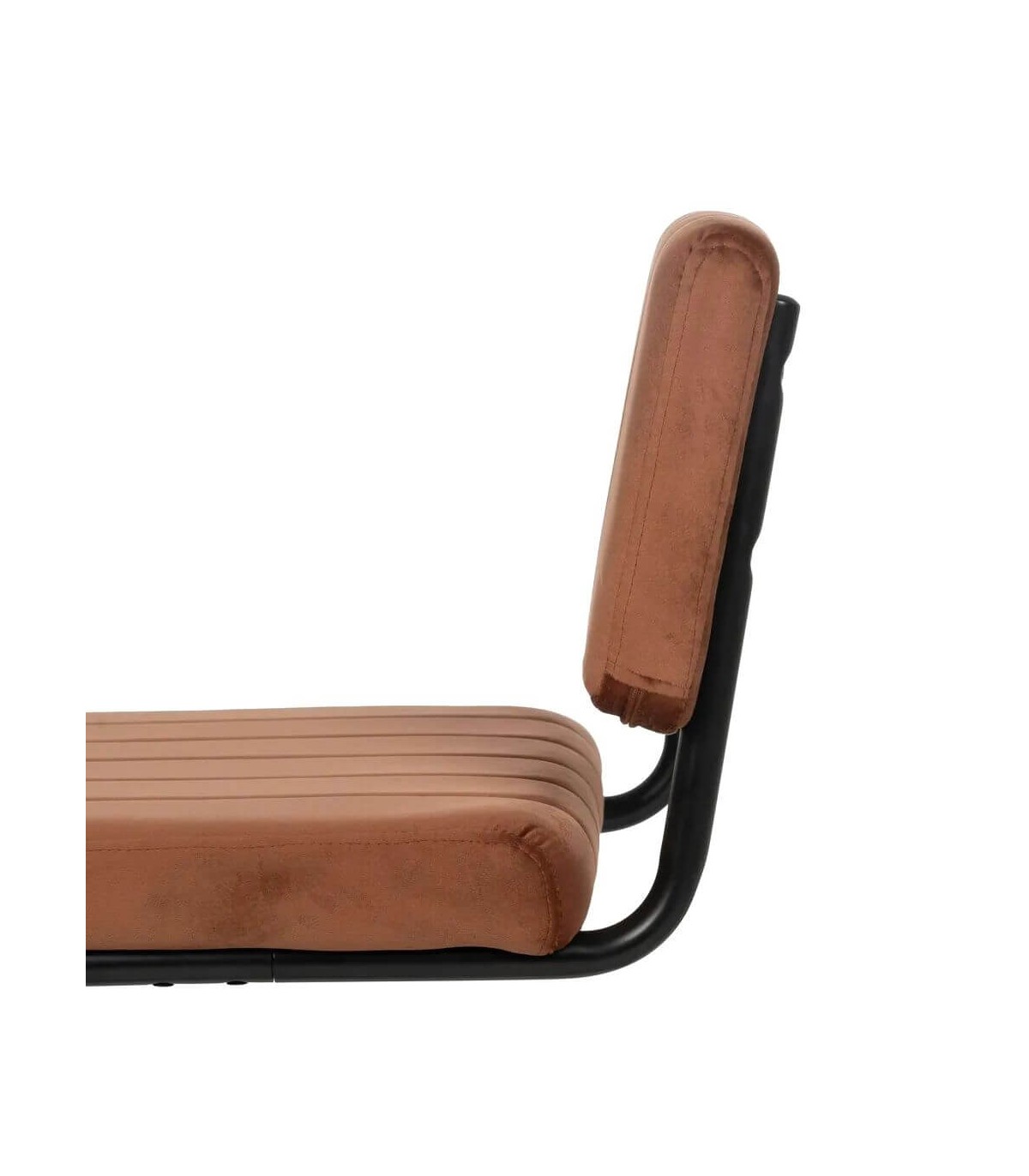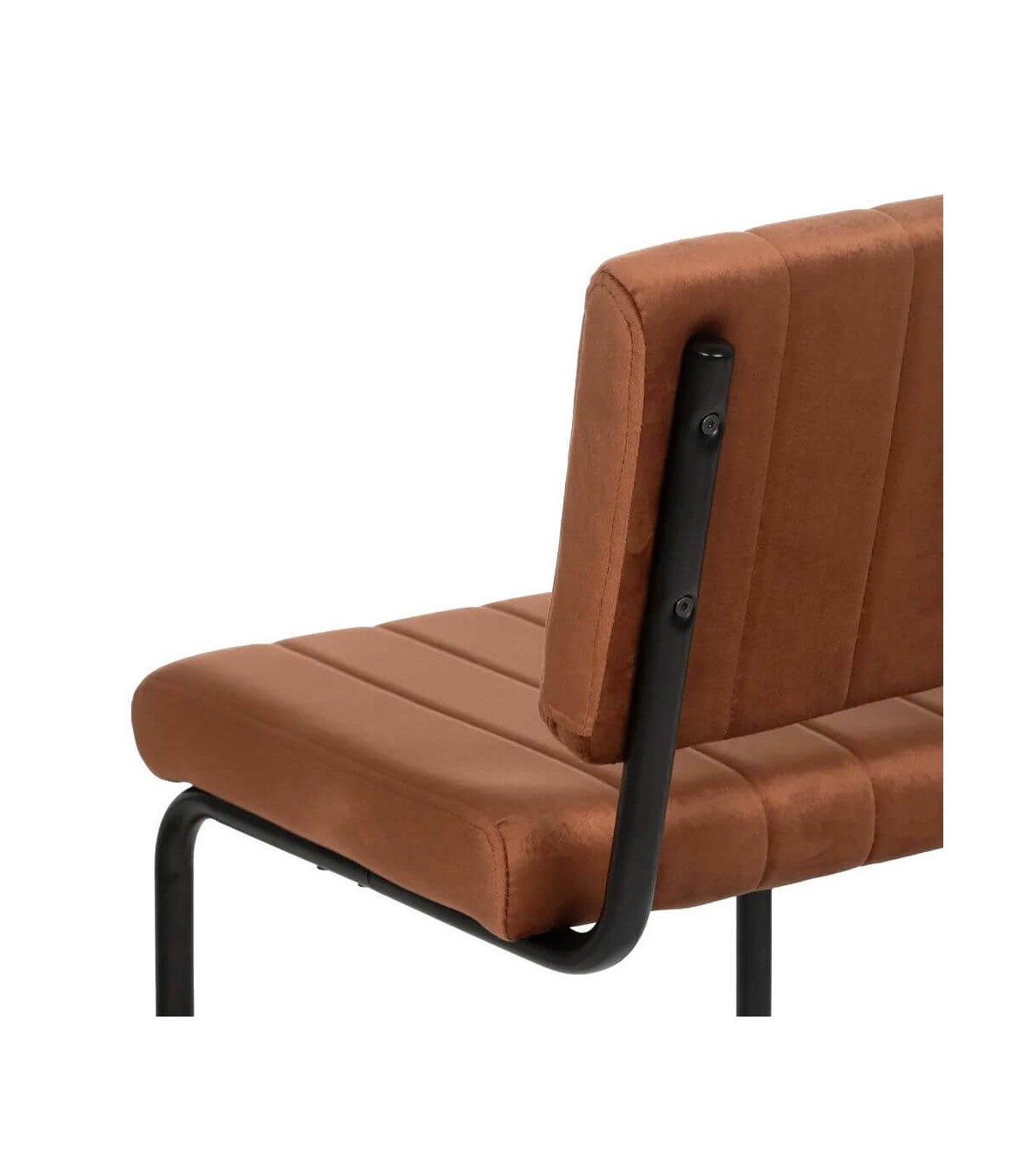 Silla realizada en metal negro con el asiento y el respaldo tapizado en color terracota, de diseño contemporáneo, muy cómoda al ser una estructura no rígida, muy práctica a la hora de la limpieza.