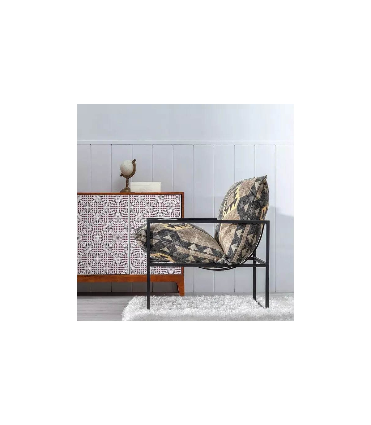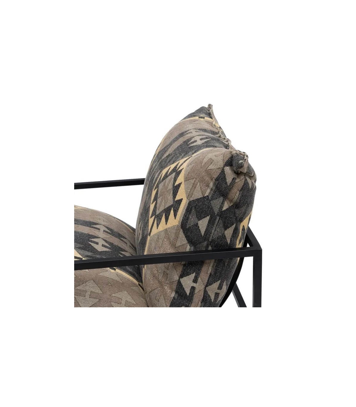 Sillón muy original con la tela pintada a mano con diseño de kilim en tonos amarillos negros y topo, un sillón que le dará un toque elegante y diferente a tu decoración.