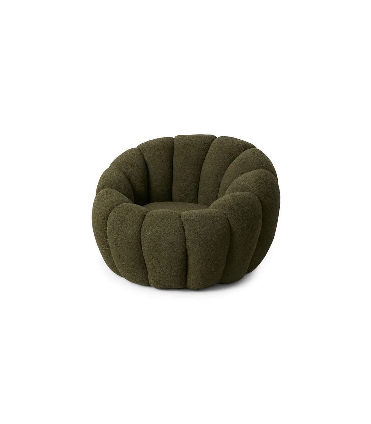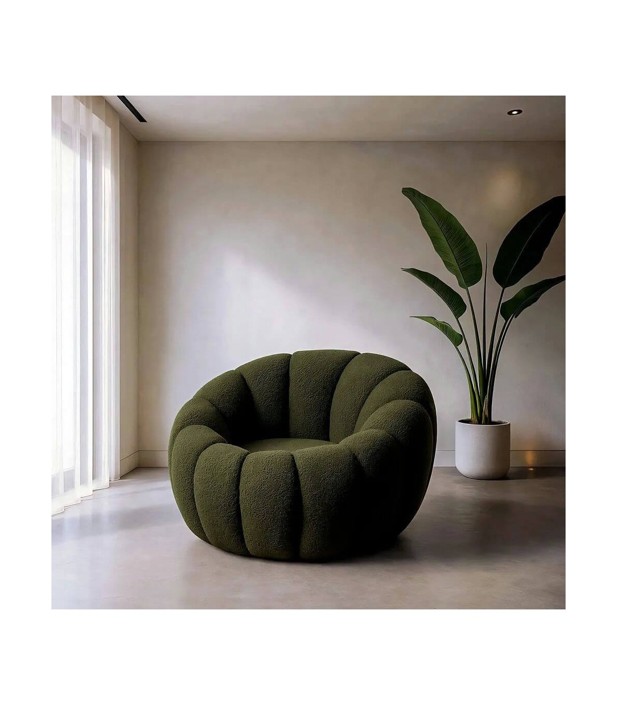 Este sillón envolvente de líneas redondeadas aporta sofisticación y comodidad a cualquier estancia, reinterpretando la estética art decó en clave contemporánea. Tapizado en suave tela bouclé verde, su textura cálida invita al descanso mientras su forma orgánica abraza el cuerpo con firmeza y ligereza.