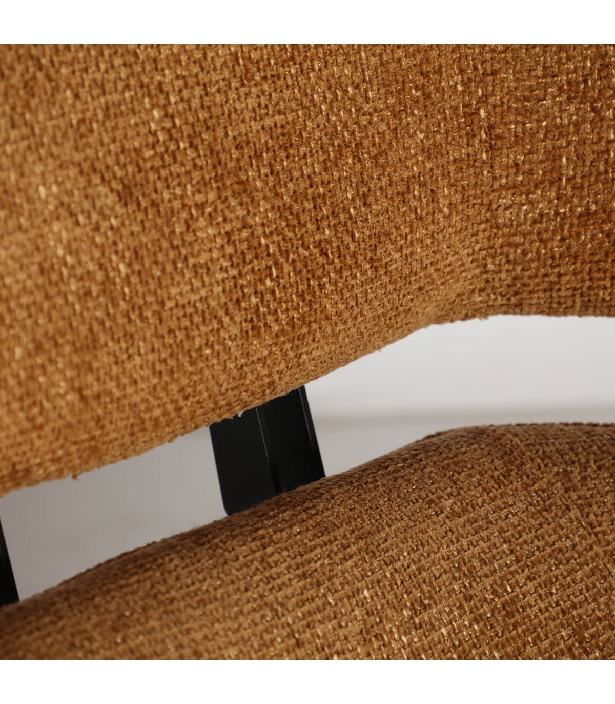 Acabado, tela chenilla color mostaza, patas en metal negro.