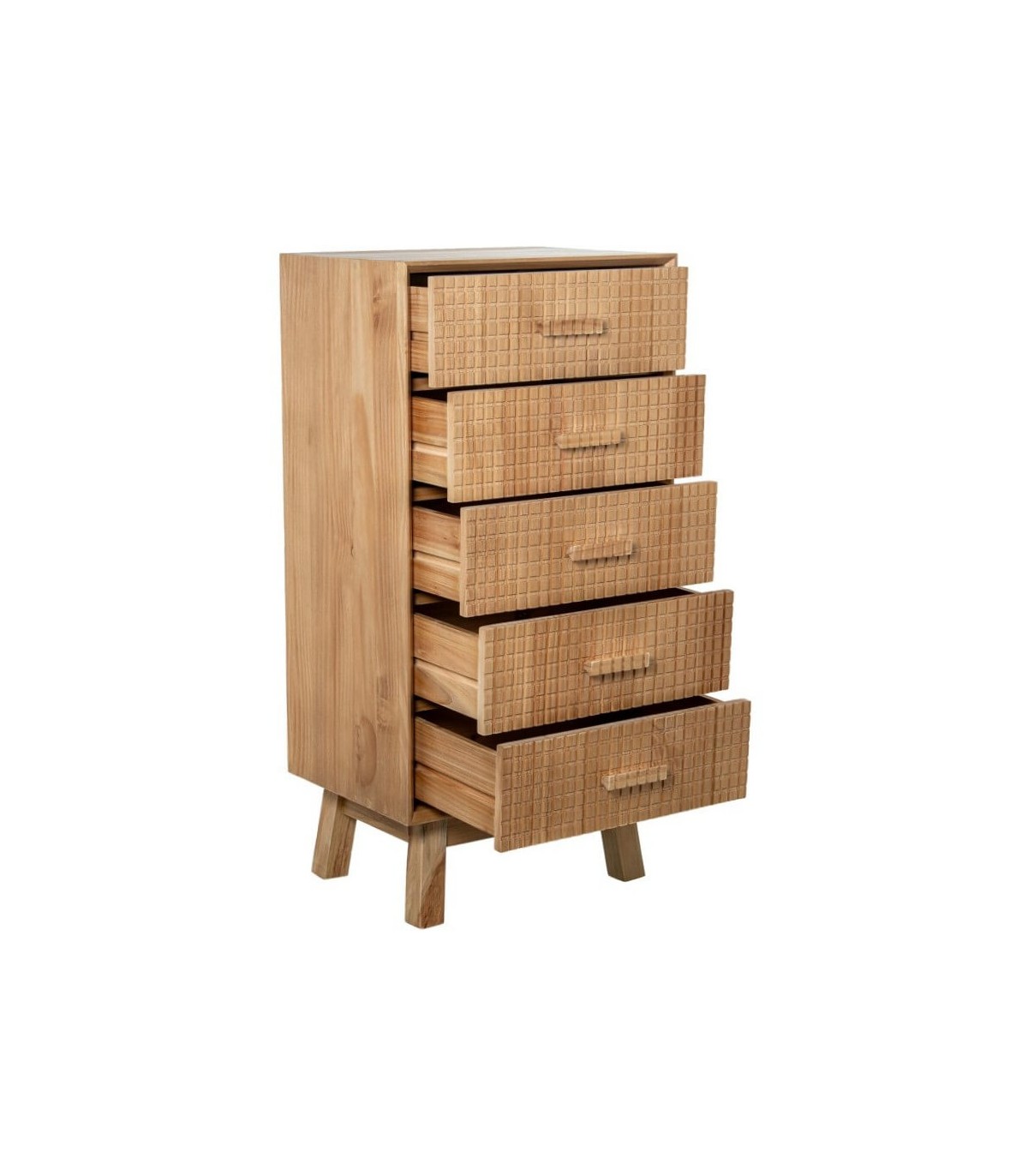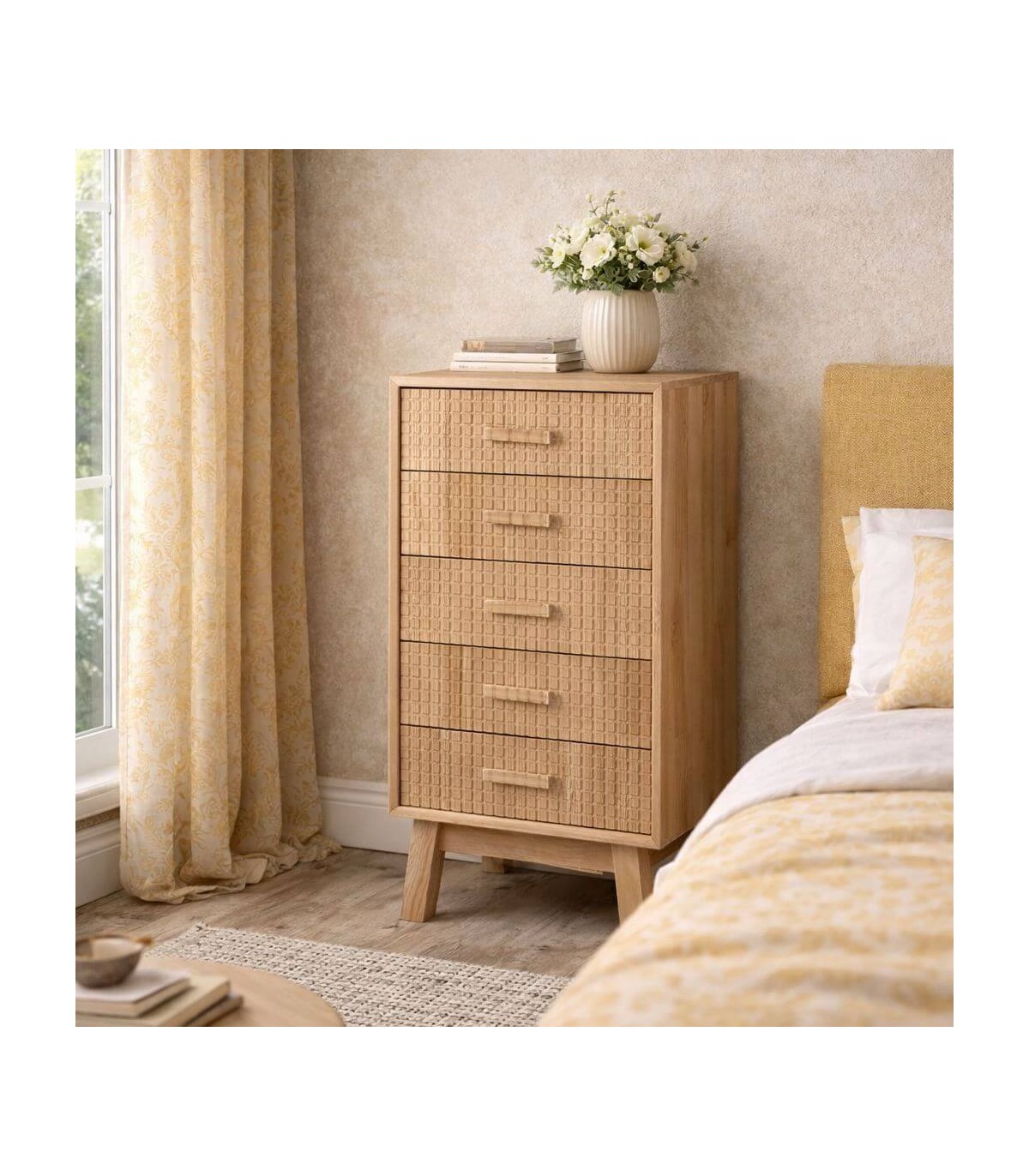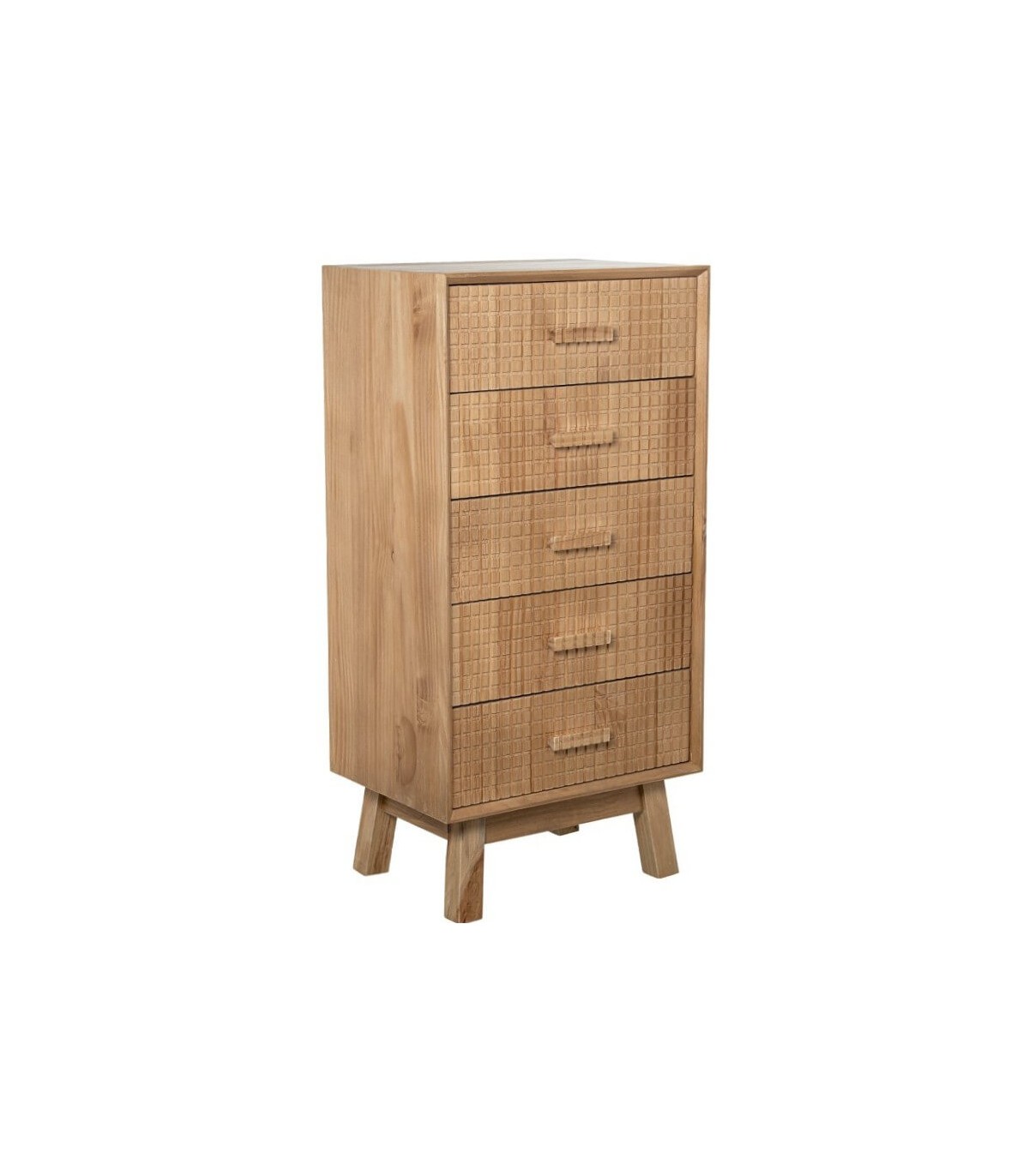 Inspirado en la sencillez y la calma de los interiores nórdicos, este sinfonier aporta orden y ligereza al dormitorio. La madera de pino ofrece una estructura sólida y un tacto natural. Sus cinco cajones permiten organizar el almacenamiento vertical sin recargar visualmente el espacio.