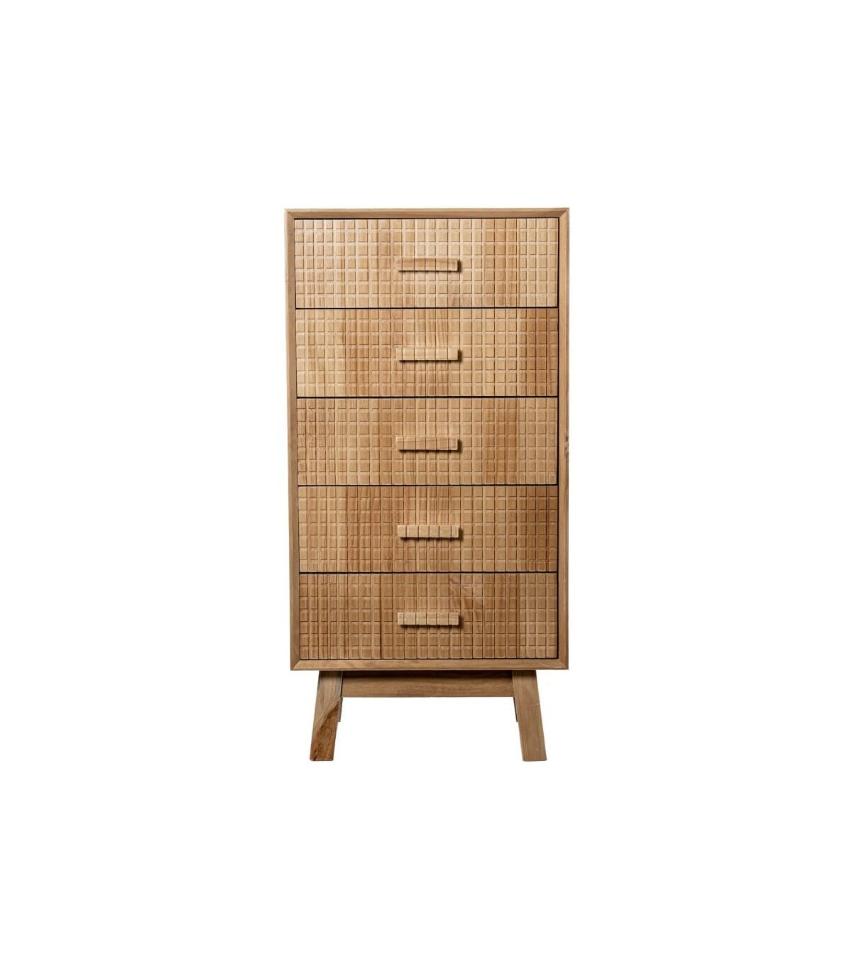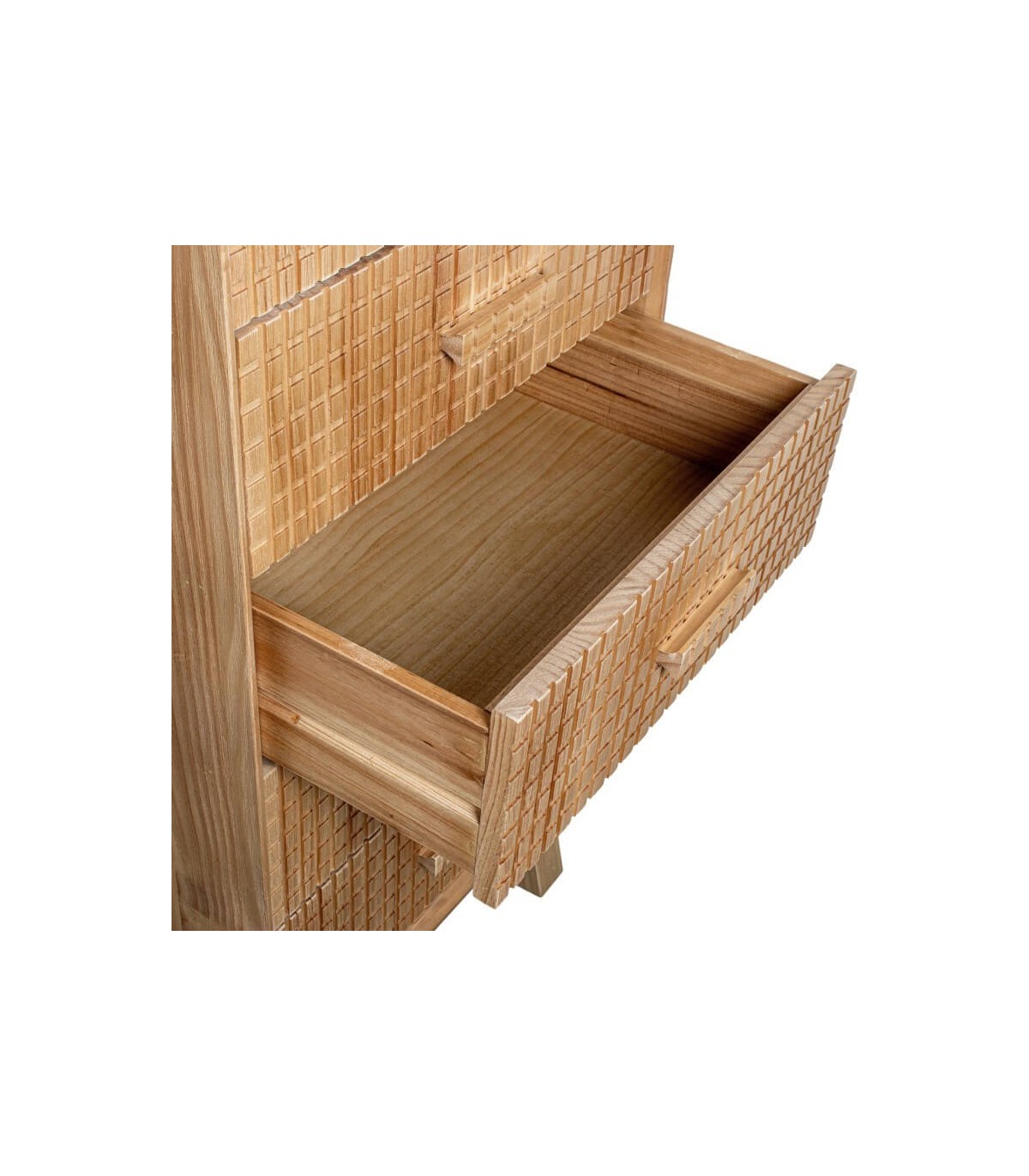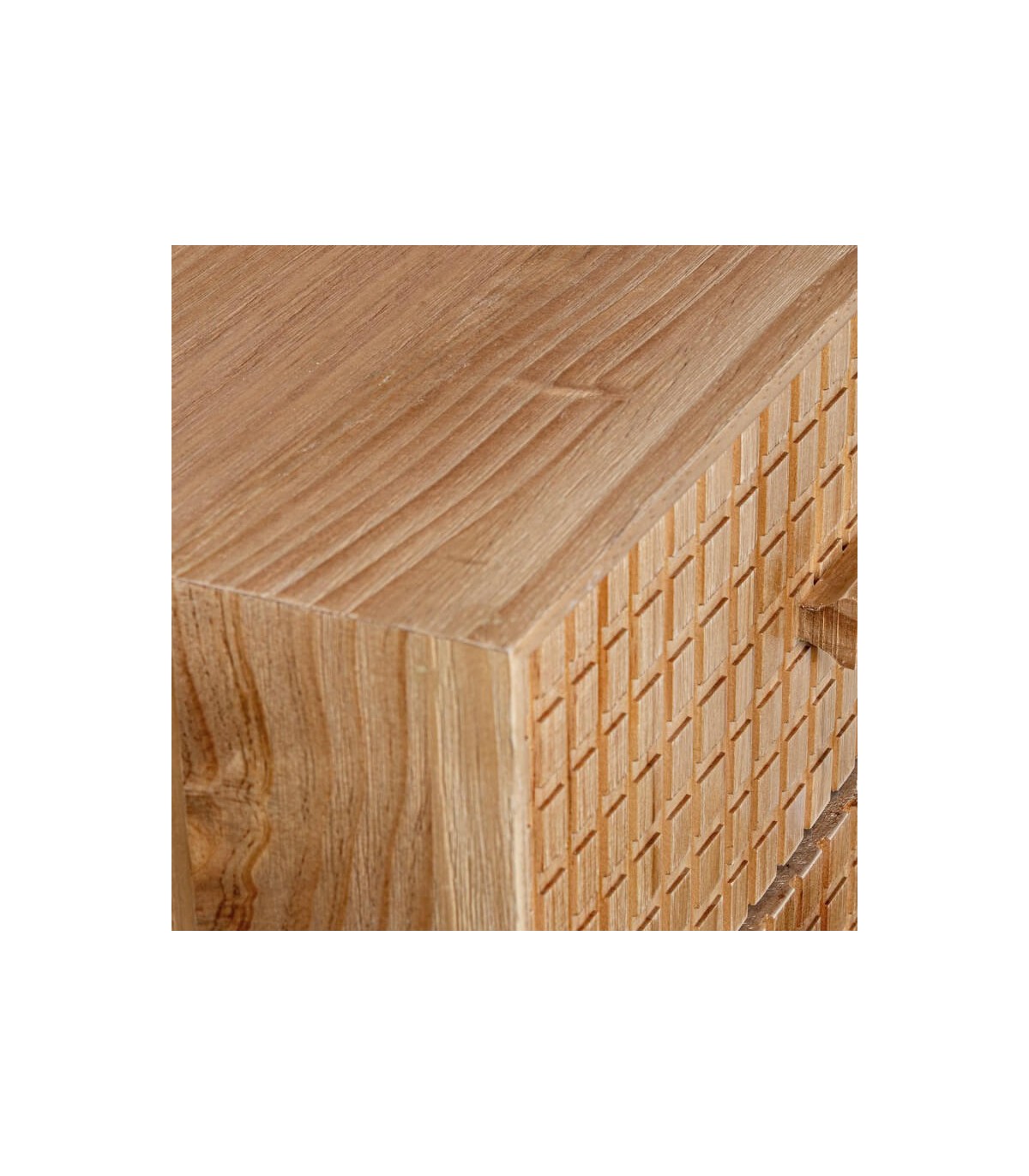 El tallado frontal añade textura y carácter manteniendo una estética equilibrada. El acabado en madera natural realza las vetas y la autenticidad del material. Una pieza pensada para integrarse con armonía en dormitorios luminosos y funcionales.