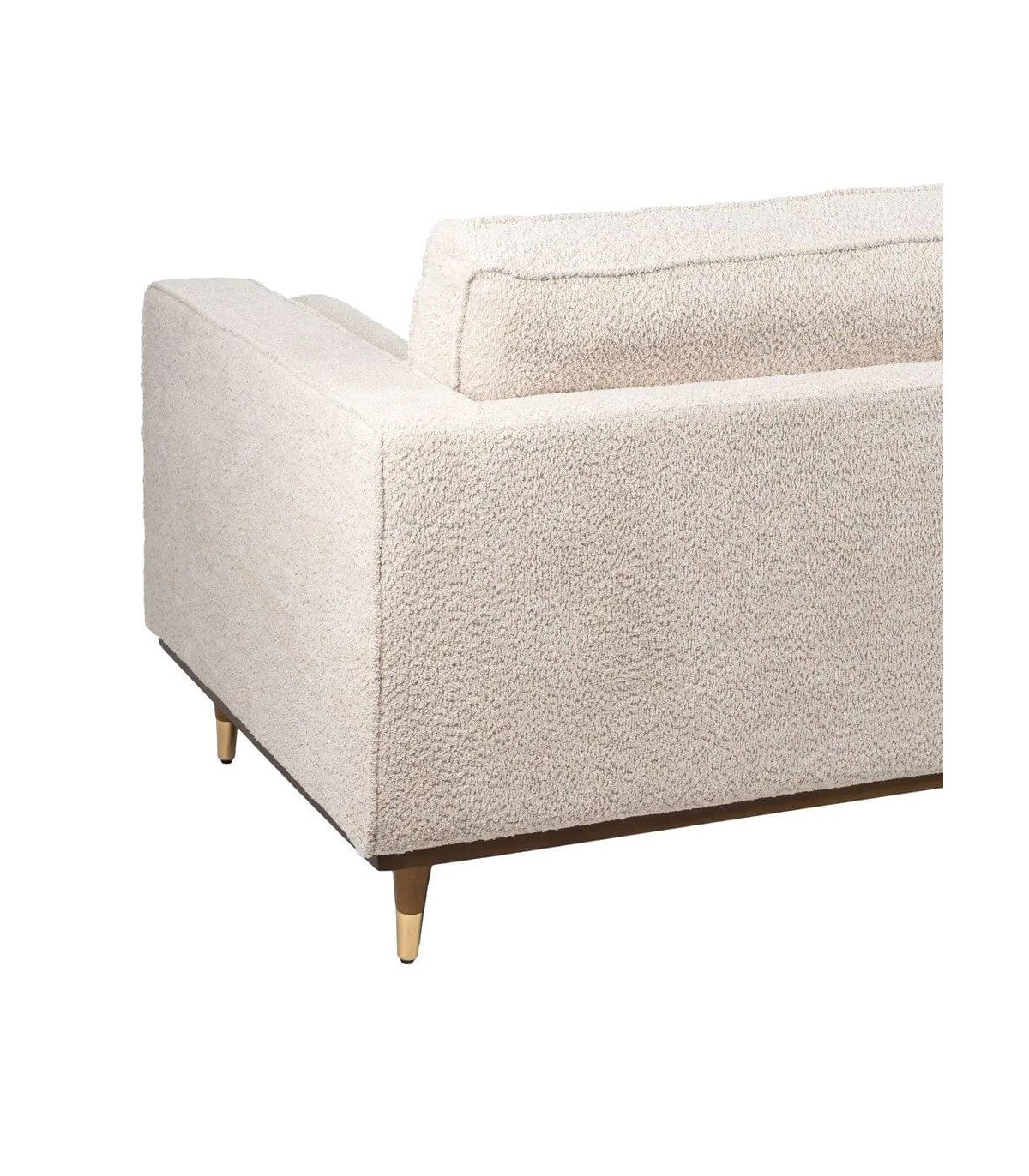 La tapicería blanca tipo chenilla jaspeada resalta por su textura suave y sus acabados con vivos, que elevan su sofisticación. Las patas cónicas en madera color nogal, rematadas con detalles dorados, completan un conjunto armónico y de gran presencia visual. Ideal para ambientes serenos, luminosos y contemporáneos con toques cálidos y refinados.