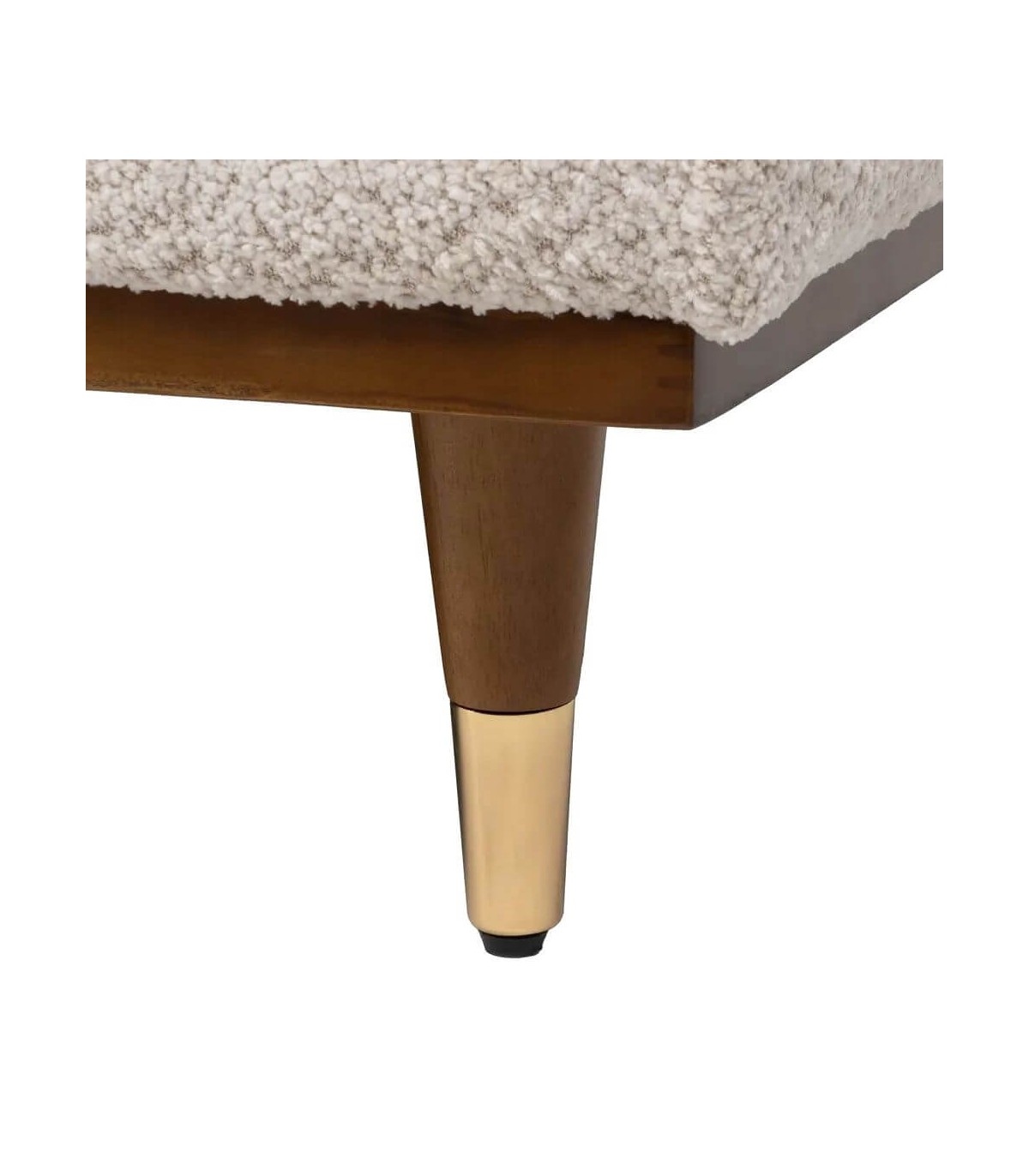🎨 Acabado: Tela jaspeada tipo chenilla color blanco roto, rematada con vivos, patas en madera color nogal con detalles en metal dorado
