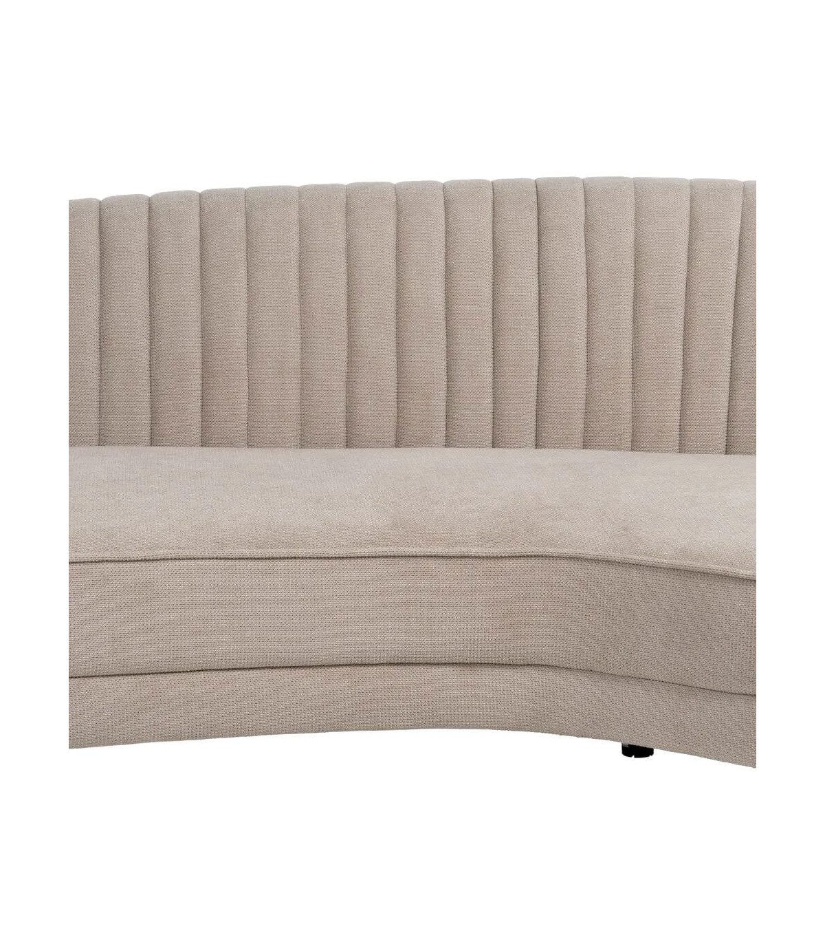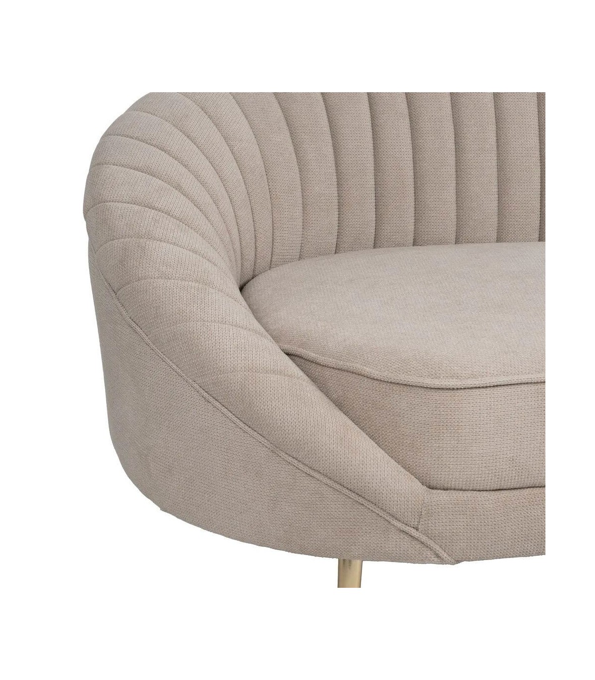 Diseño curvo envolvente con respaldo canalé que marca una silueta elegante y fluida. El tapizado en chenilla color topo aporta suavidad visual y un acabado cálido y sobrio. Sus patas metálicas doradas elevan el conjunto con un toque sofisticado que refuerza el aire art decó del diseño.