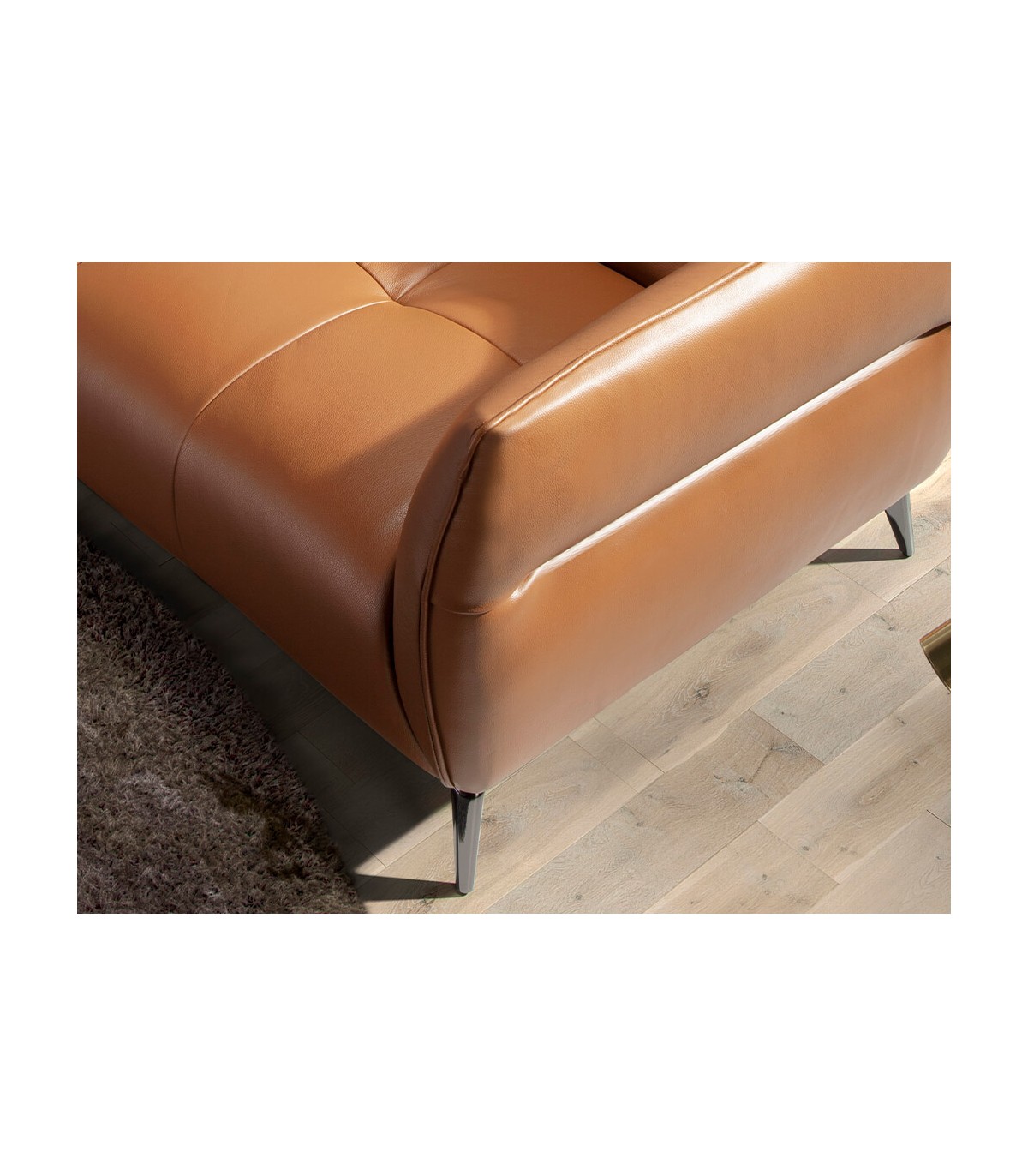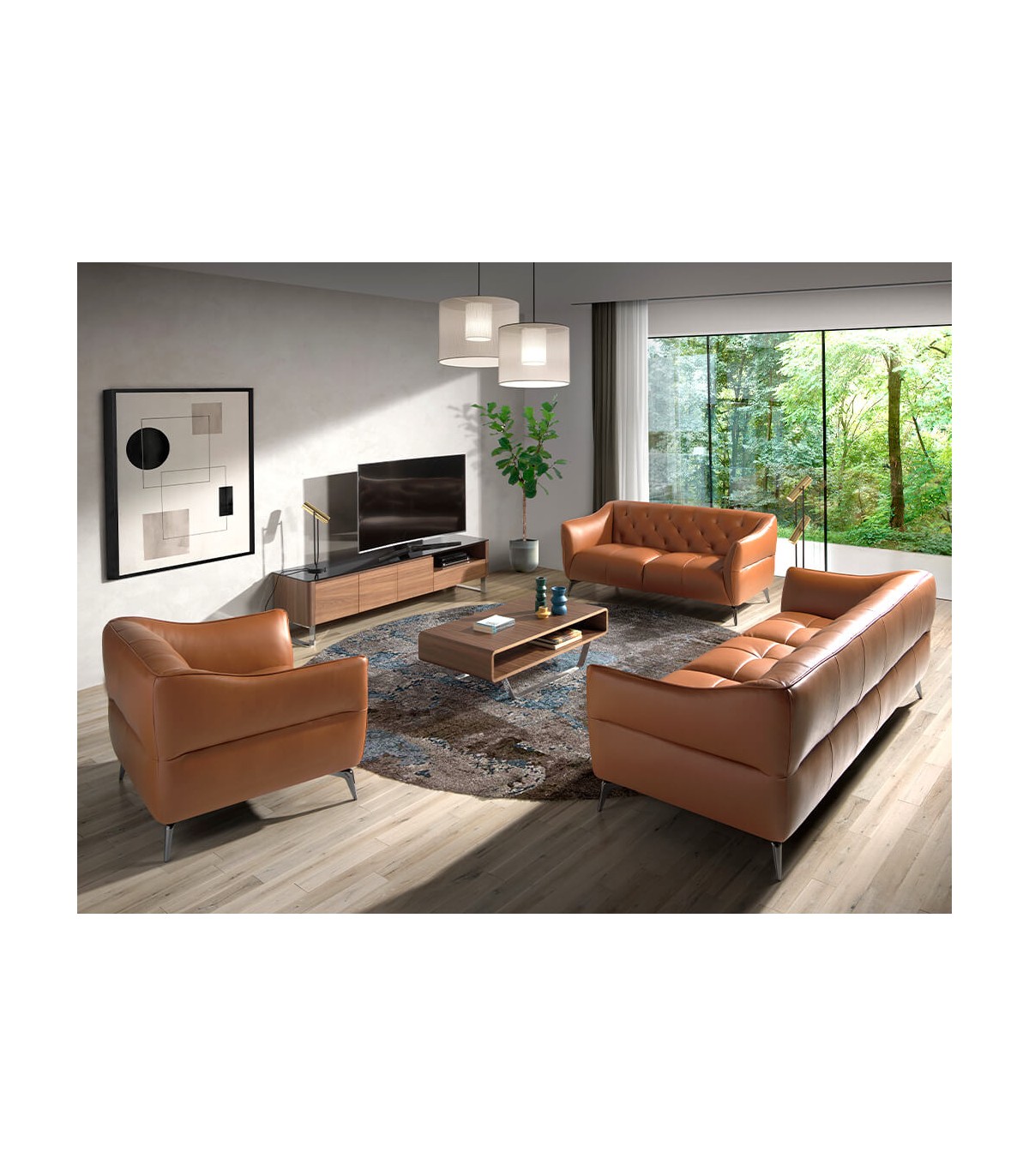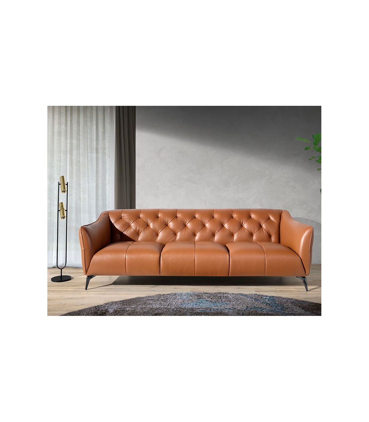 Sofá de 3 plazas grande de diseño moderno tapizado en piel marrón, con una robusta estructura y muchos detalles en su confección con efecto capitoné en el respaldo, un sofá que combina perfectamente el diseño con el confort.