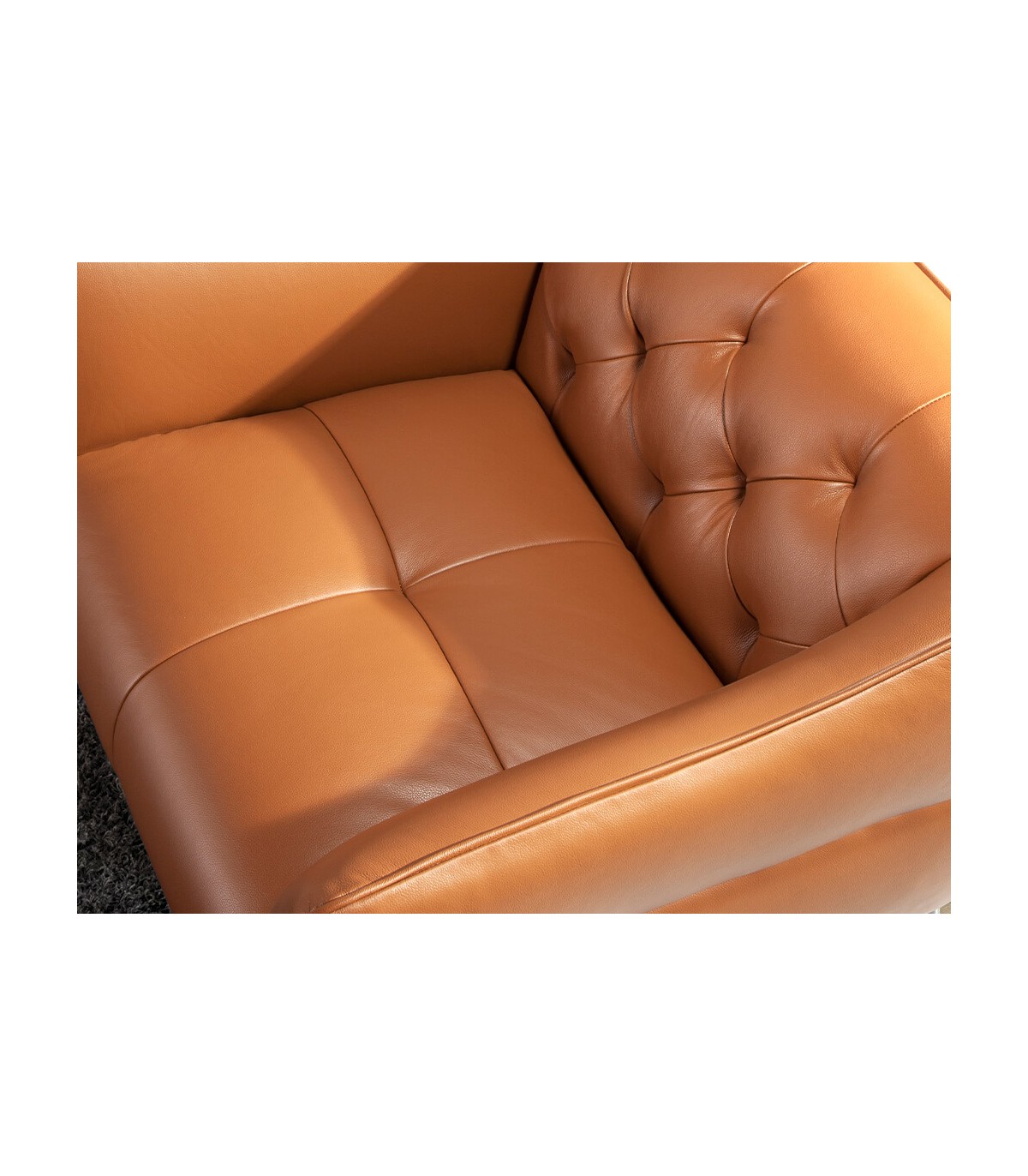 Material, estructura de pino, piel de vacuno de 1,5 mm, asiento y respaldo de espuma de poliuretano de 25 kg/m3, patas acero inoxidable.