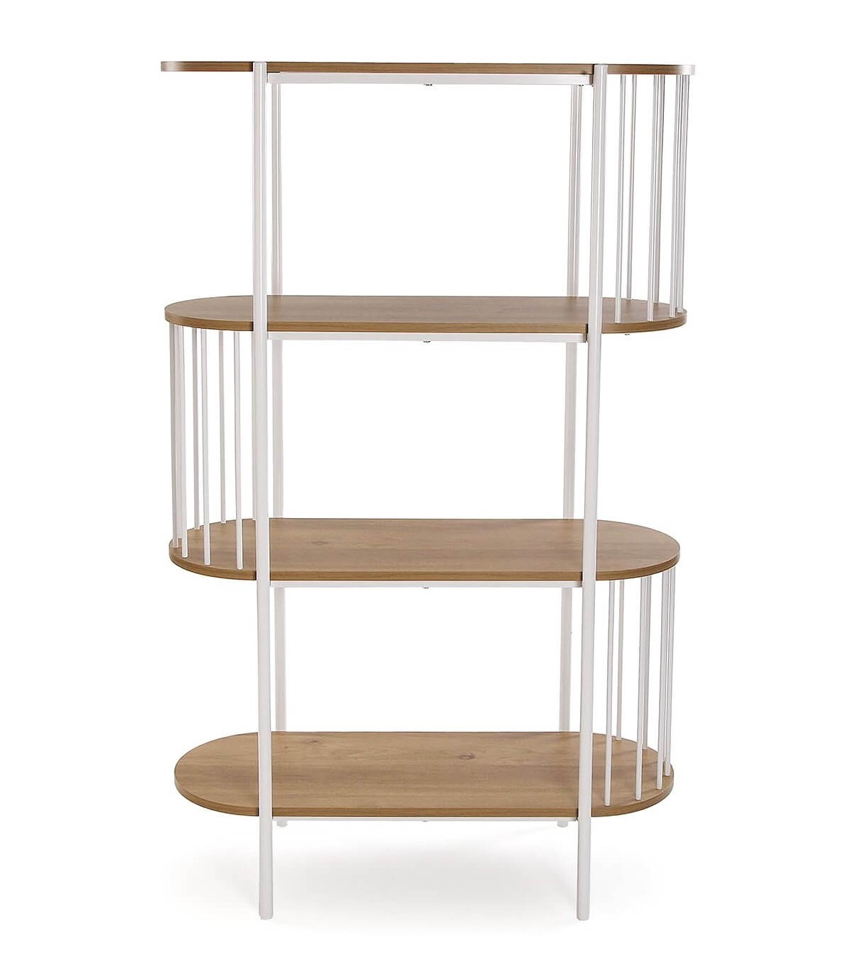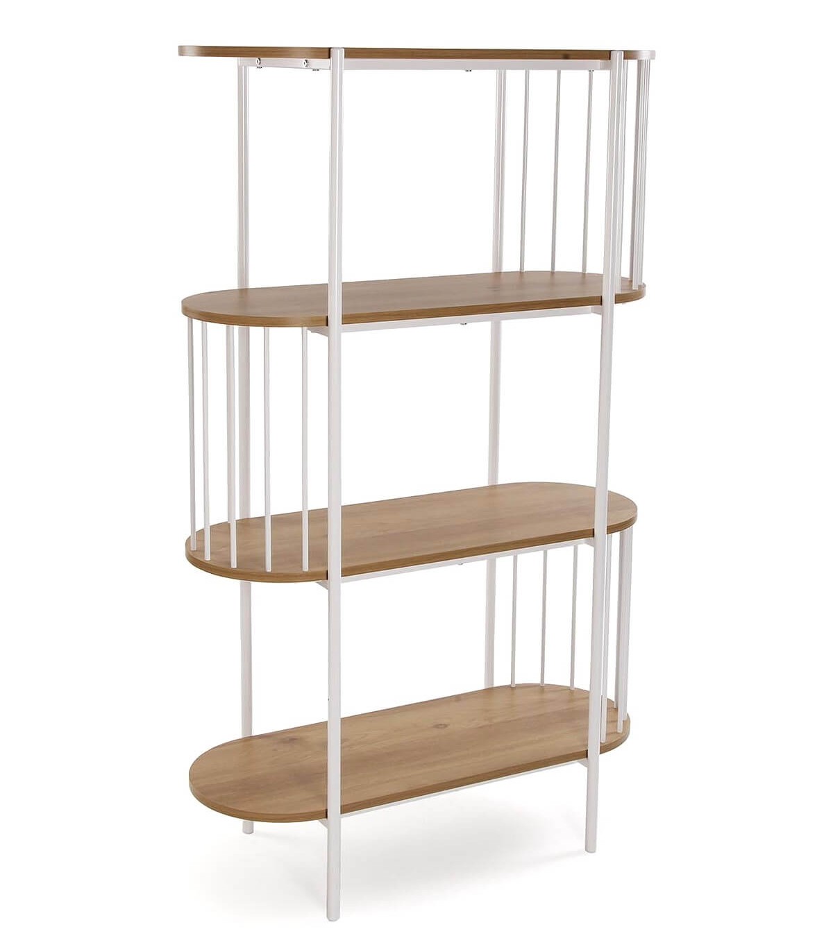 Ligereza visual y diseño funcional para espacios modernos. Esta estantería de cuatro baldas combina estructura metálica blanca con superficies en madera MDF imitación roble tostado. Su diseño curvado en los extremos laterales y los barrotes verticales aportan dinamismo y un aire escandinavo. Perfecta para salones, despachos o dormitorios donde se busca organización sin recargar el ambiente.