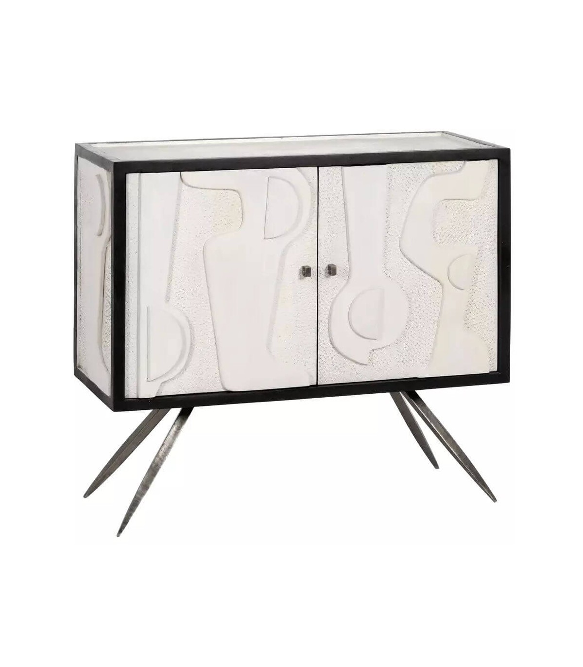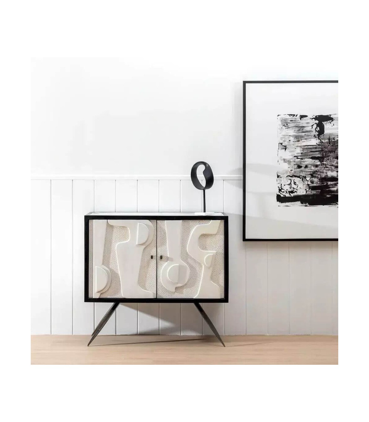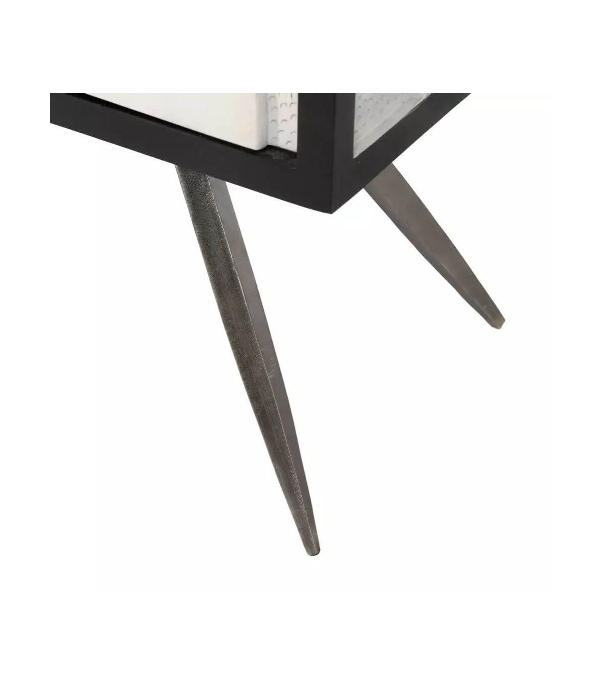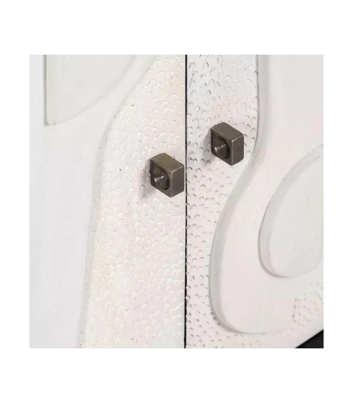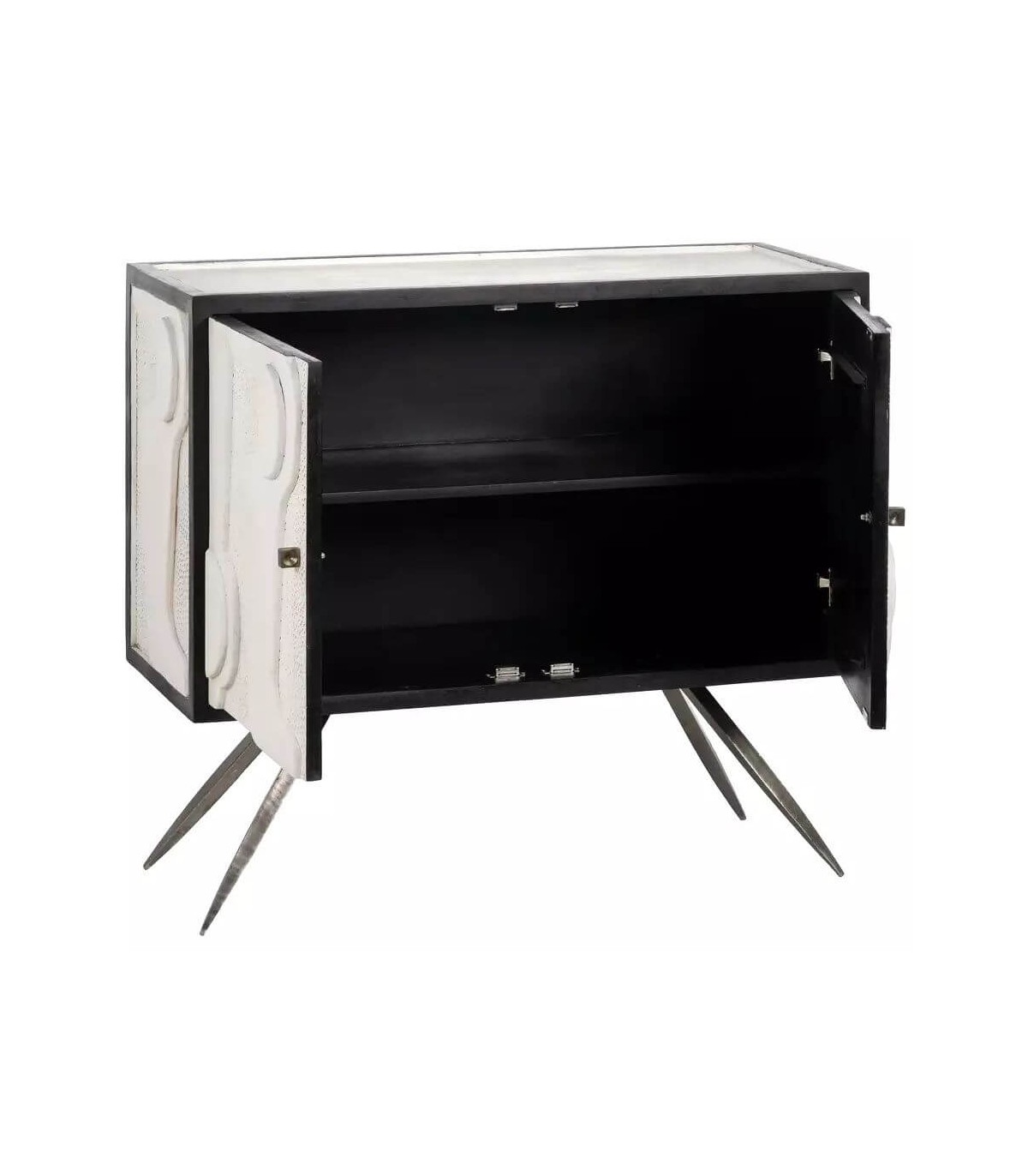 Taquillón realizado artesanalmente, con dos puertas en madera de mango talladas a mano acabadas en blanco y la estructura en metal con unas patas y tiradores muy característicos, un mueble de diseño atemporal, calidad y diseño.