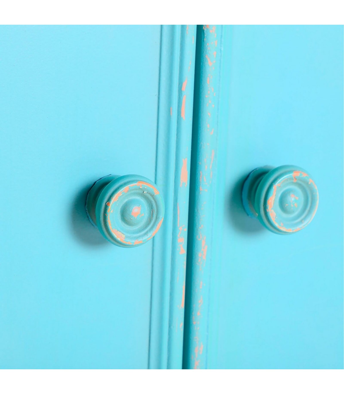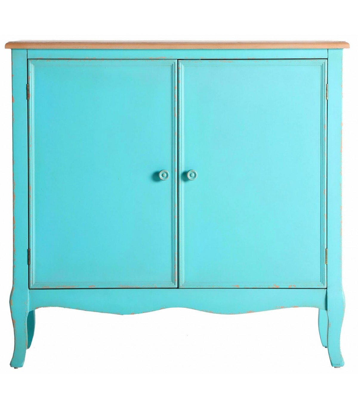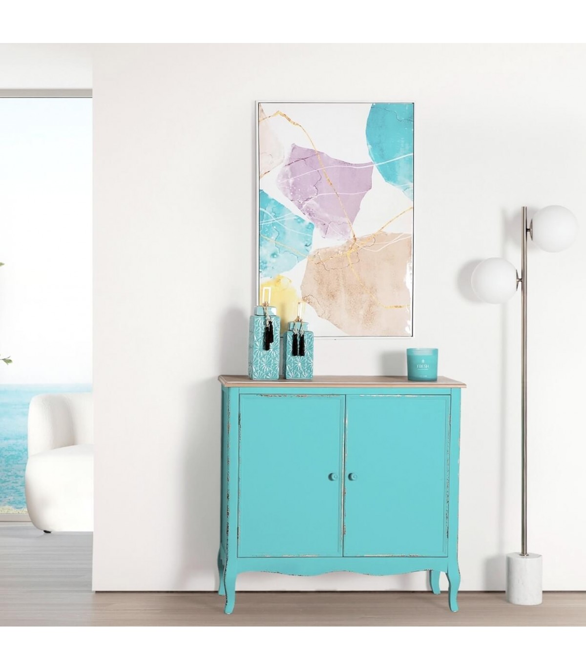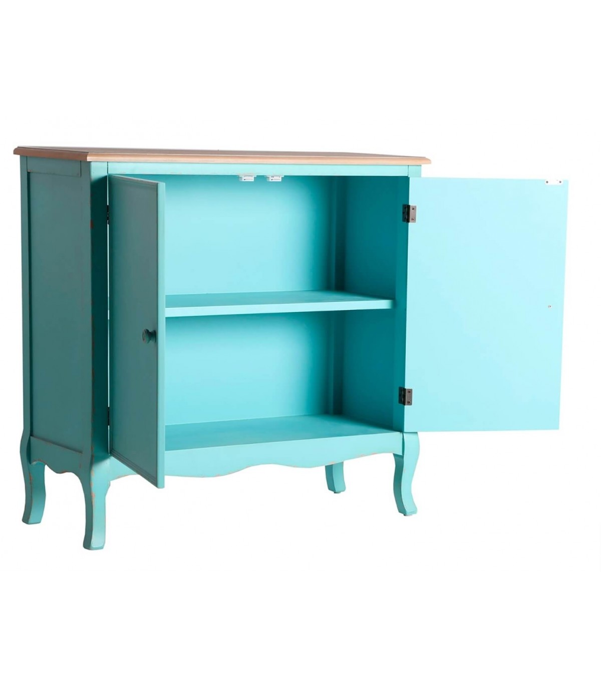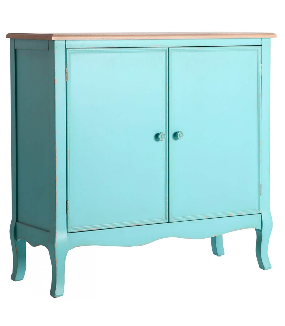 Taquillón 2 puertas realizado en madera de abeto, con la tapa en madera natural y el cuerpo acabado en azul celeste rozado, un mueble de capacidad muy luminoso que creará un bonito ambiente.