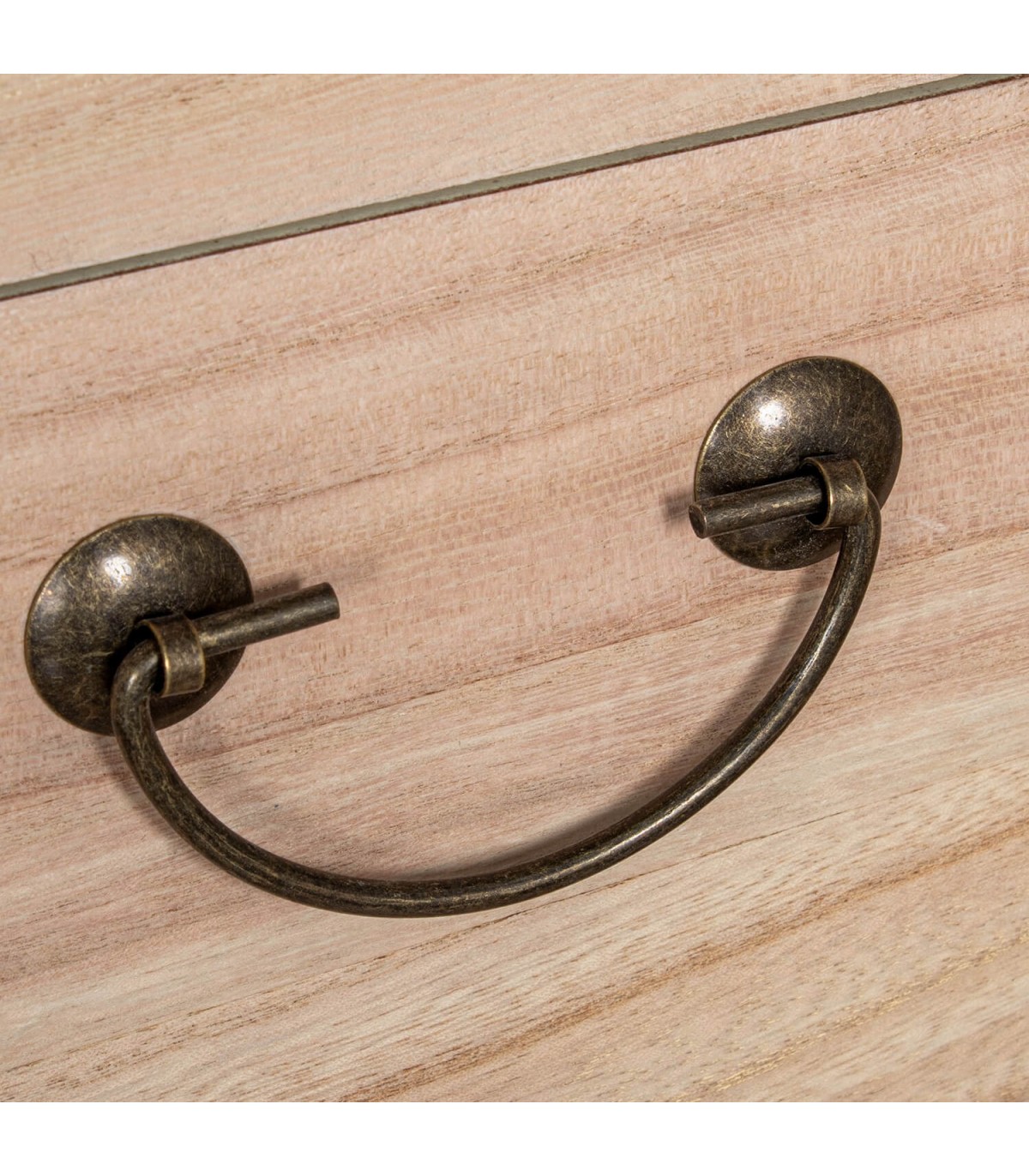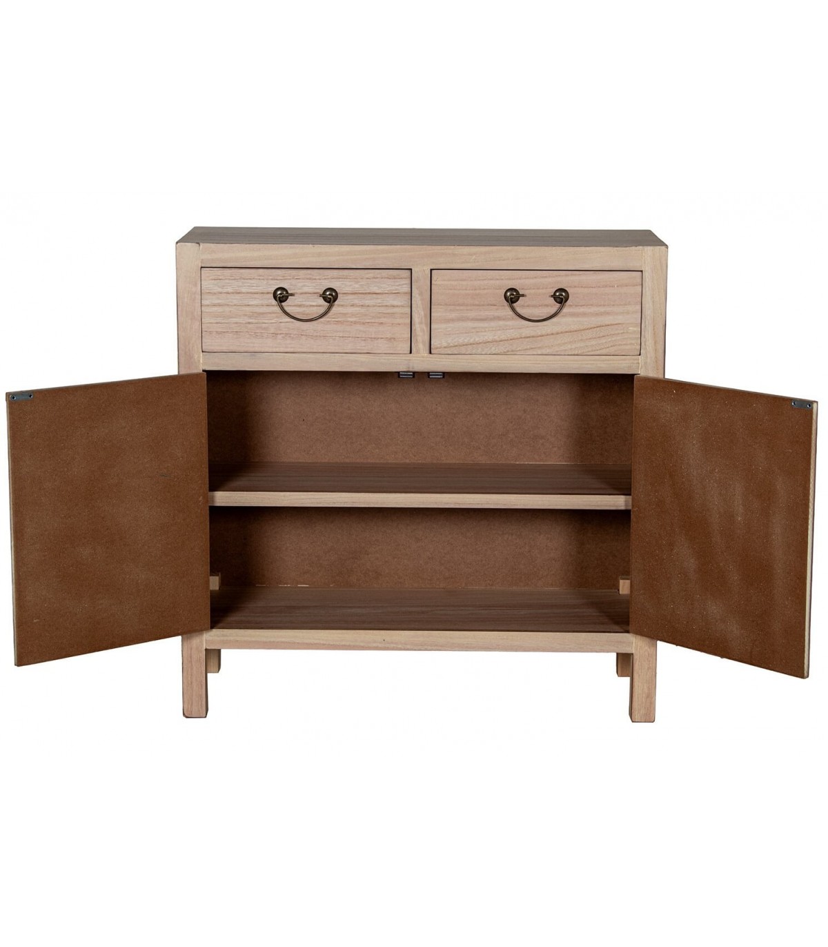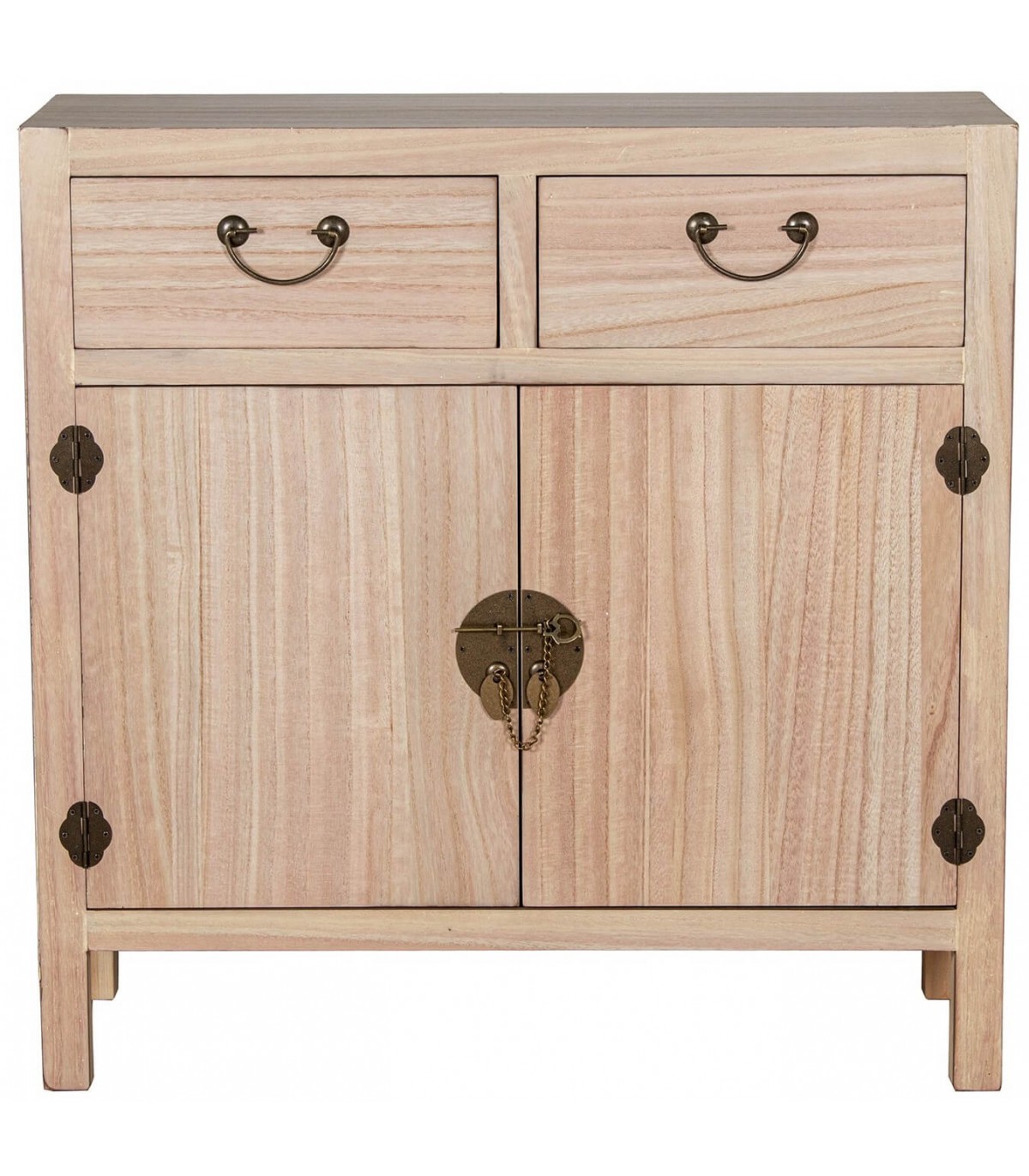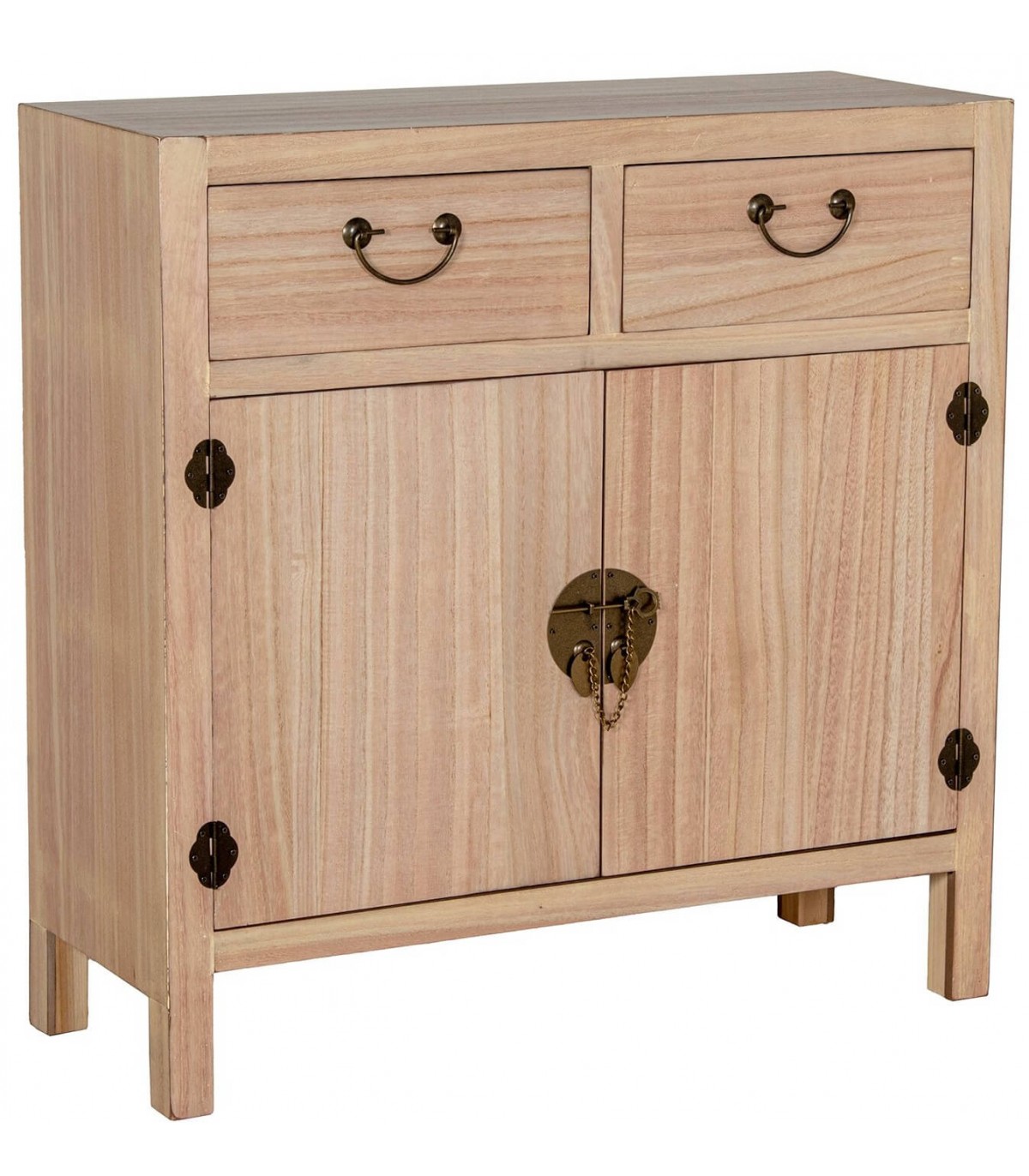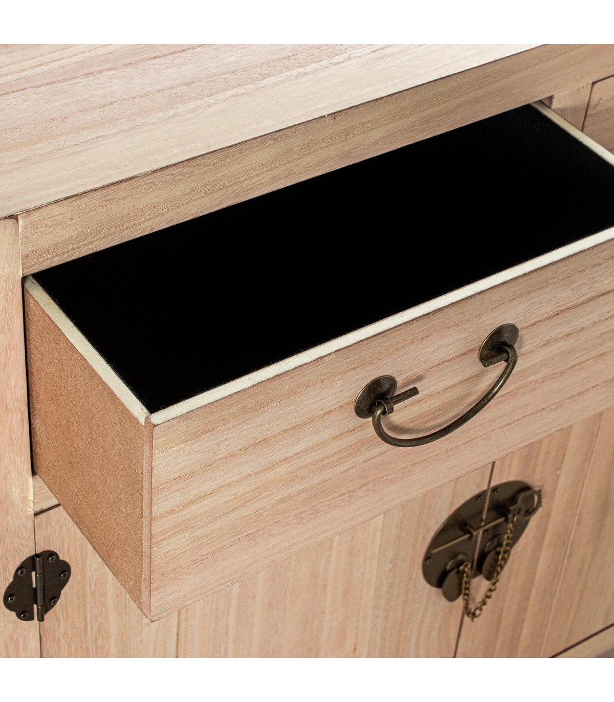 El encanto atemporal de este taquillón oriental se refleja en sus líneas puras y herrajes de bronce patinado, evocando la serenidad del mobiliario tradicional asiático. Su estructura en madera de paulonia y DM ofrece ligereza y resistencia, destacando la textura natural y los matices suaves del acabado.