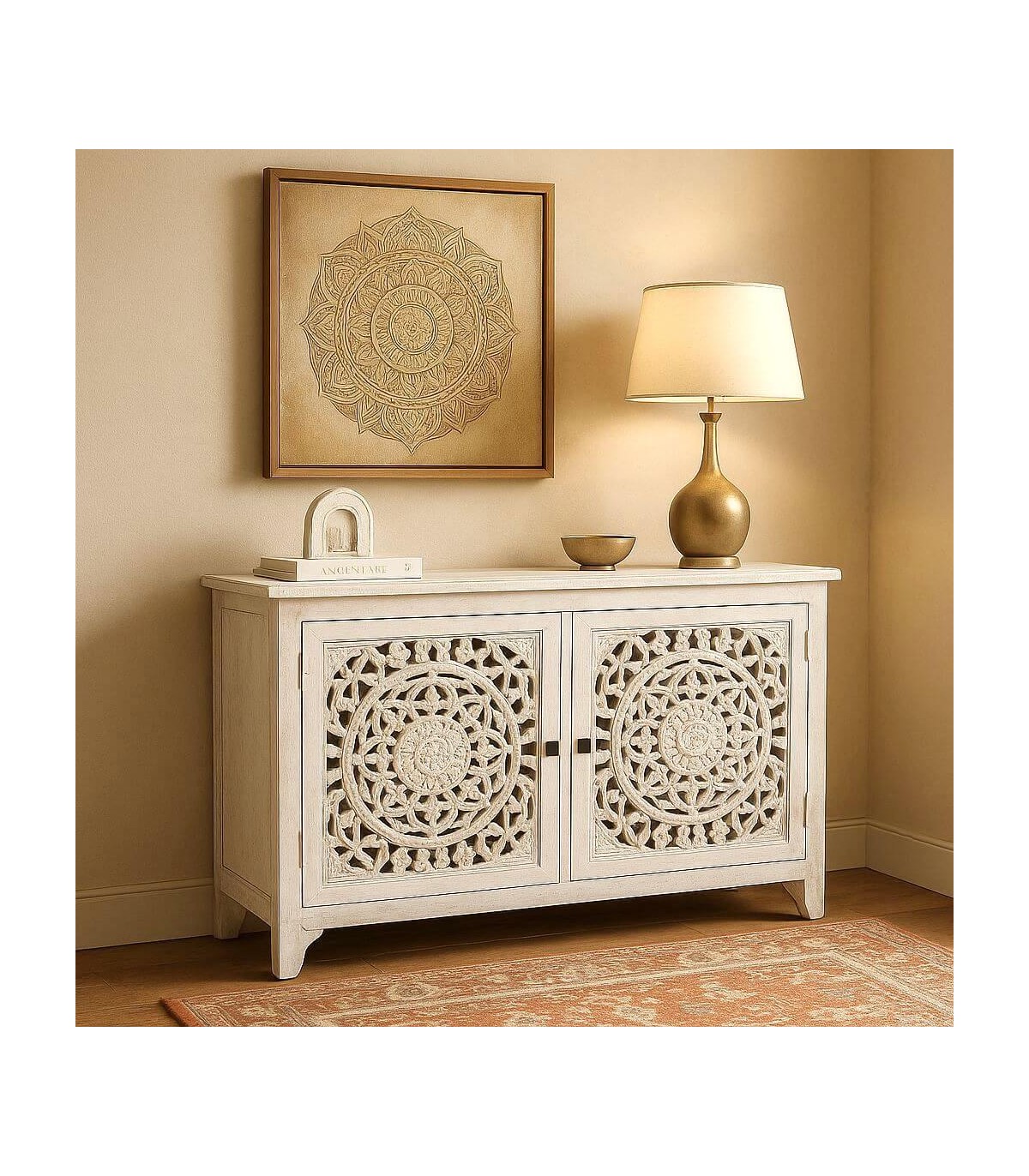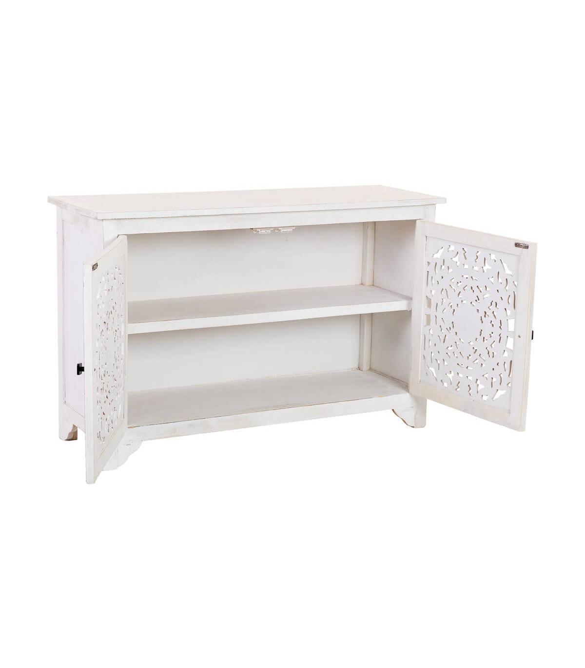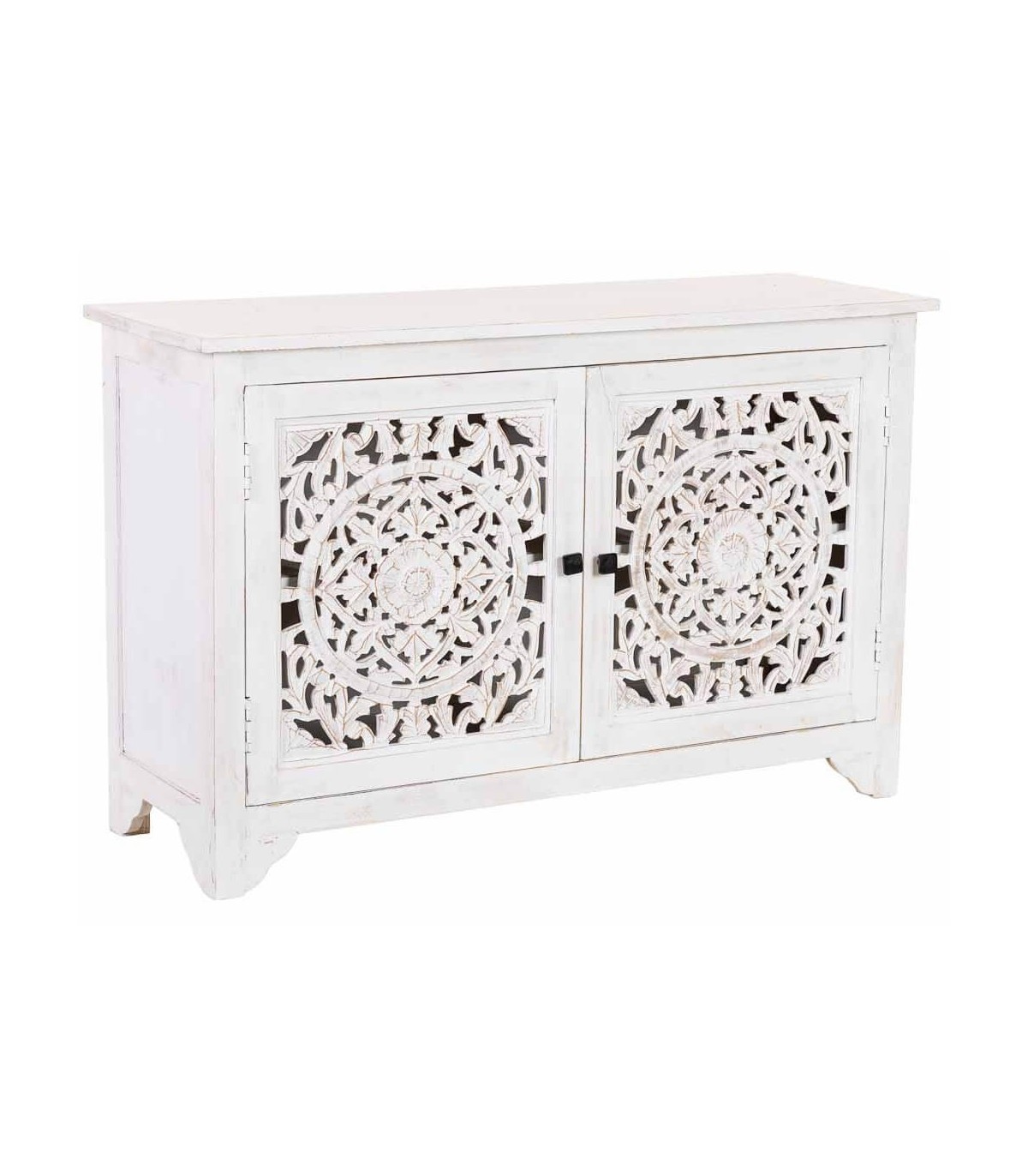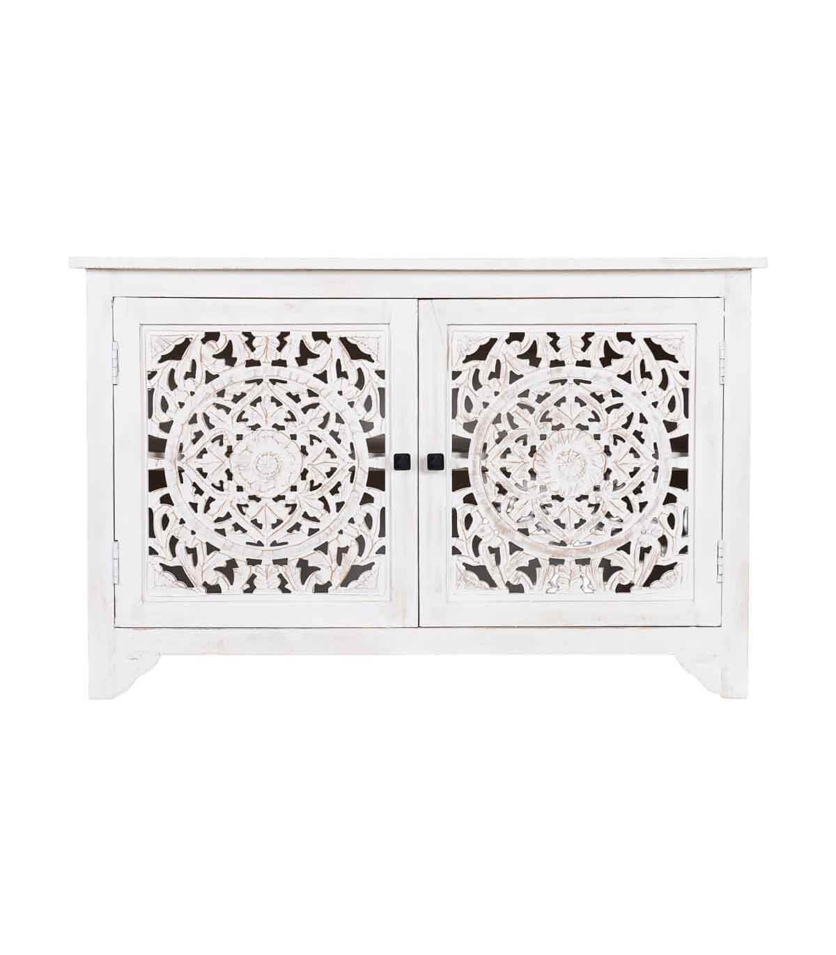La fuerza decorativa de este taquillón destaca por sus puertas talladas a mano, donde el diseño circular aporta un carácter étnico lleno de detalle que transforma la entrada o el salón con una presencia muy expresiva.