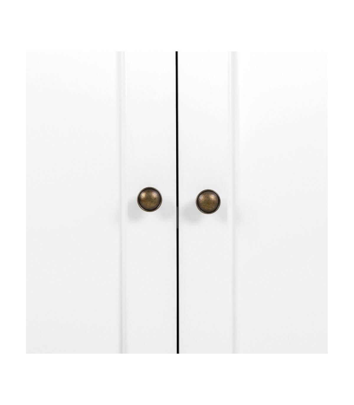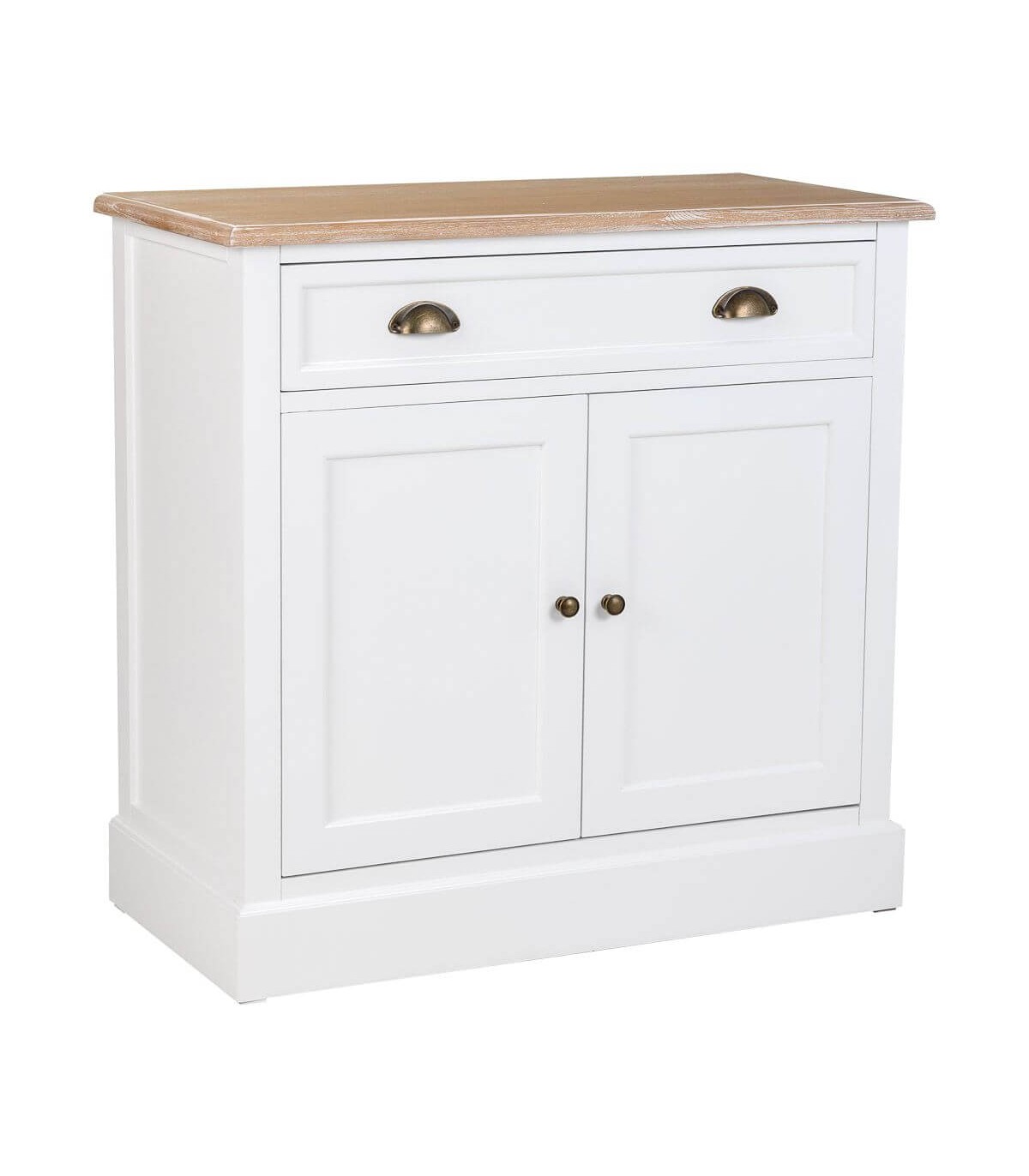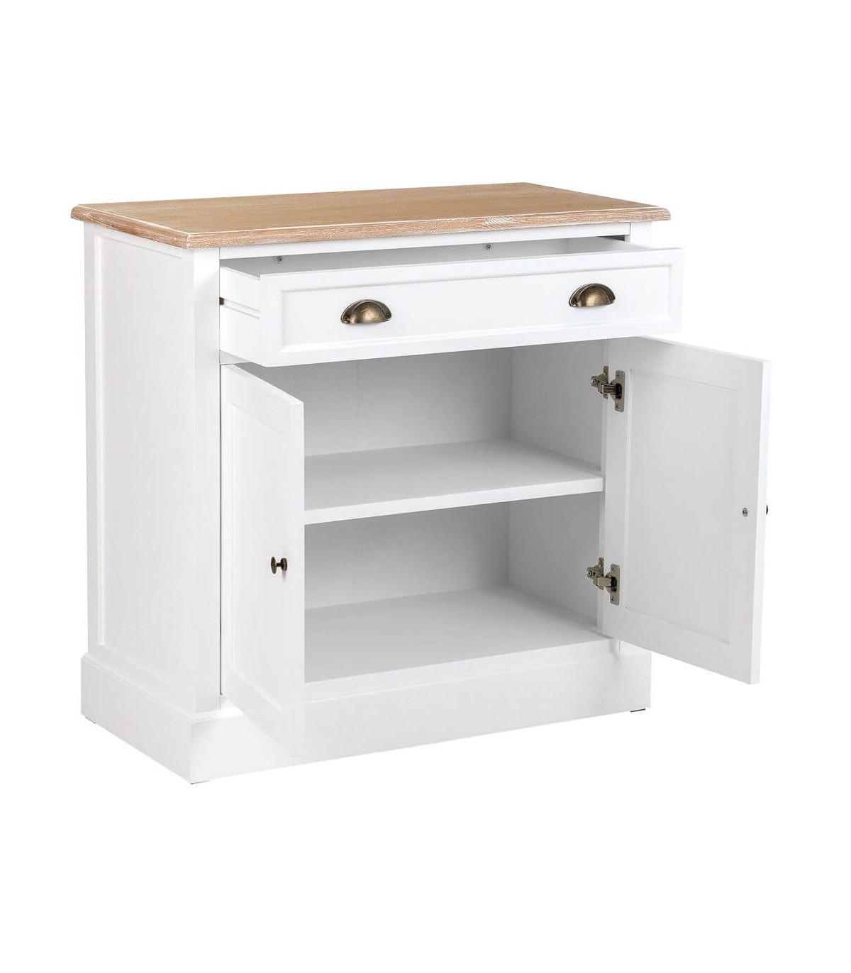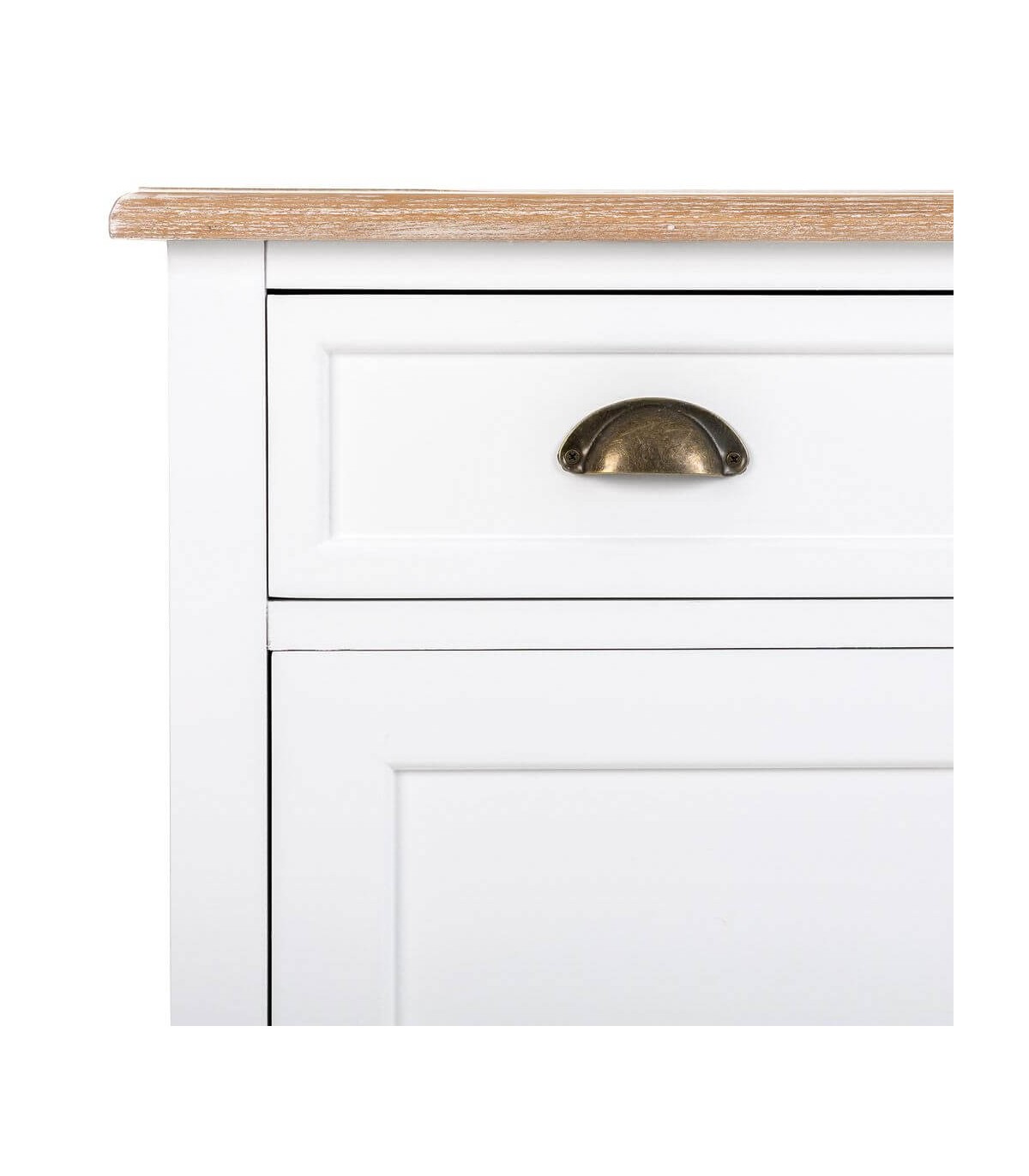 Acabado, tapa madera natural patinada en blanco, cuerpo lacado en blanco, tiradores bronce.