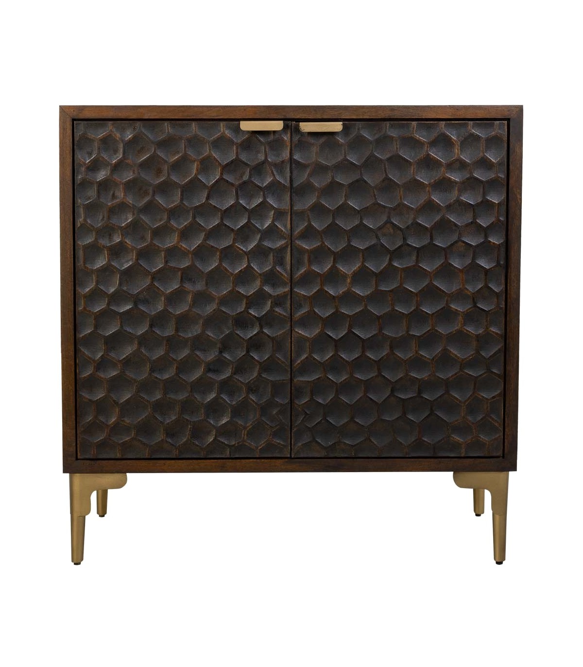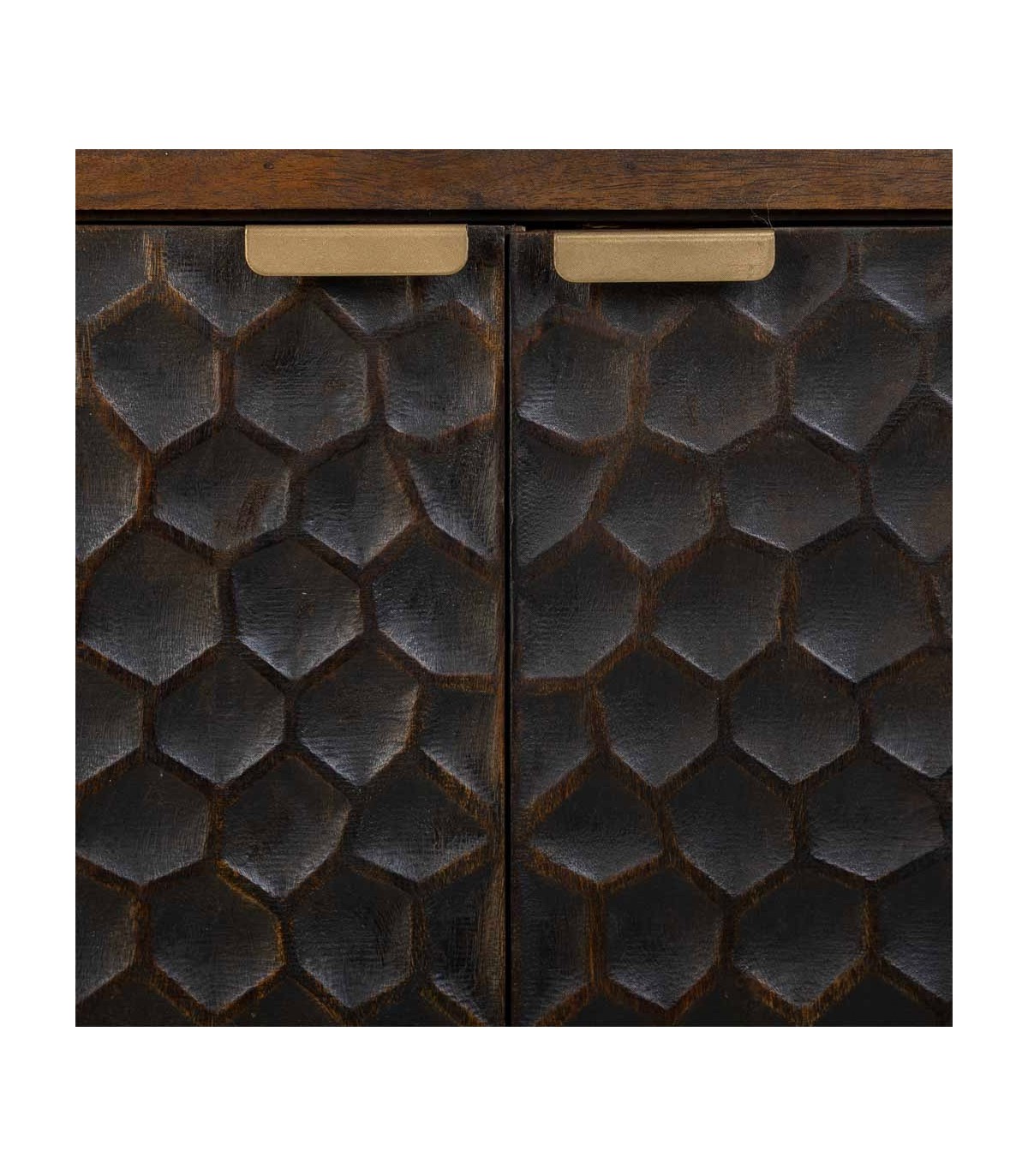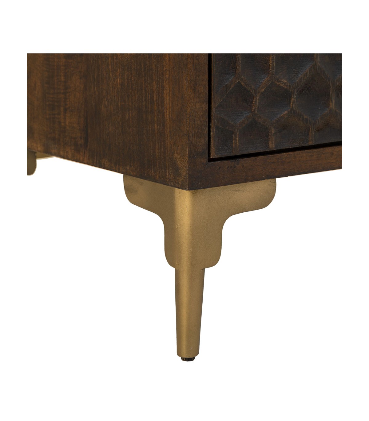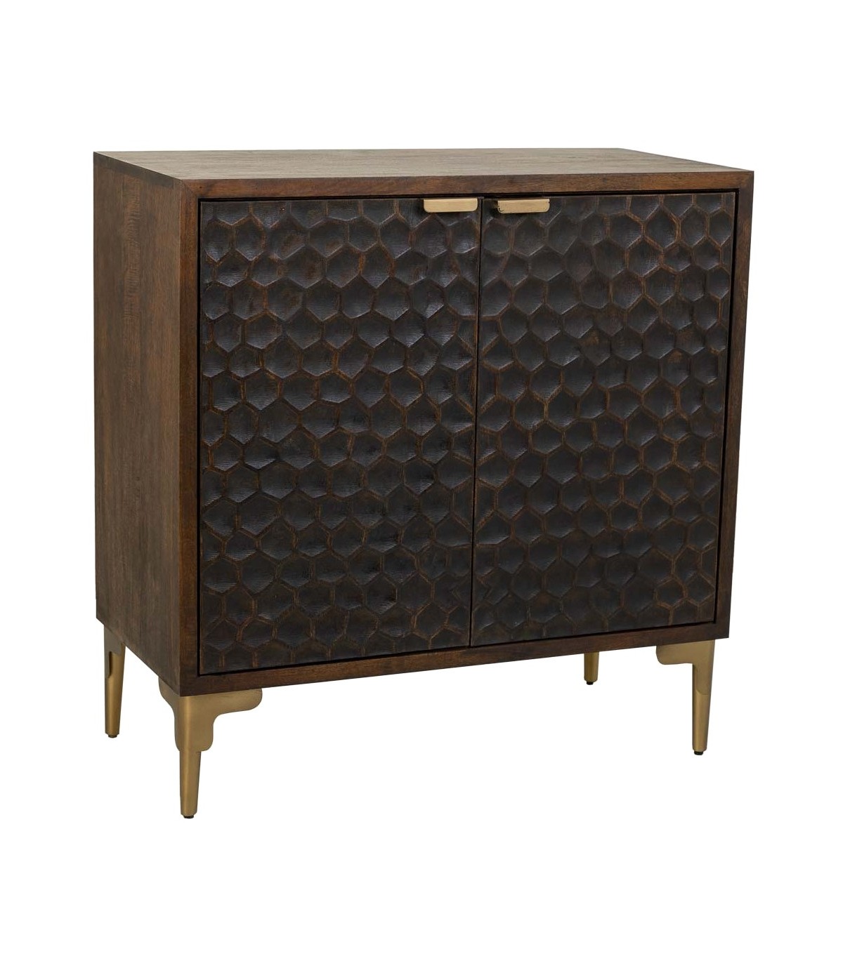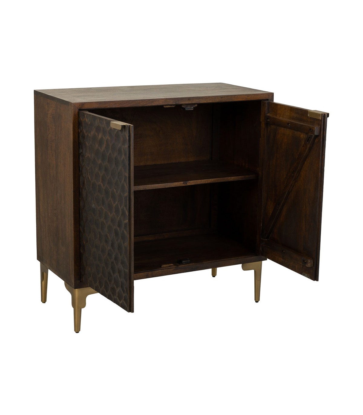 Taquillón, realizado en madera de mango con las puertas labradas artesanalmente teñido en color nogal, patas y tiradores en metal dorado, nos permite un buen almacenaje, perfecto para entradas o zonas auxiliares.