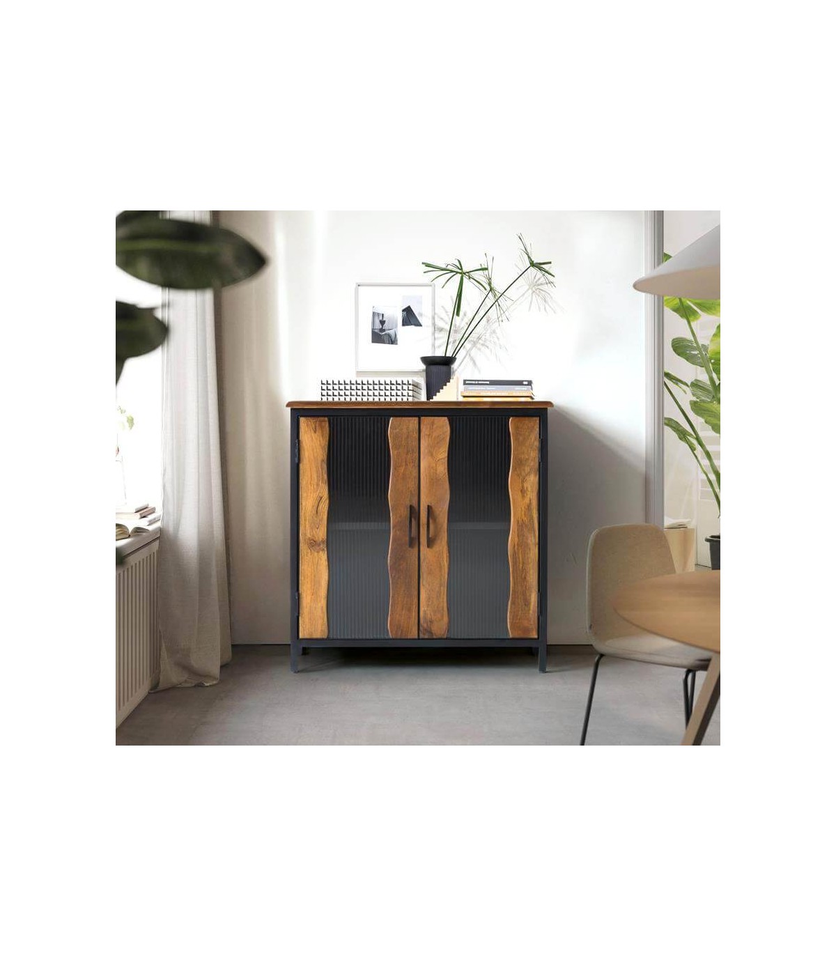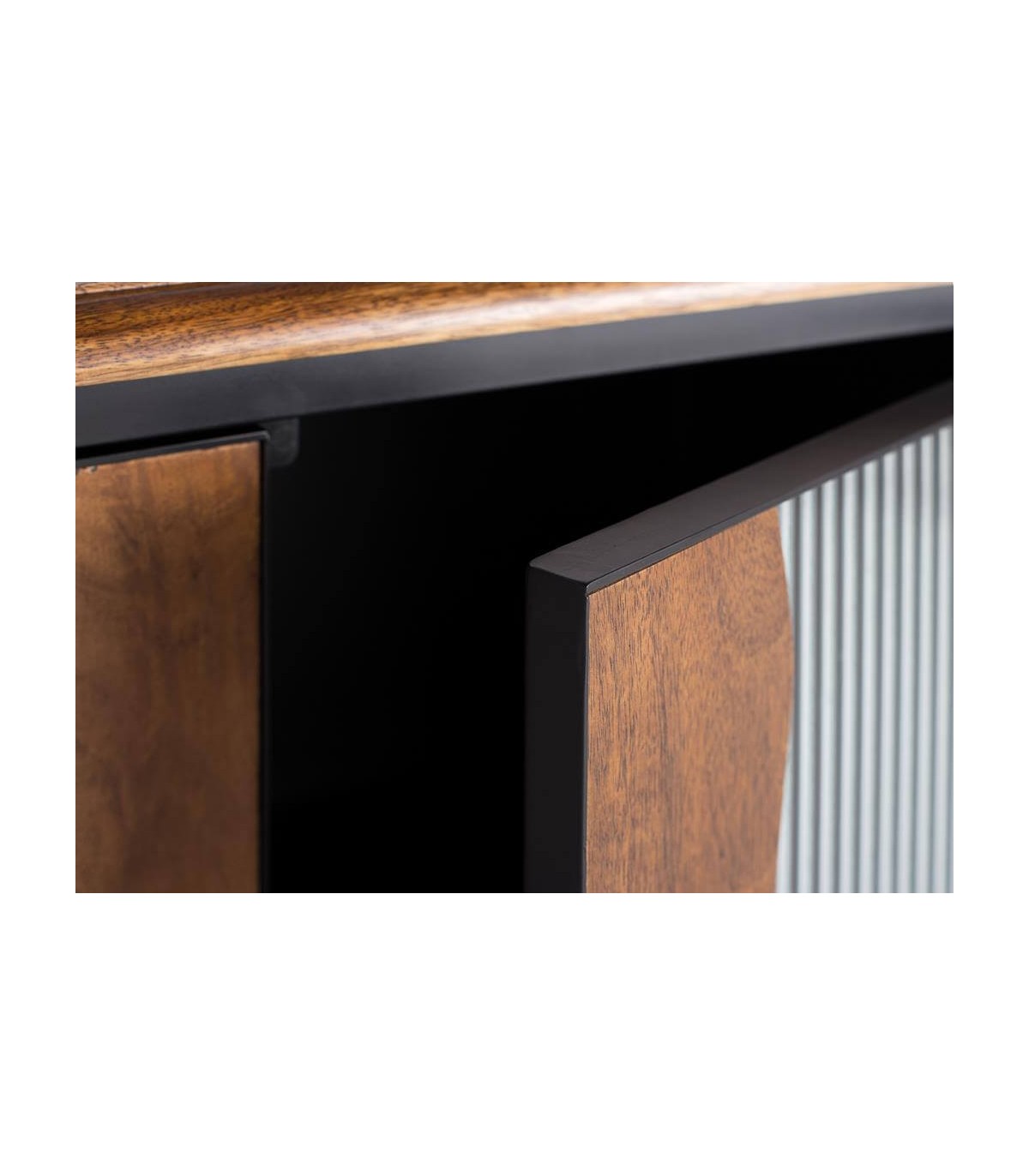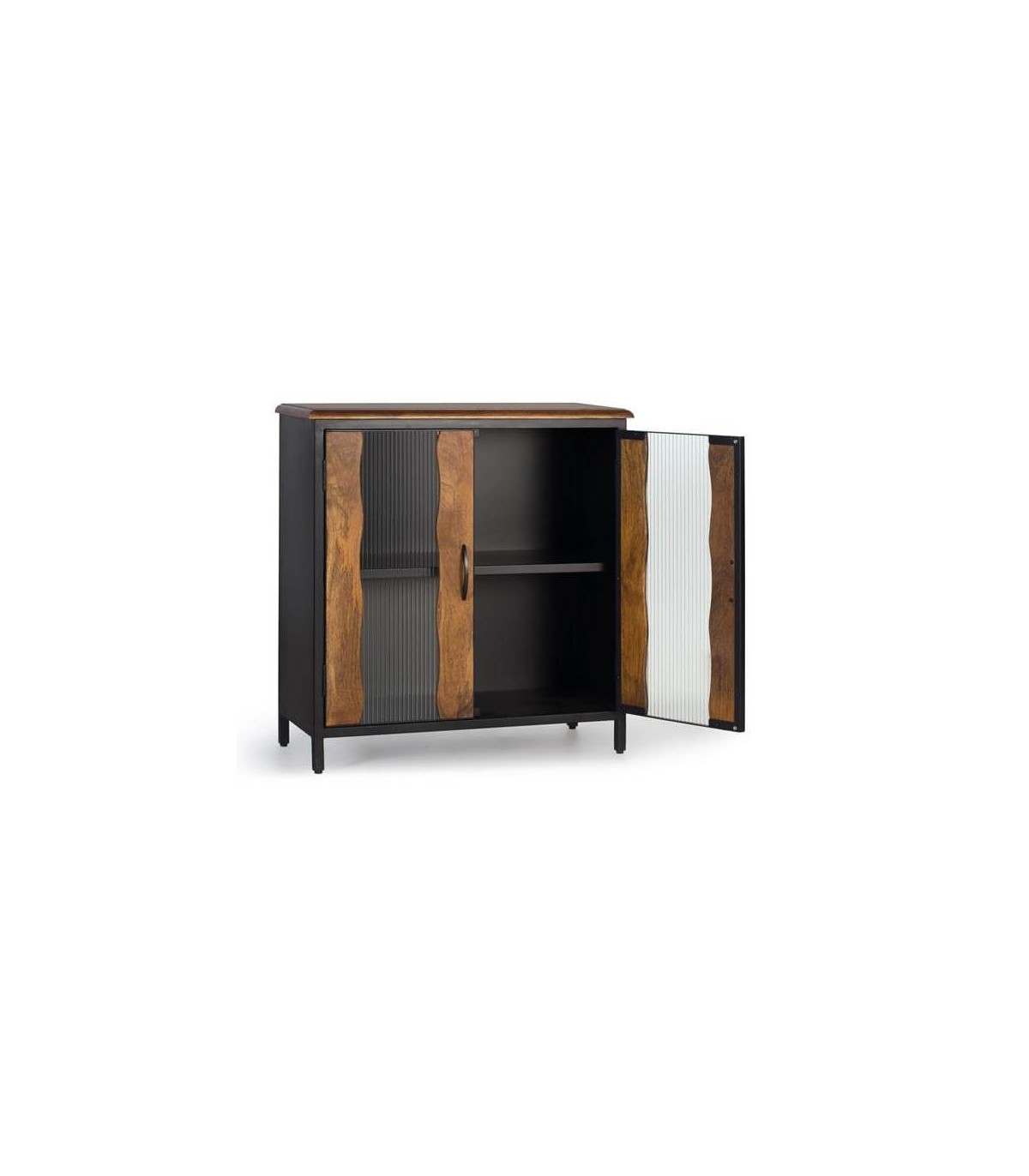 - Acabado, artesanal, estructura en madera maciza de mango acabado natural, puerta, guías y tiradores en metal negro, cristal corrugado.