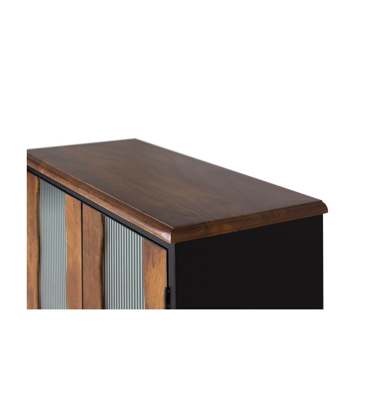 Taquillón de nuestra colección de muebles Ulises, una colección puramente industrial, realizada en madera maciza de mango, jugando con los contrastes de la madera y el metal y con esa puerta corredera en cristal corrugado que le da un toque diferente, y que aparte de funcionalidad hace de la colección un mueble indispensable para los amantes del estilo industrial.