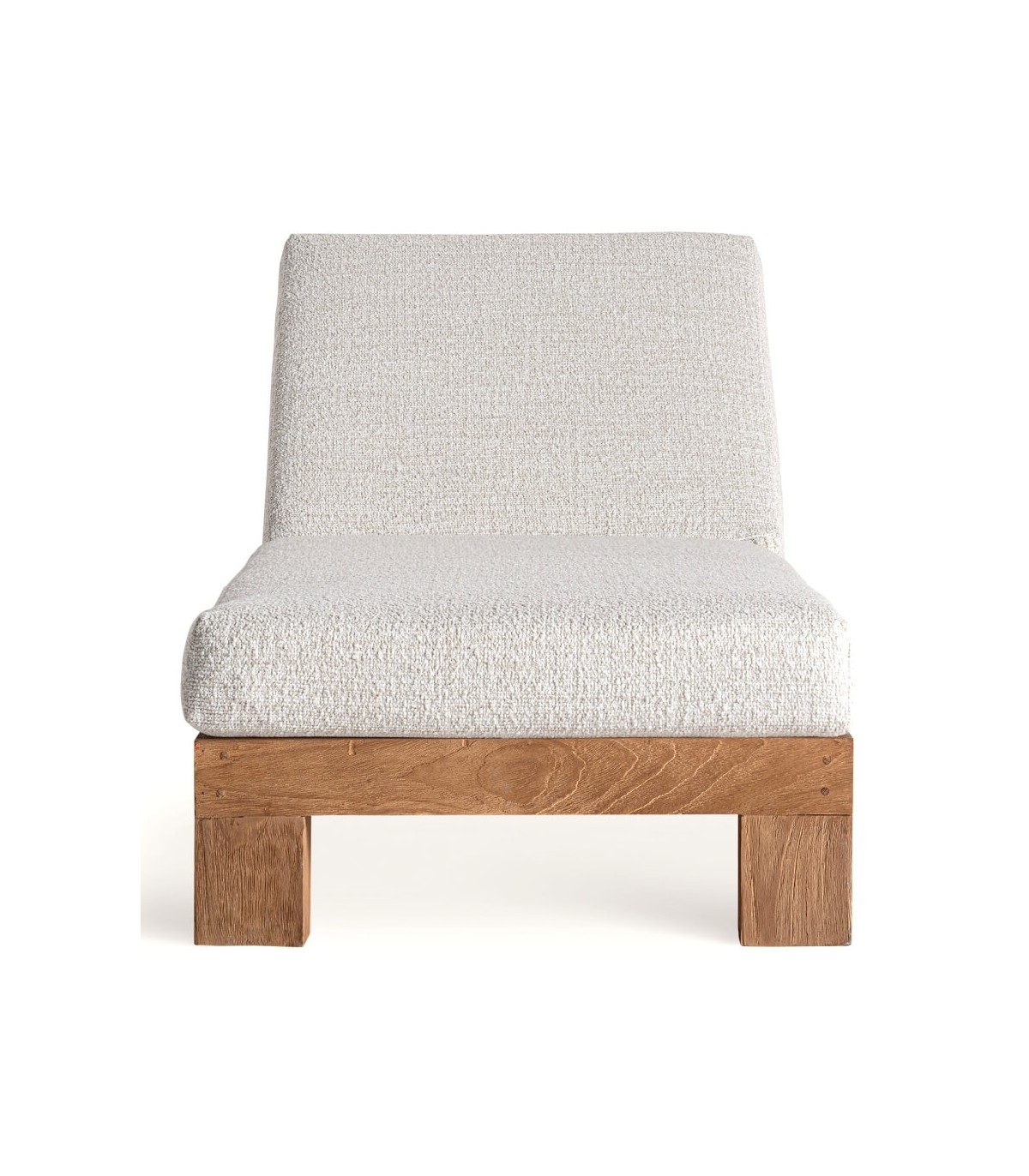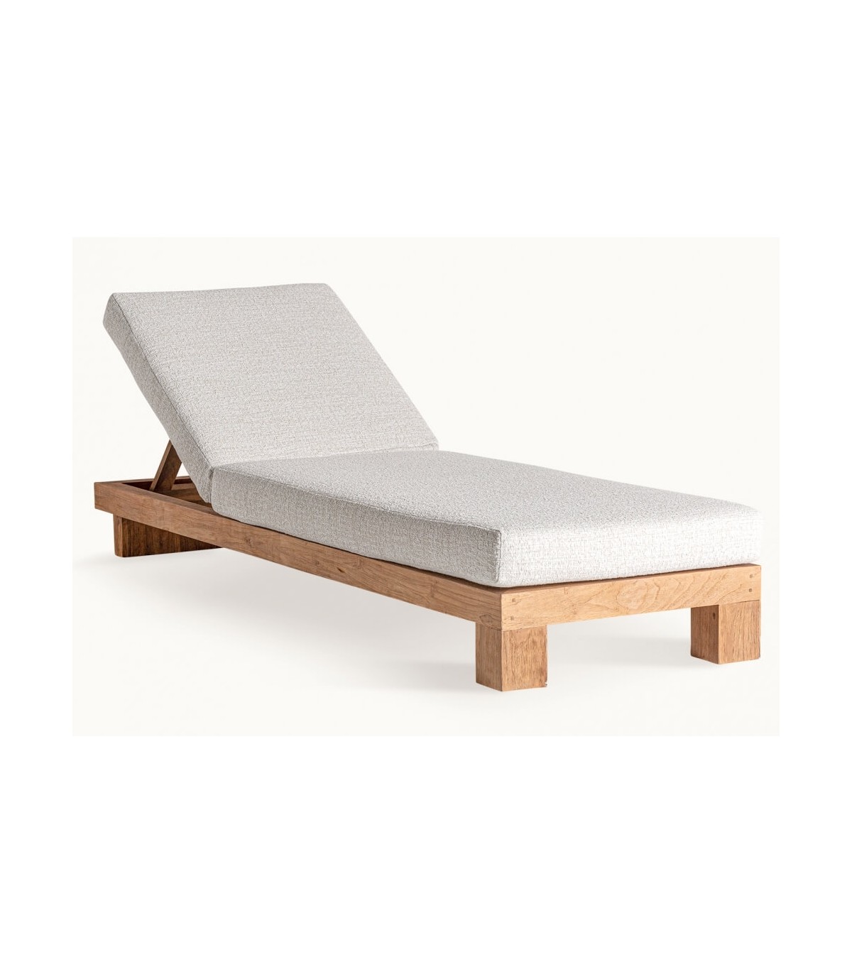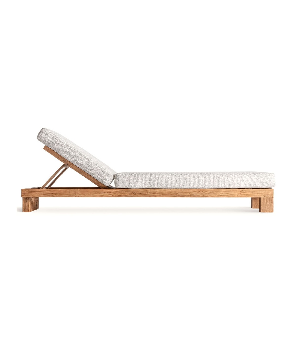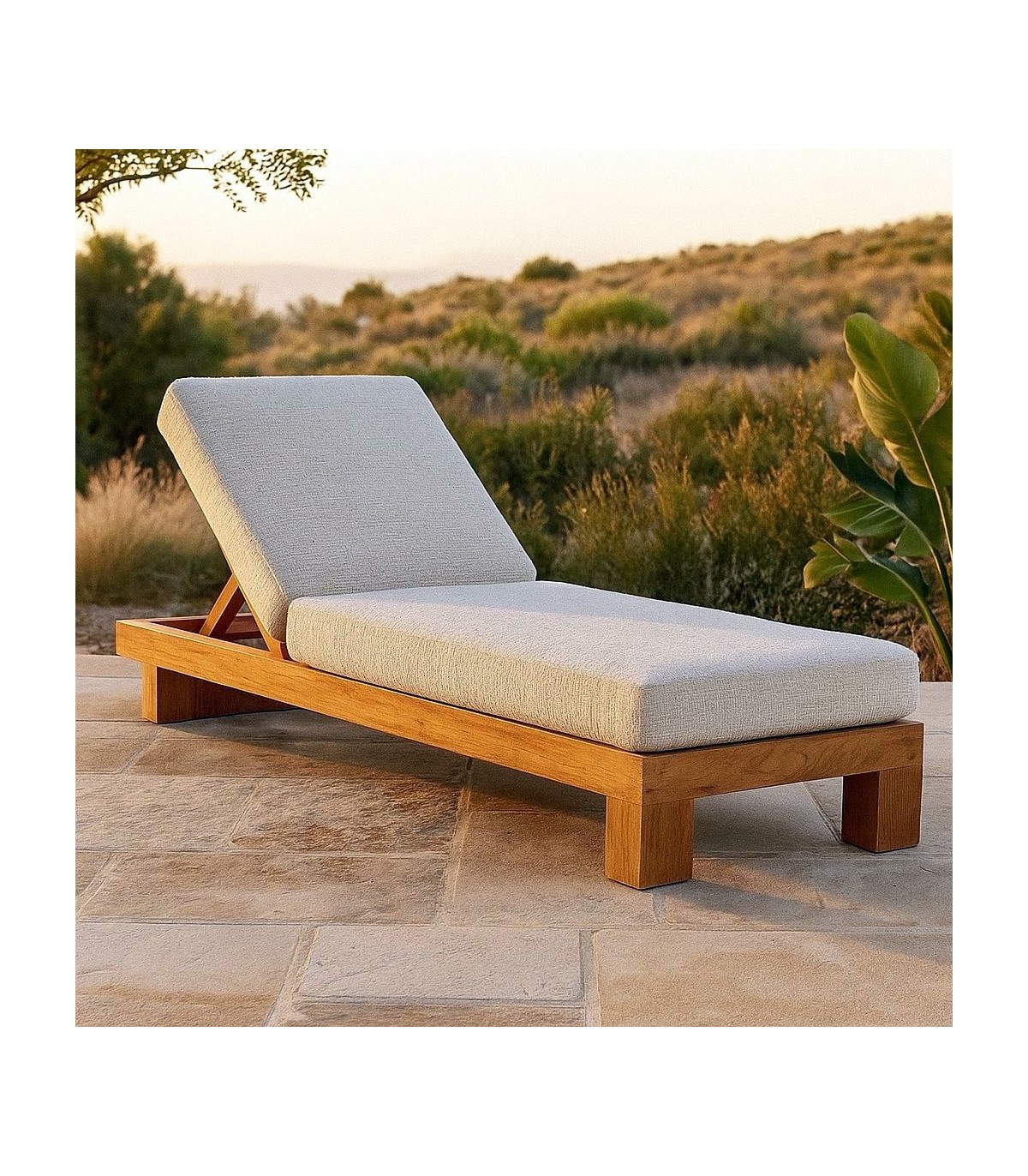 Relájate al aire libre con esta tumbona de líneas puras fabricada en madera de teca reciclada, tratada para exterior y con acabado natural que realza su carácter. El respaldo reclinable se adapta a cada momento, mientras que el cojín blanco roto en tejido hidrófugo de polipropileno combina comodidad y resistencia.