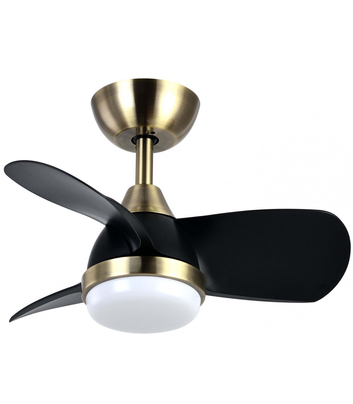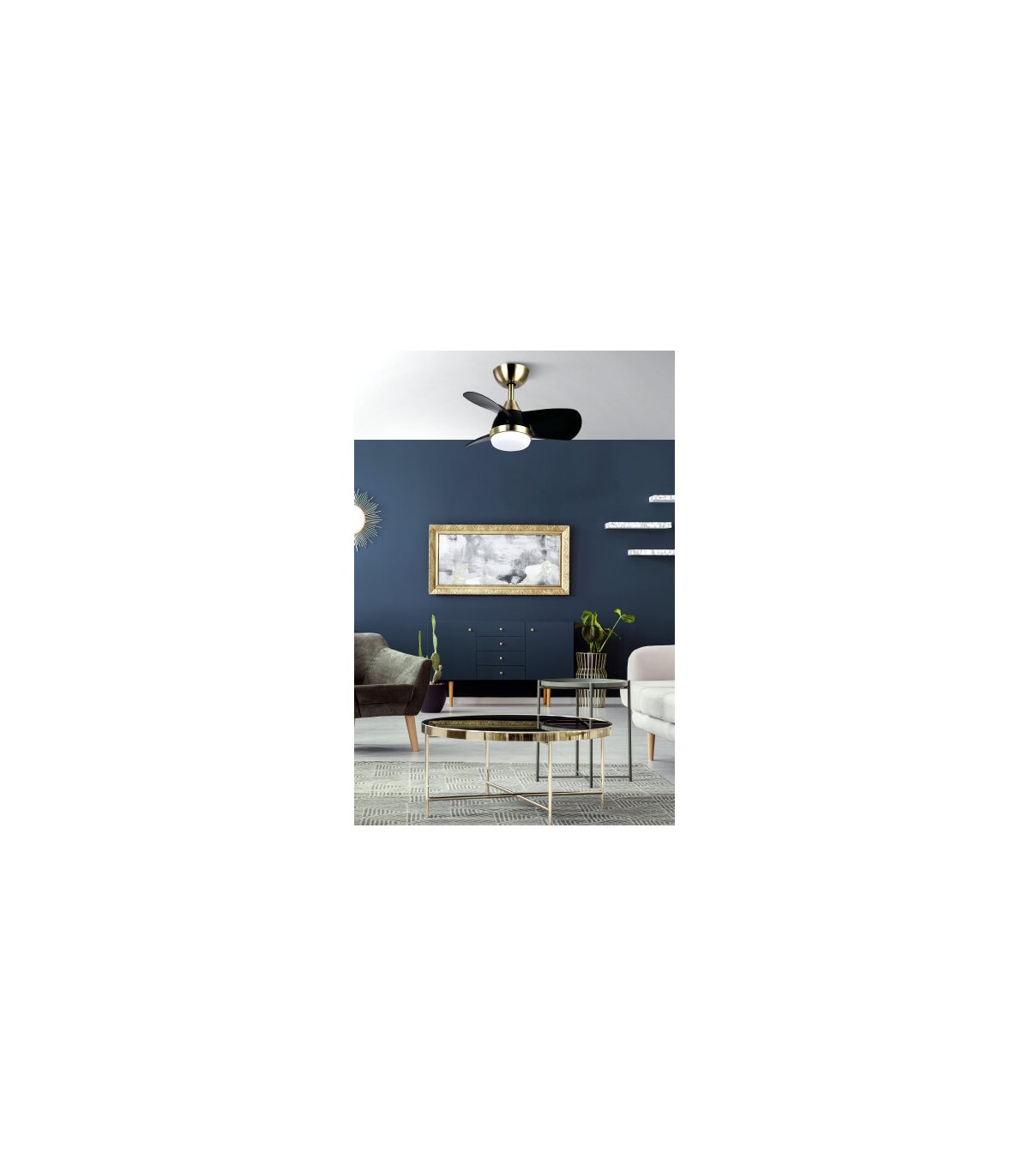 Ventilador Dirpo con 3 aspas en abs color negro combinado con metal acabado oro viejo. De diseño moderno, con líneas sencillas, pero muy decorativo por su estructura compacta, ideal para dormitorios y habitaciones juveniles.