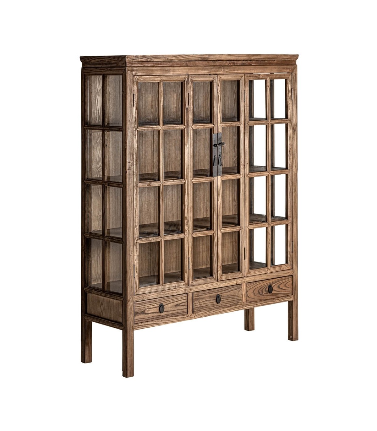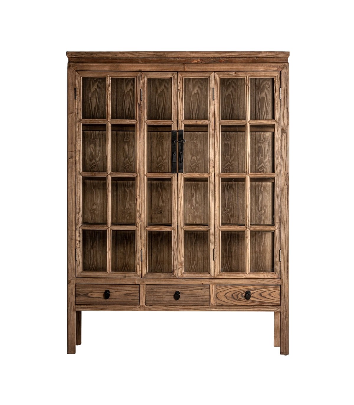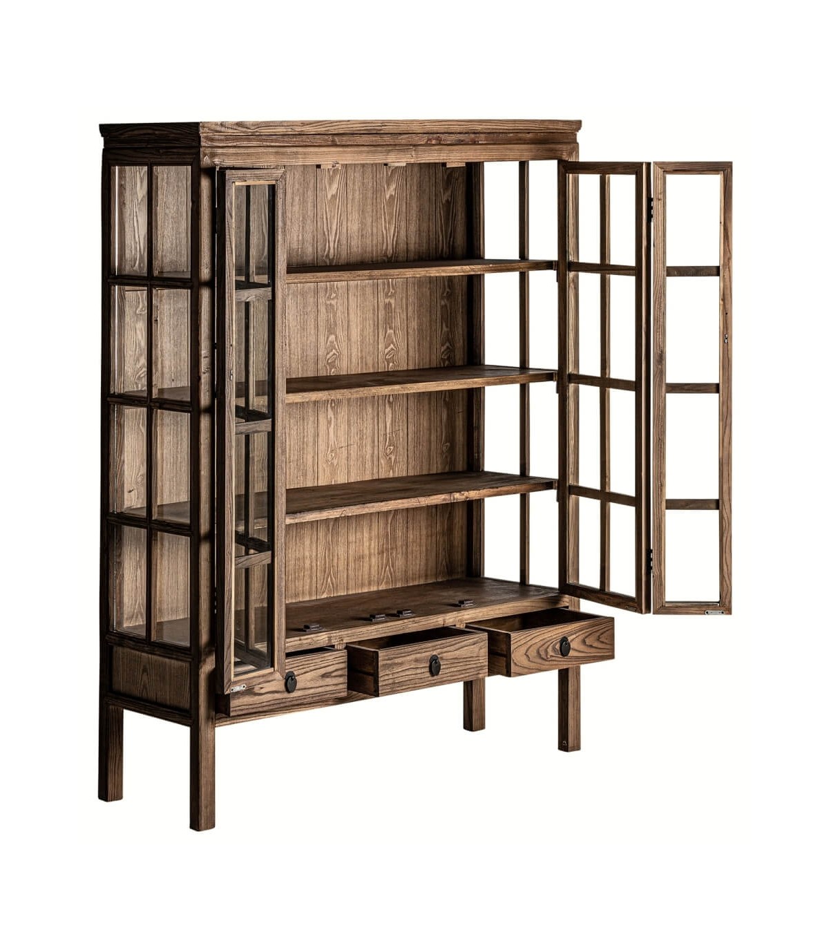 Espectacular vitrina, para grandes salones, realizada en madera maciza de olmo natural acabado vintage, sin duda el centro de atención en cualquier decoración.