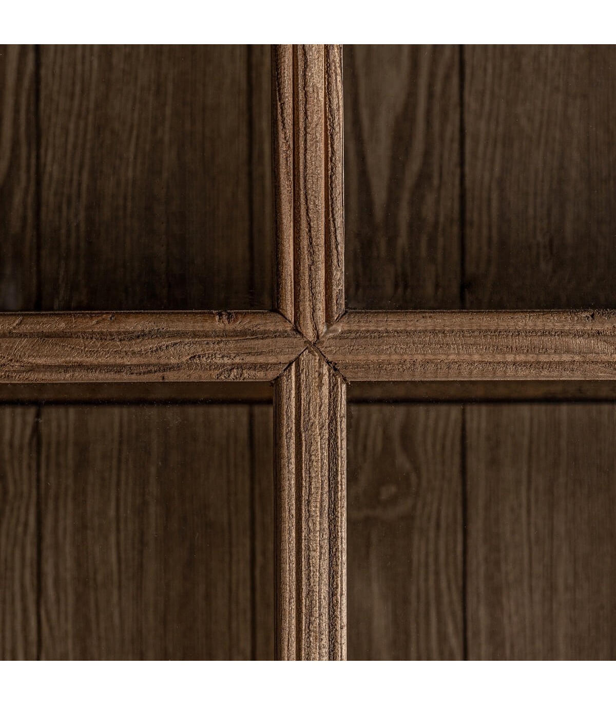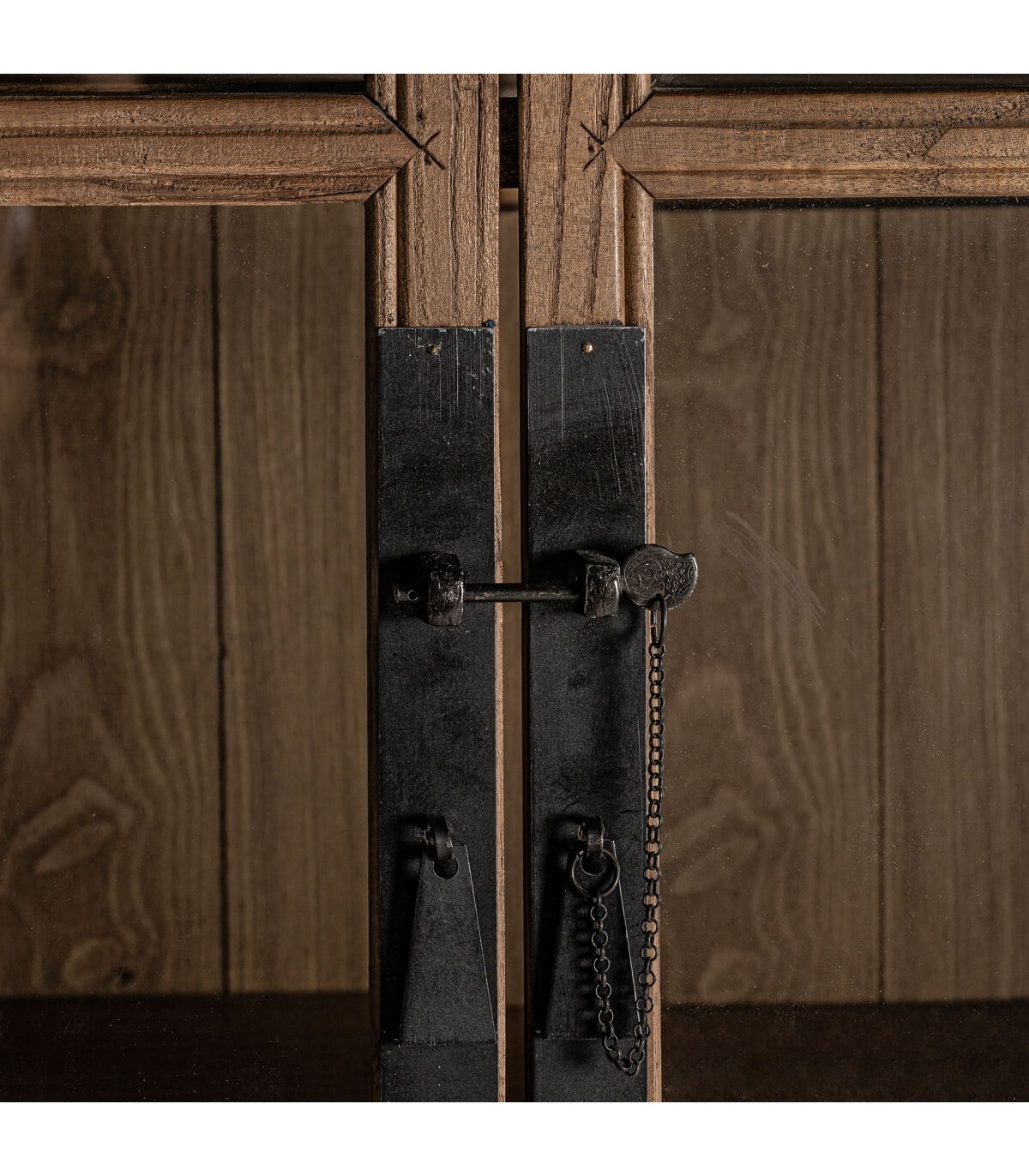 • Acabado, artesanal, madera vintage, puertas con cristal de celosía, tiradores en bronce patinado en negro.