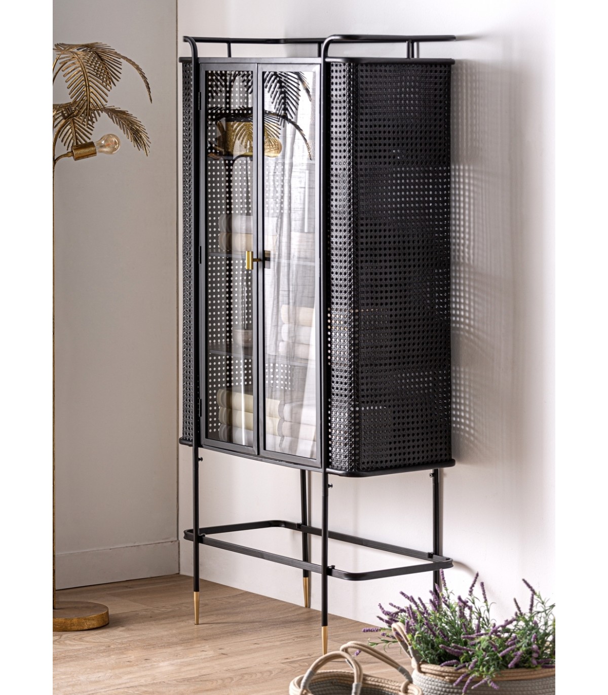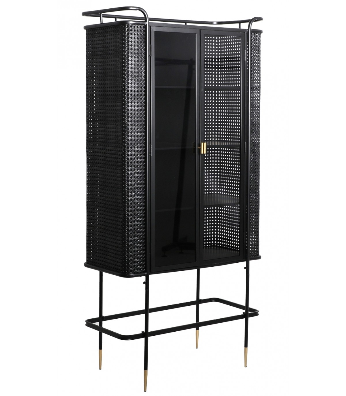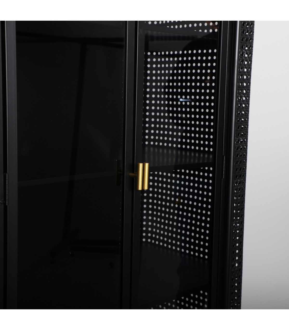 Vitrina de nuestra colección Fussen, realizada en metal negro y chapa perforada con detalles en cristal, con los tiradores en metal dorado, un mueble de buena calidad con un diseño industrial hecho para perdurar.