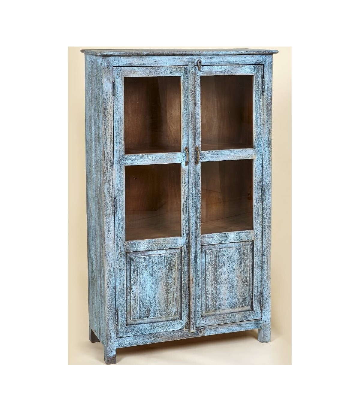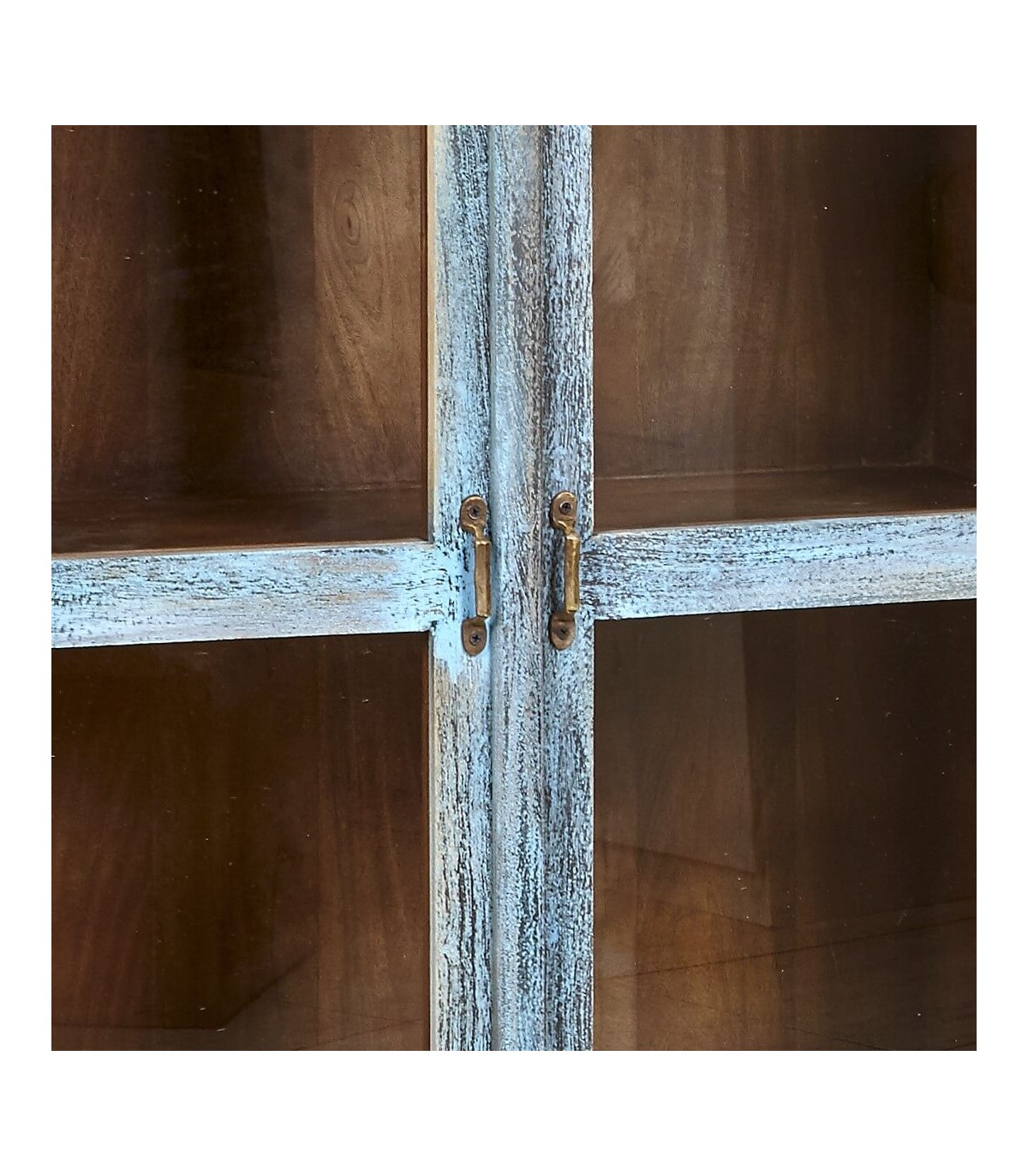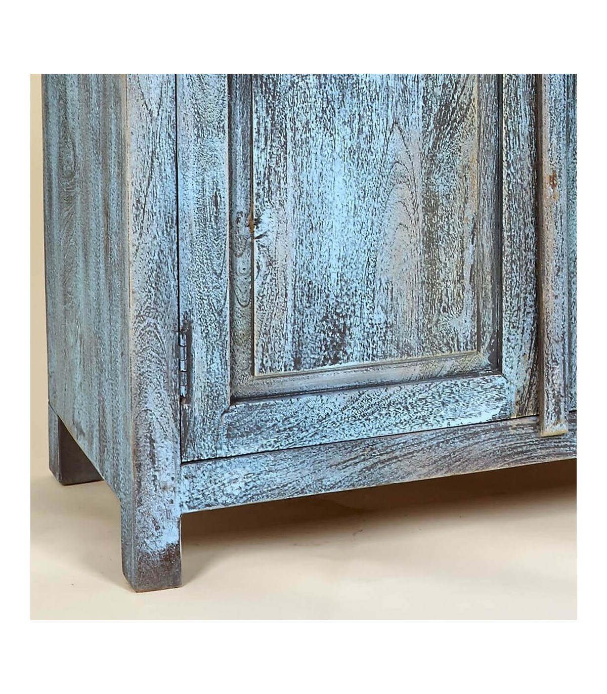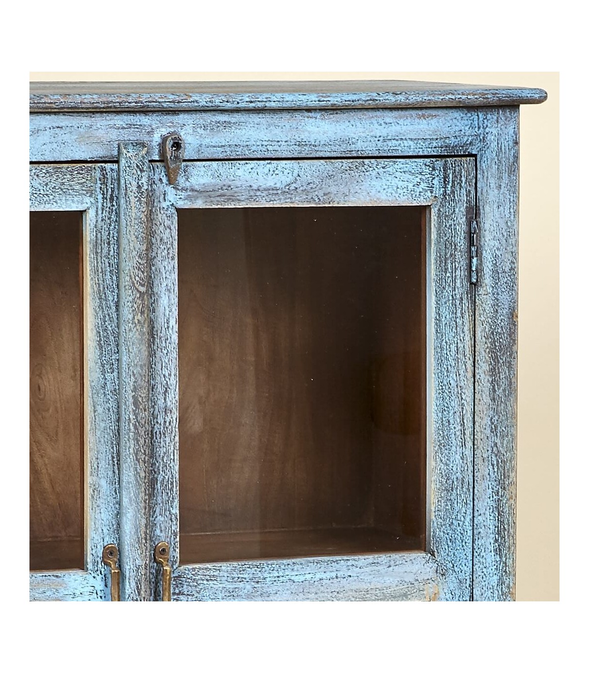 Vitrina baja con 2 puertas realizada en madera de mango decapada en color azul, de estilo rústico, pon una nota de color muy agradable en tu decoración.