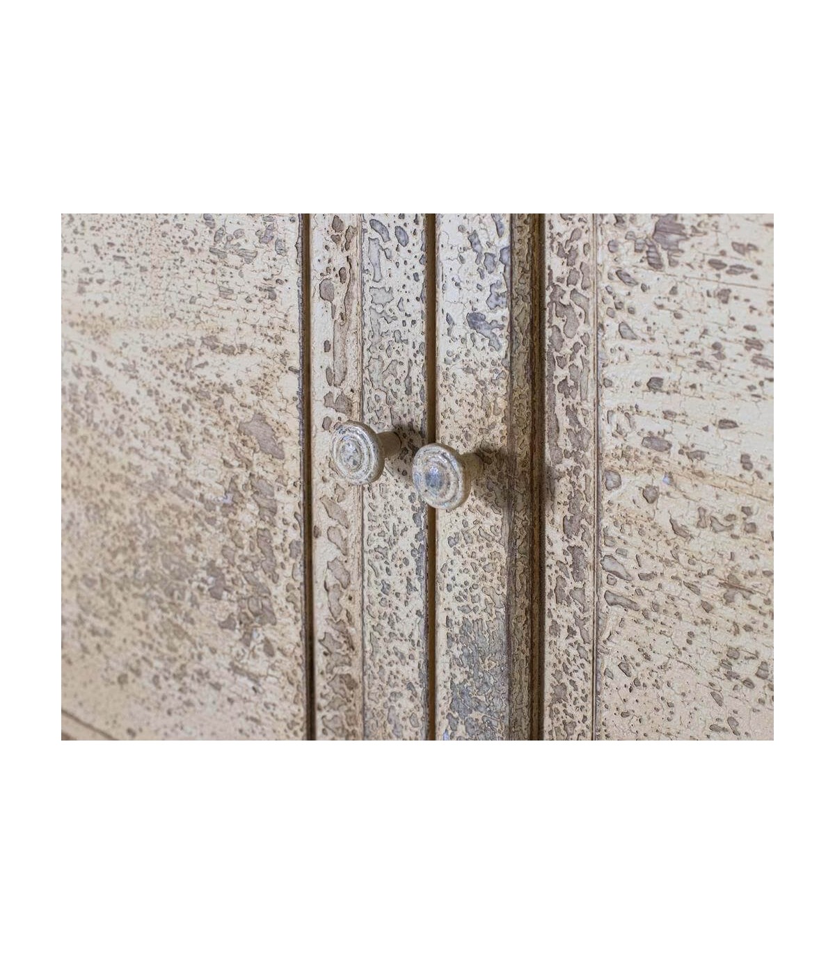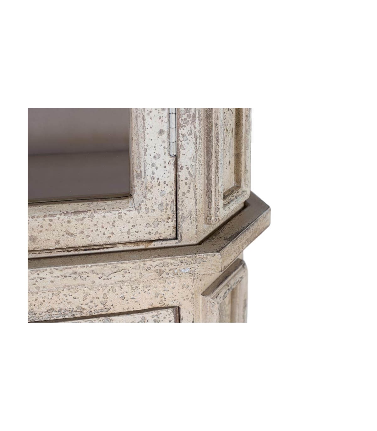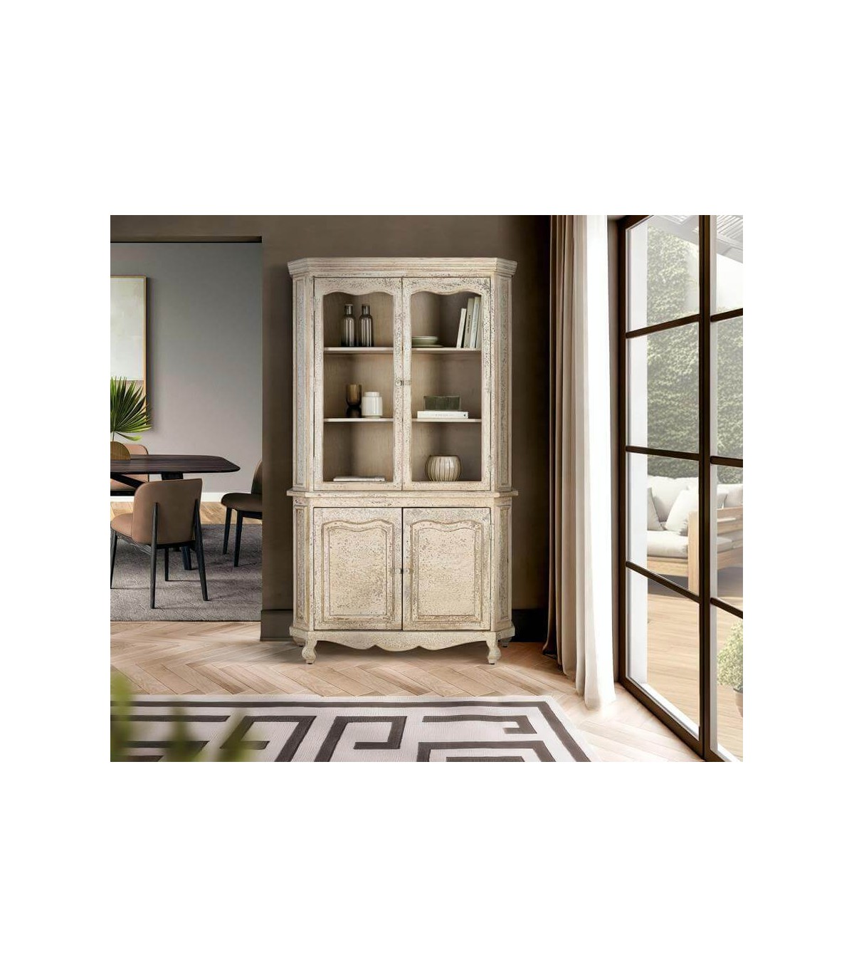 Vitrina con 2 puertas de cristal y 2 puertas de madera realizada en madera maciza de mango acabado decapado en crema artesanalmente, perfecta para dar un toque distinguido a tu salón.