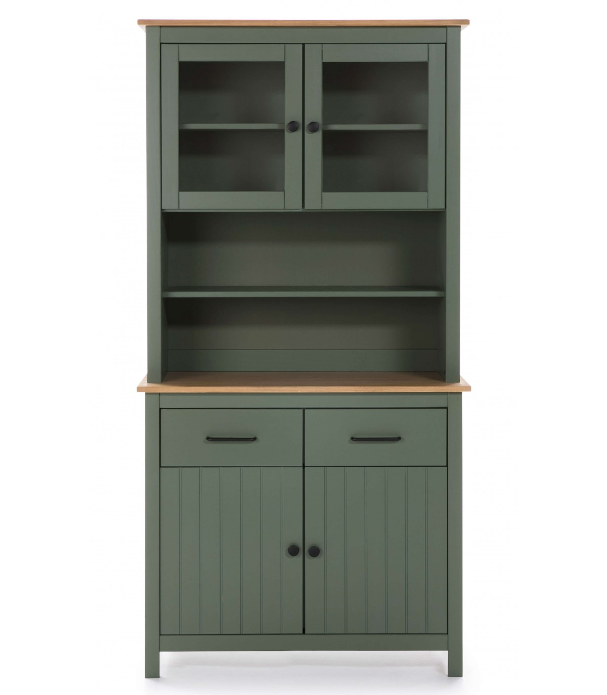 Vitrina realizada en pino natural combinado con laca verde, de gran capacidad con 2 puertas, 2 cajones y 2 puertas de vitrina, perfecta para un salón o cocina, para los que quieren un mueble práctico y decorativo, ideal para darle una nota de color a decoraciones planas.