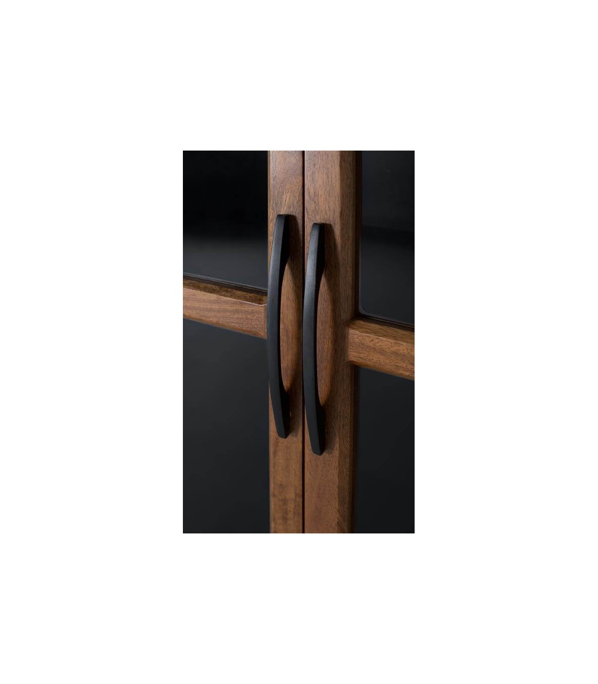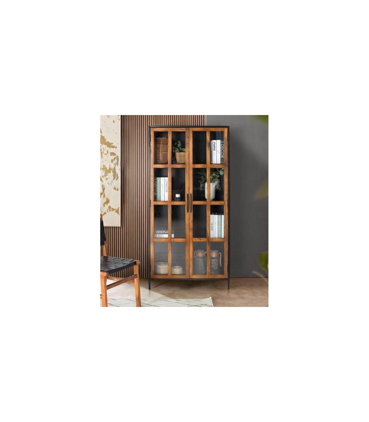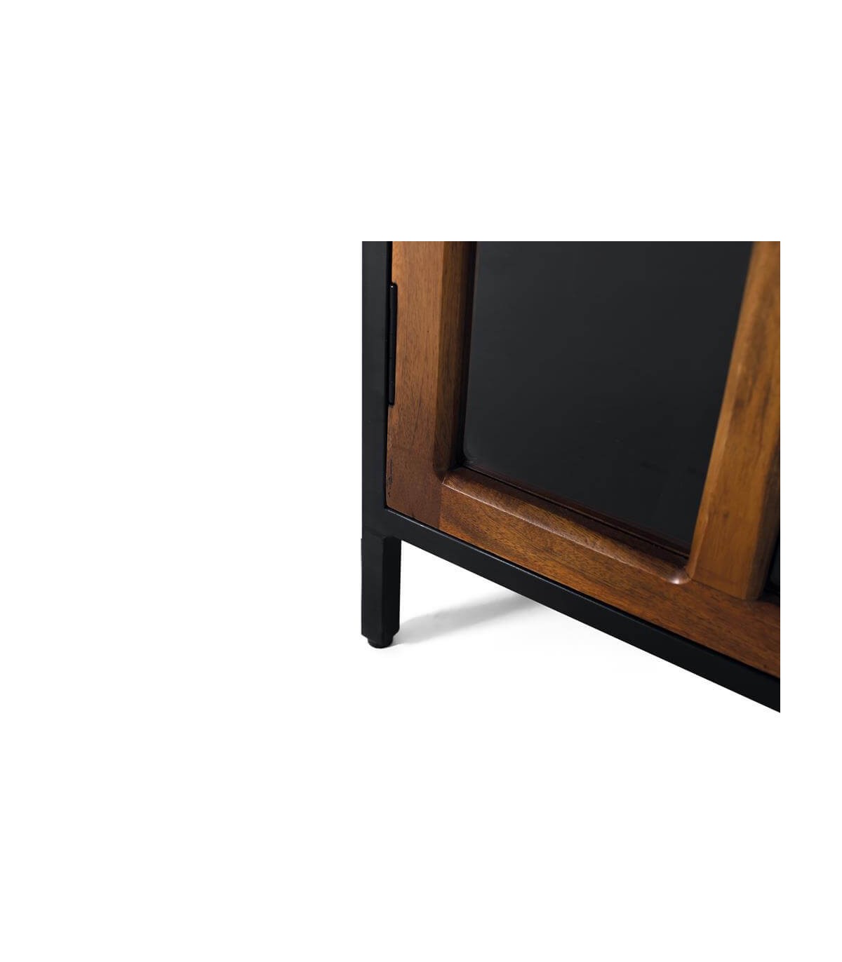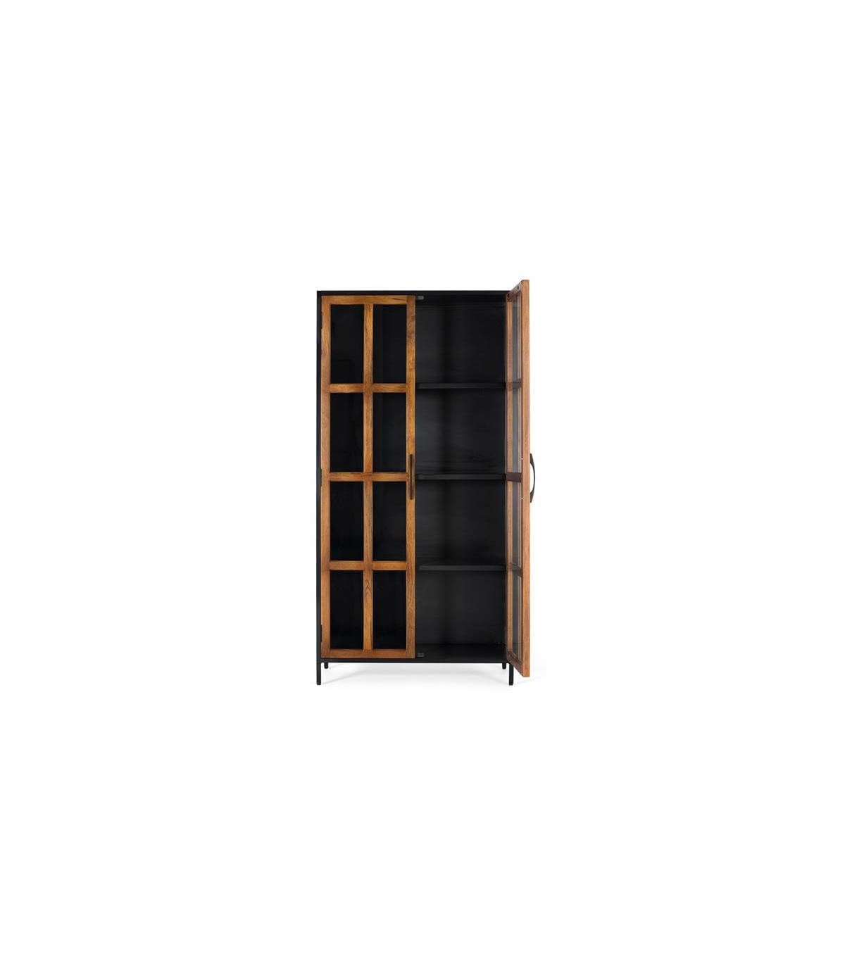 Vitrina 2 puertas realizada en madera de mango natural, con la estructura en metal negro. un diseño a caballo entre el estilo colonial e industrial., ideal para vitrina expositora.