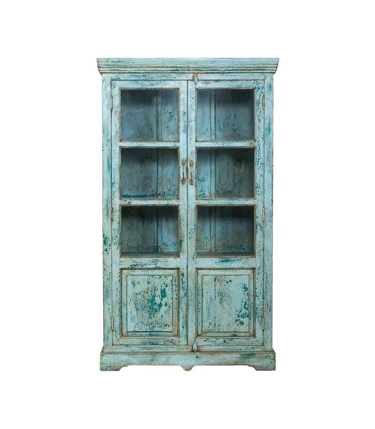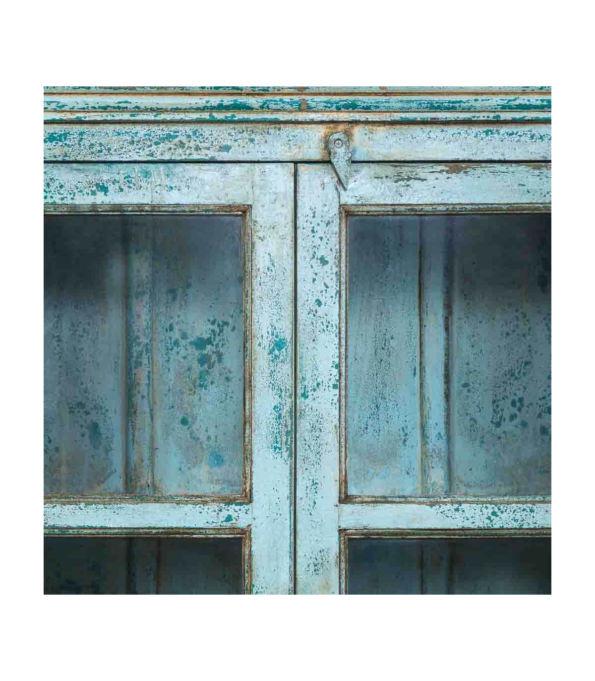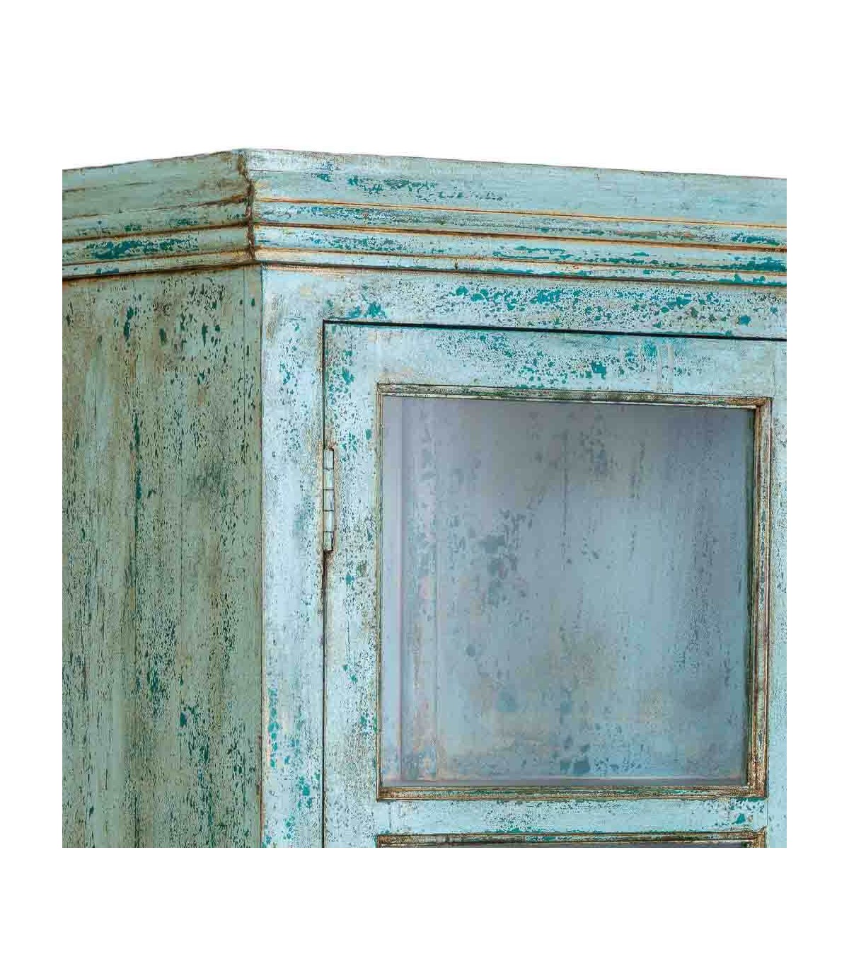 Vitrina de madera maciza decapada que aporta un aire boho lleno de carácter y personalidad a cualquier estancia. Su acabado turquesa envejecido, combinado con el interior en blanco vintage, crea una sensación luminosa y equilibrada que realza la belleza artesanal de la pieza.