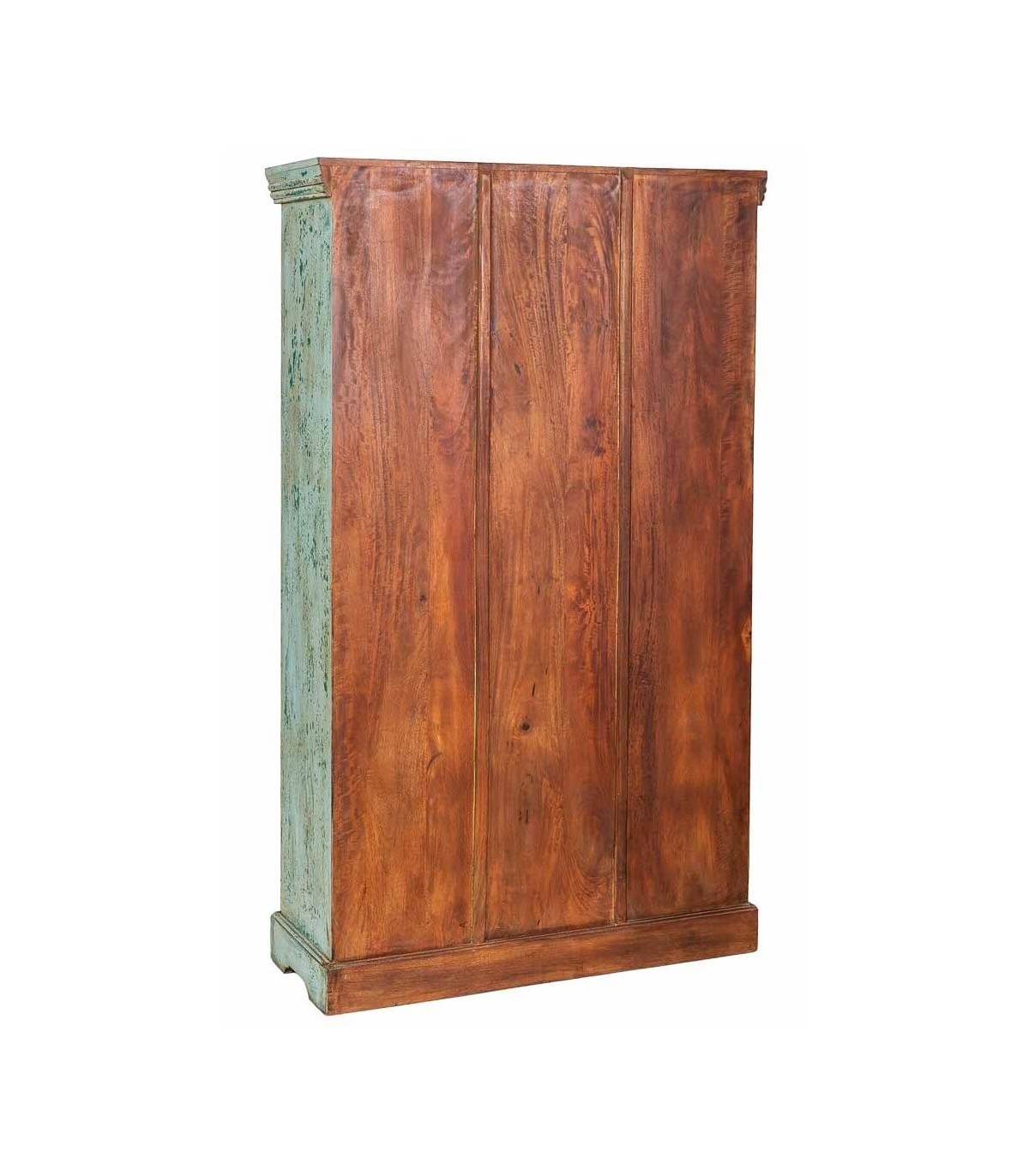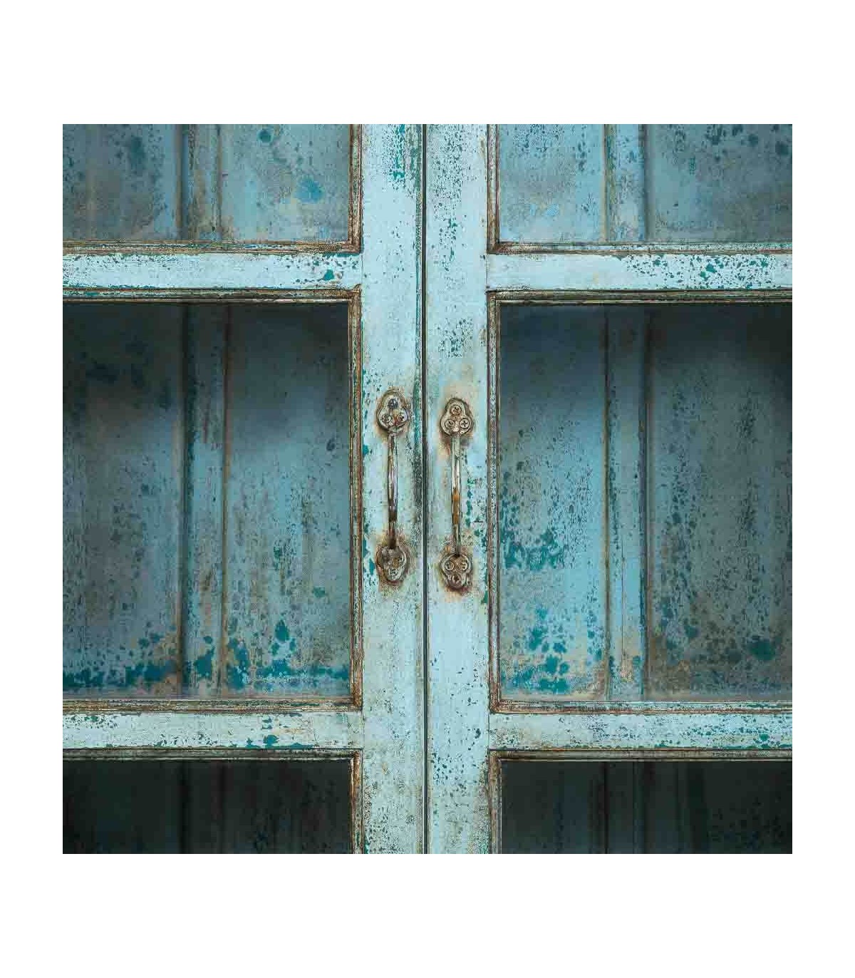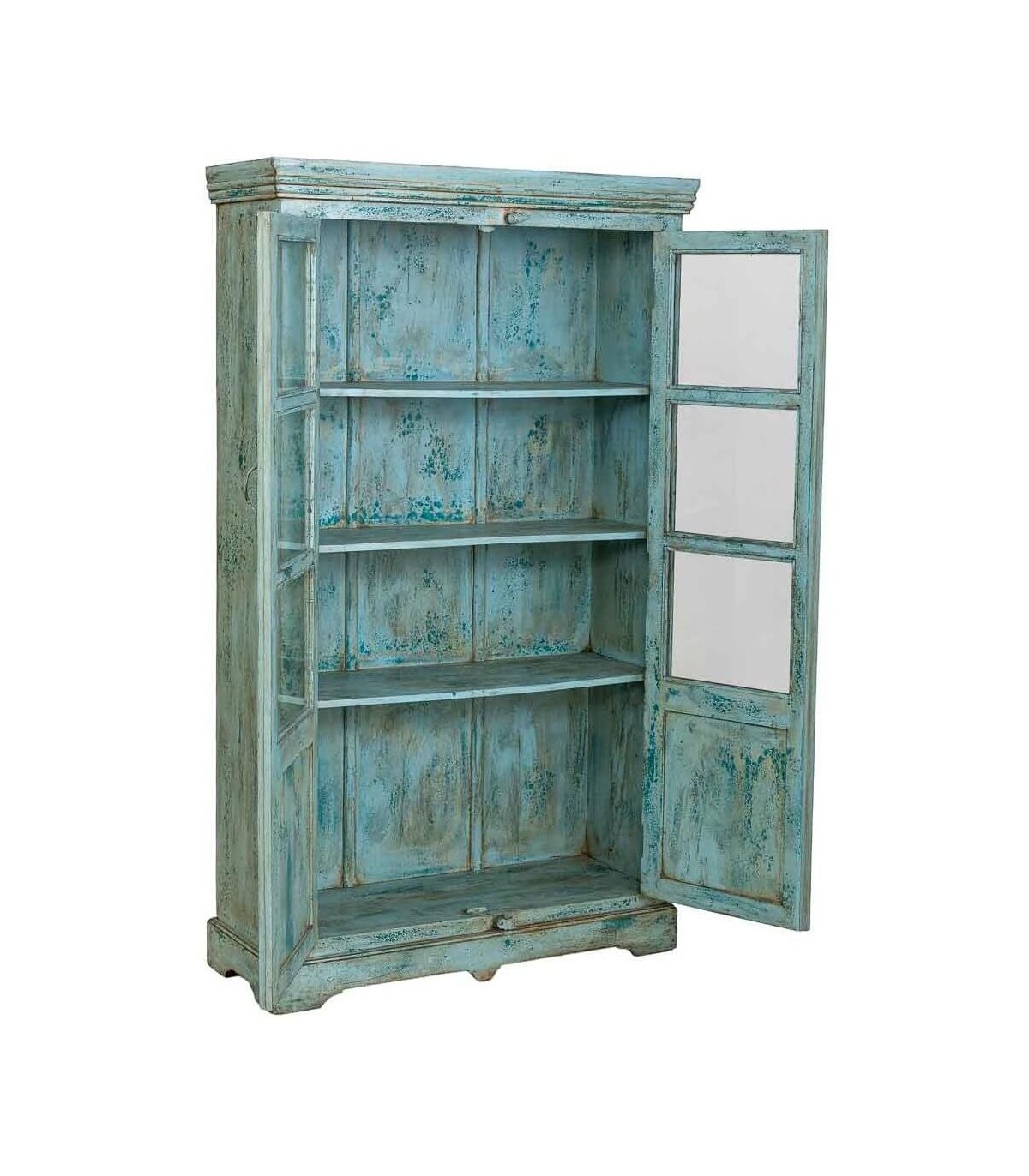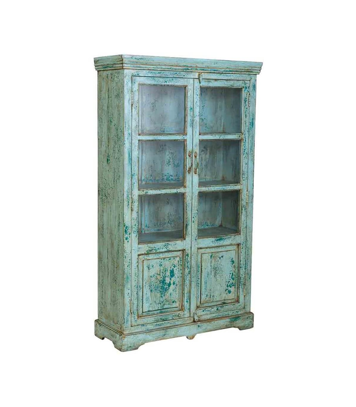 Vitrina de madera maciza decapada que aporta un aire boho lleno de carácter y personalidad a cualquier estancia. Su acabado turquesa envejecido, combinado con el interior en blanco vintage, crea una sensación luminosa y equilibrada que realza la belleza artesanal de la pieza.