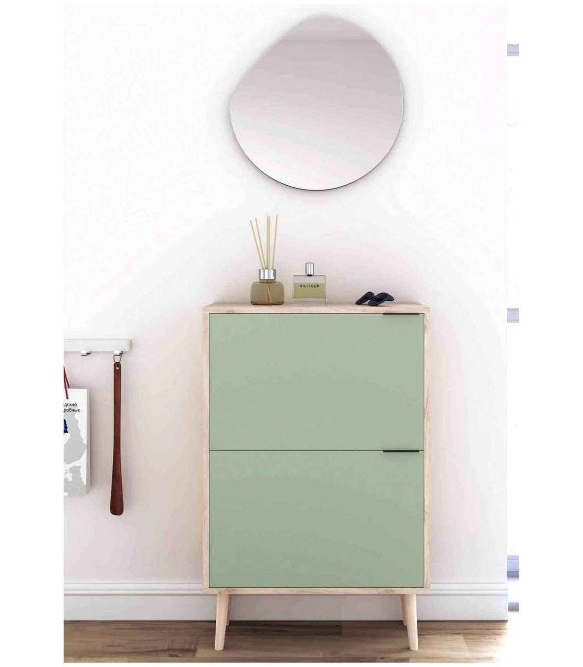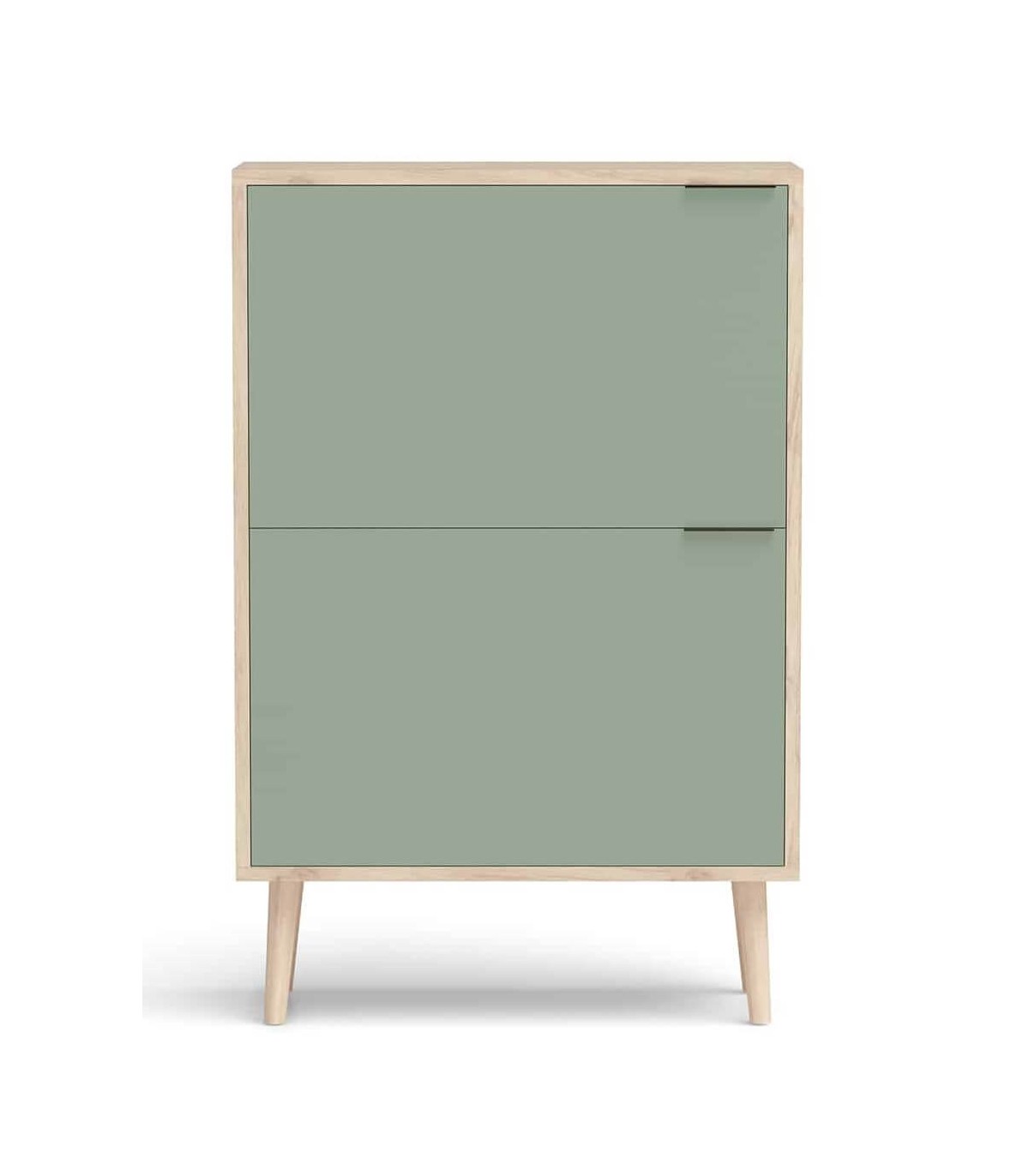 Mueble zapatero fabricado en melamina roble natural y verde con pata en madera de haya. Diseño sencillo con dos puertas abatibles que incluyen un tirador metálico para facilitar su apertura. El interior se divide en 4 compartimentos de 10,5cm de fondo cada uno, permitiendo almacenar hasta 10 pares de zapatos. Será la opción perfecta para organizar el calzado tanto en la entrada, el dormitorio o el vestidor.