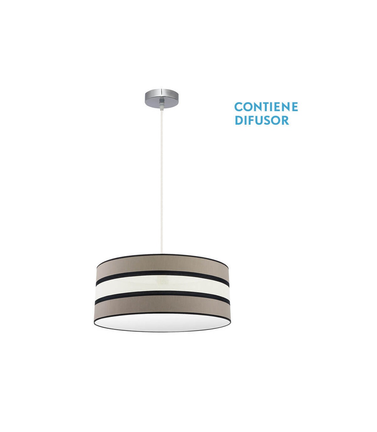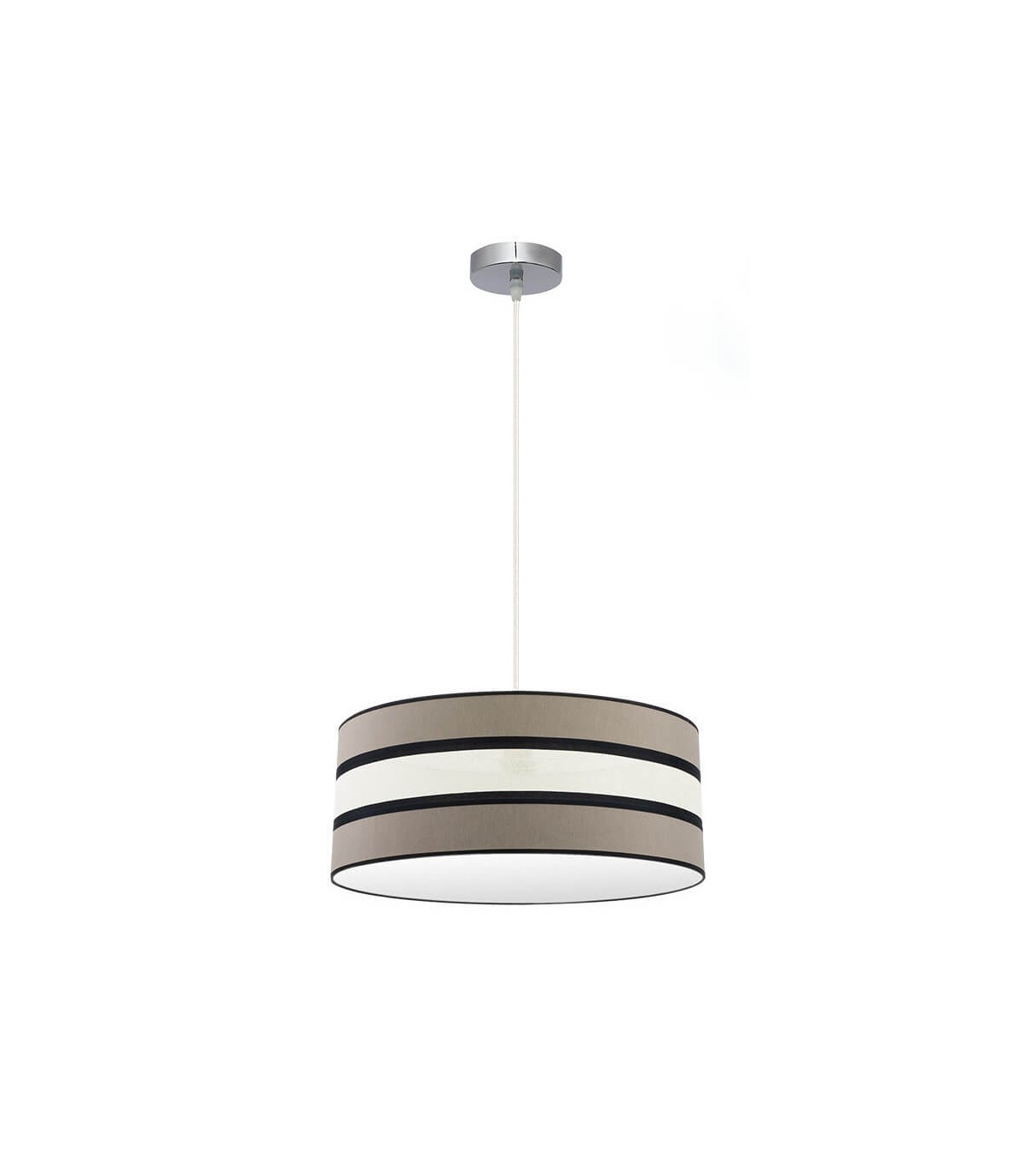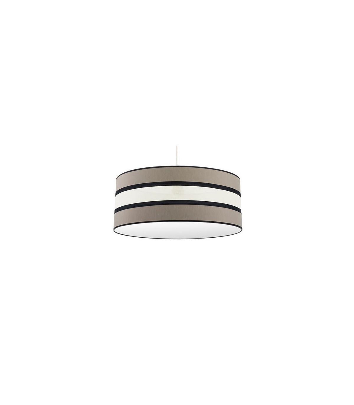 Colgante serie Karla, con la pantalla blanco, beis y negro y vivo en negro. Destaca su pantalla, por su diseño moderno y la combinación de sus colores. Composición muy elegante compatible con el nuevo estilo Vintage, ideal para iluminar en dormitorios, comedores, salones, despachos y salas de estar. En esta misma serie podemos encontrar a juego los colgantes de 40, 50 y 60 centímetros de diámetro, dos medidas de sobremesas, el pie de salón y lámparas de cuatro, tres y dos luces, todos los modelos también en color topo/beis.