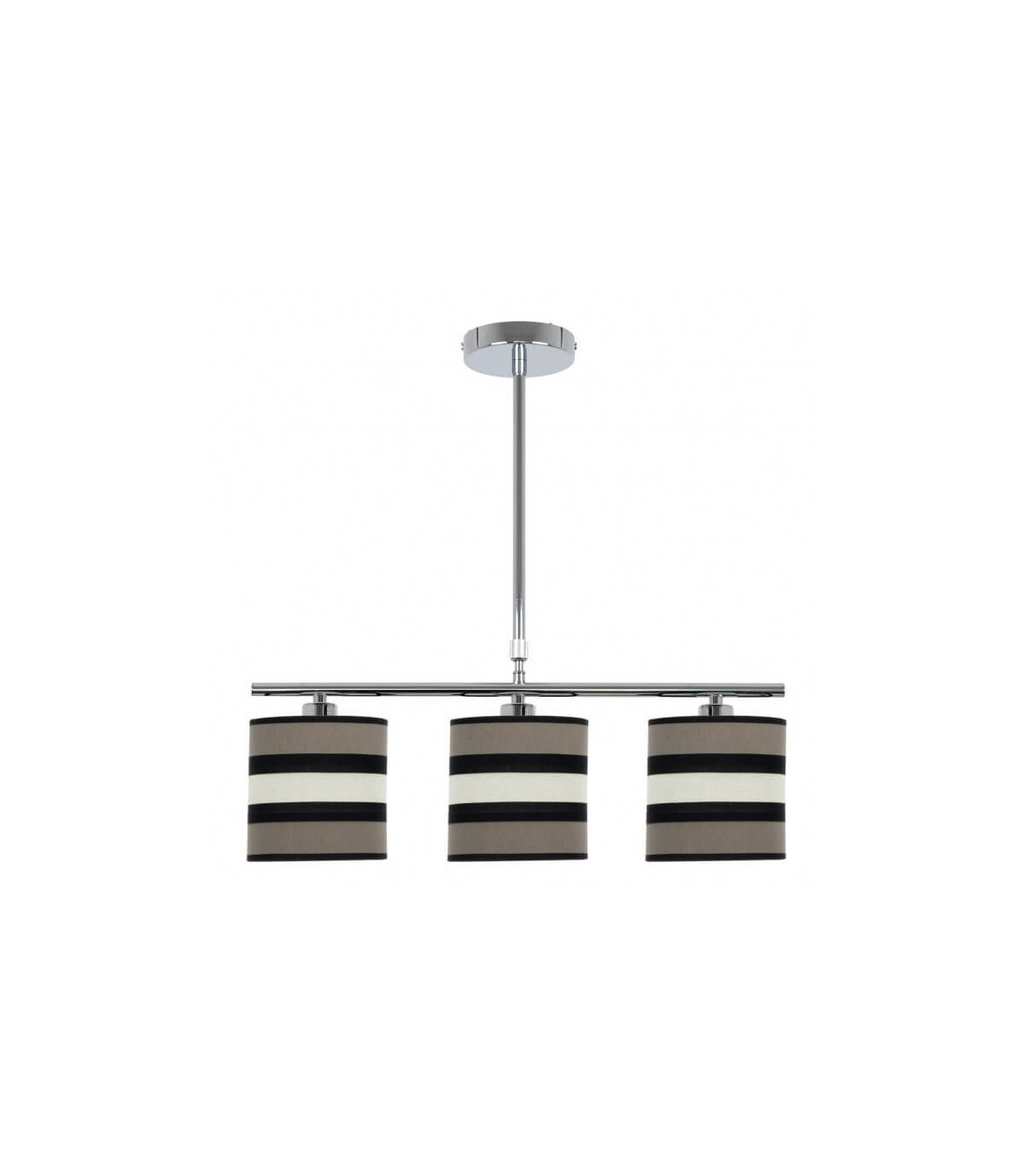 Lámpara de techo de la serie Karla, con la pantalla topo, beis y negro y vivo en negro. Destaca su pantalla, por su diseño moderno y la combinación de sus colores. Composición muy elegante compatible con el nuevo estilo Vintage, ideal para iluminar en dormitorios, comedores, salones, despachos y salas de estar. En esta misma serie podemos encontrar a juego los colgantes de 40, 50 y 60 centímetros de diámetro, dos medidas de sobremesas, el pie de salón y lámparas de cuatro, tres y dos luces, todos los modelos también en color topo/beis.