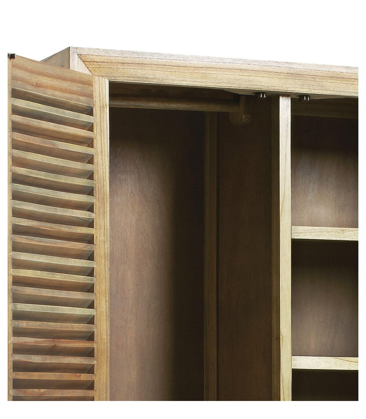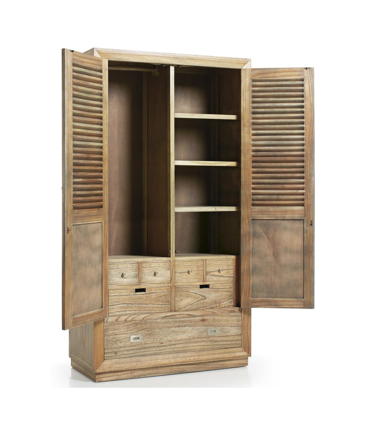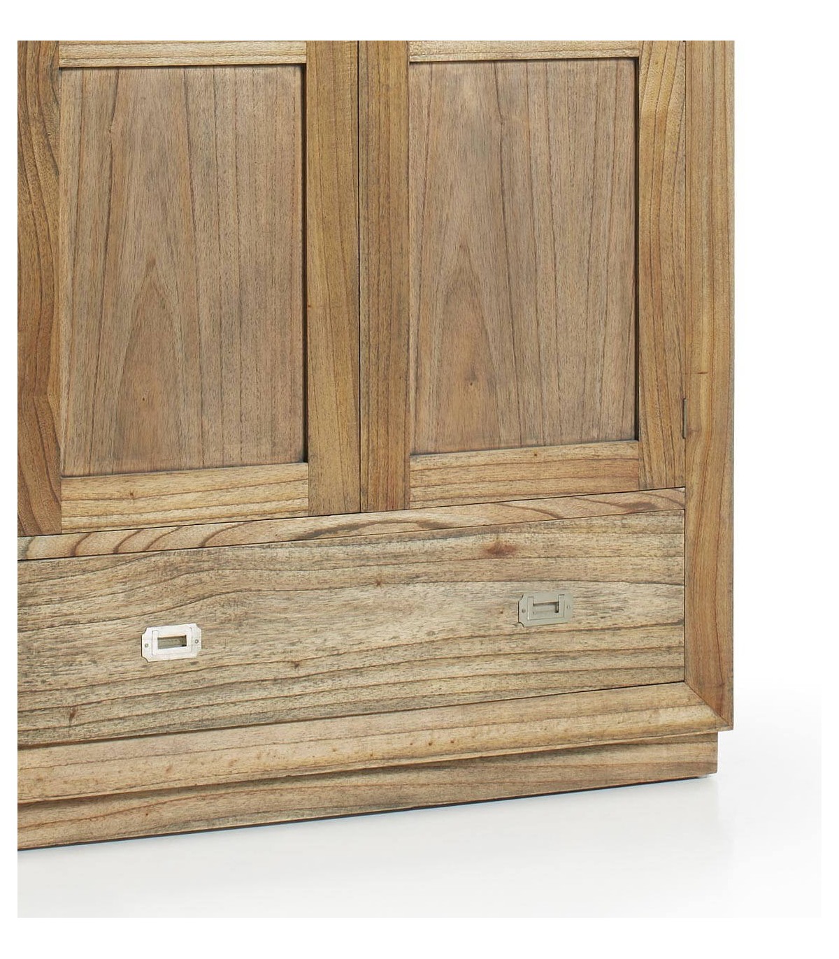 Armario de nuestra colección Merapi, Una colección realizada en madera maciza de mindi de estilo colonial con un toque moderno, realizada de forma artesanal a mano una gran colección con muebles para todas las zonas de tu casa, de líneas rectas con el detalle curvo en sus frentes, y el contraste entre su acabado natural y el bronce cromado, un mueble que aporta calidez y presencia.