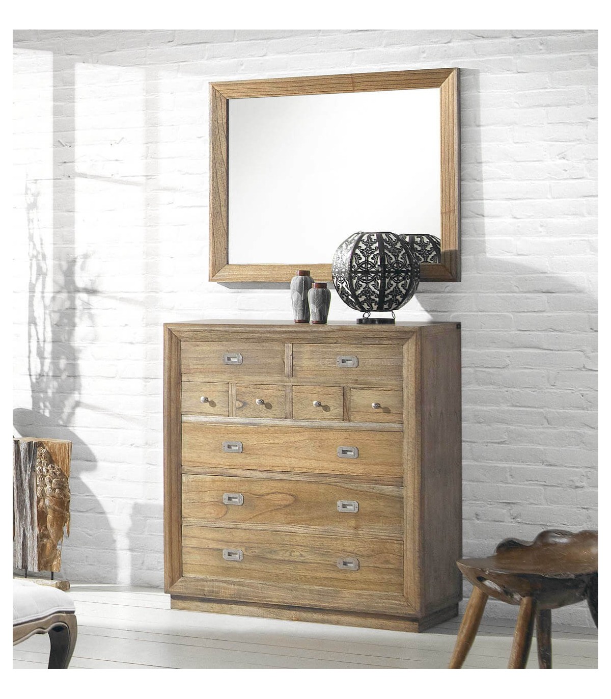 Espejo de nuestra colección Merapi, Una colección realizada en madera maciza de mindi de estilo colonial con un toque moderno, realizada de forma artesanal a mano una gran colección con muebles para todas las zonas de tu casa, de líneas rectas con el detalle curvo en sus frentes, y el contraste entre su acabado natural y el bronce cromado, un mueble que aporta calidez y presencia.