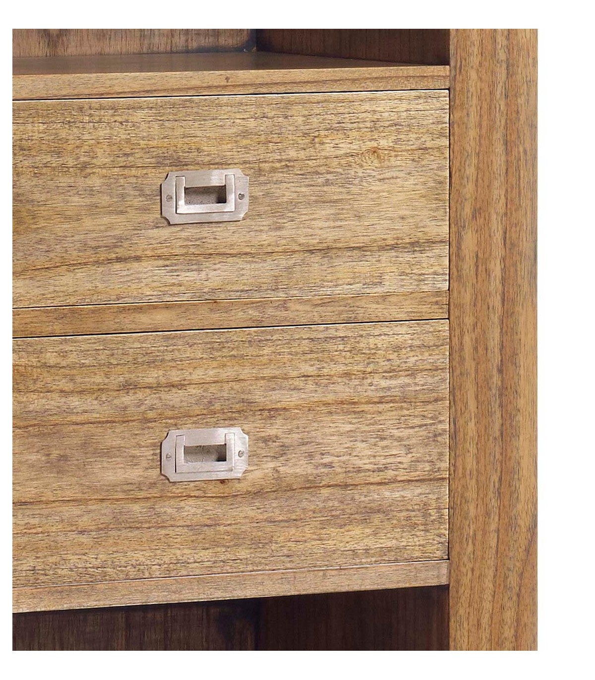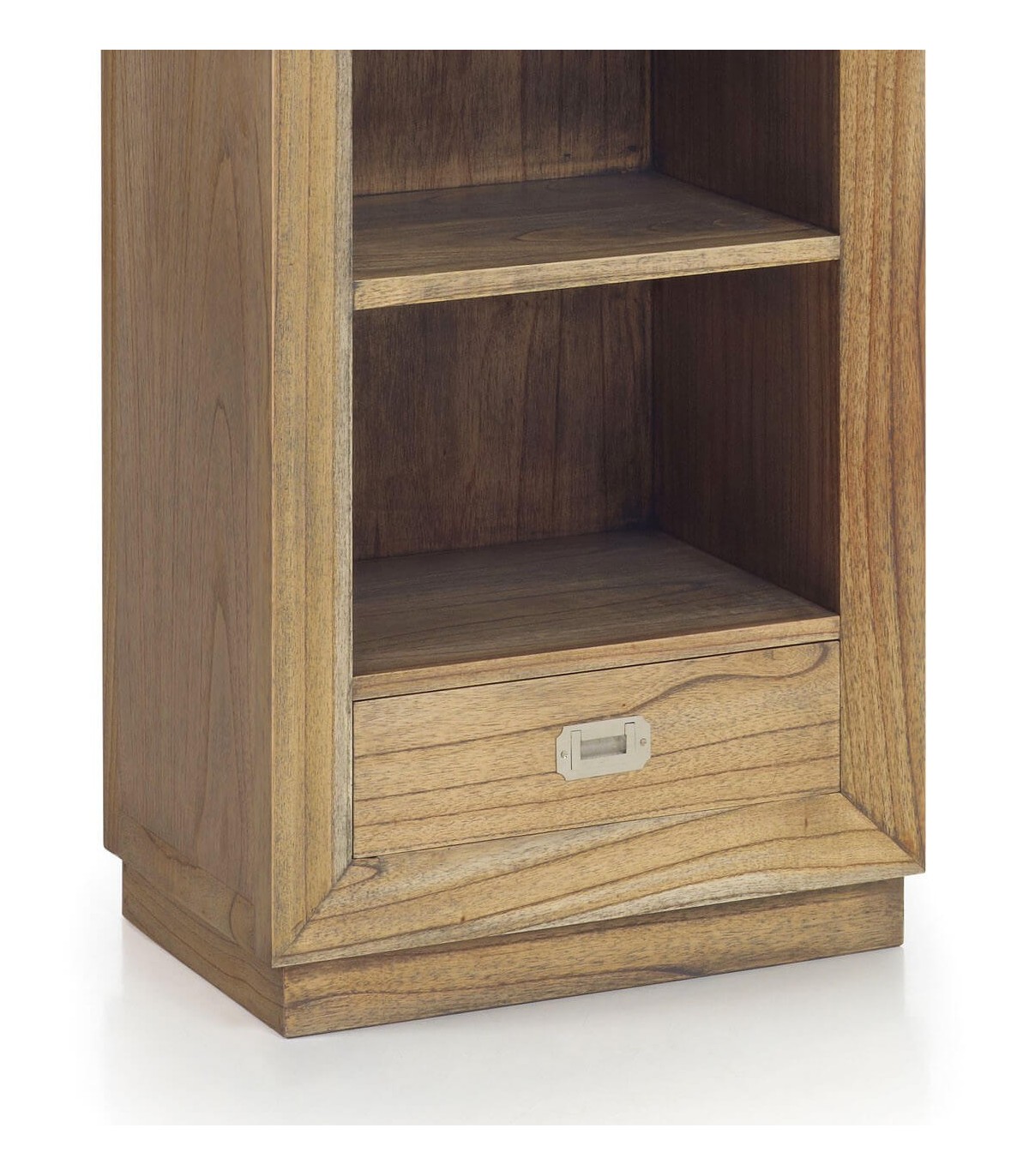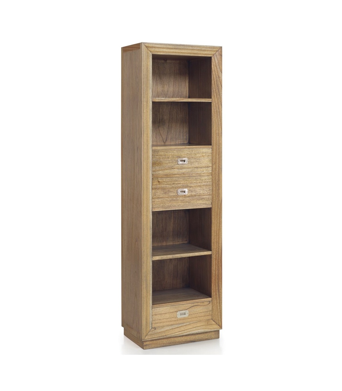 Librería de nuestra colección Merapi, Una colección realizada en madera maciza de mindi de estilo colonial con un toque moderno, realizada de forma artesanal a mano una gran colección con muebles para todas las zonas de tu casa, de líneas rectas con el detalle curvo en sus frentes, y el contraste entre su acabado natural y el bronce cromado, un mueble que aporta calidez y presencia.