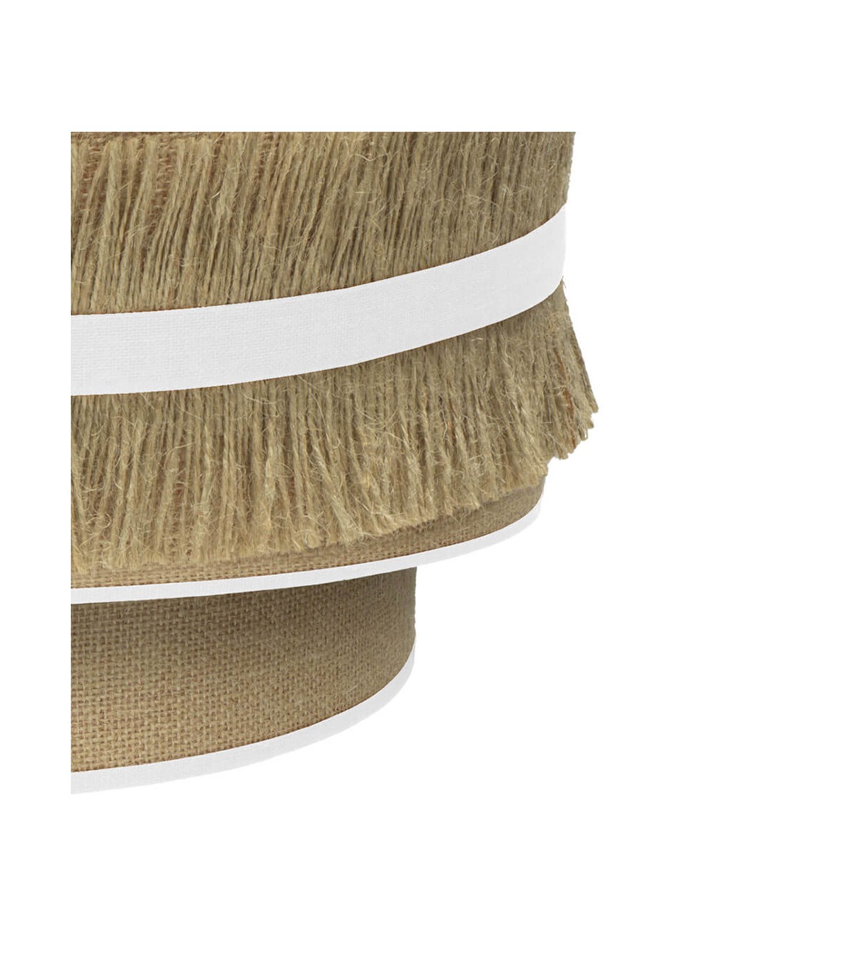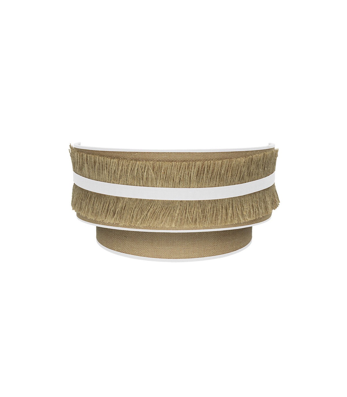 Aplique de pared de la serie Natalia. Se caracteriza por su original pantalla, confeccionada con una bonita pasamanería de hilos en tela de saco combinado con algodón en color blanco, aportando un diseño exclusivo y muy elegante para dormitorios, entraditas, salones y salas de estar, combinando con múltiples estilos de decoración, desde el rústico al vintage, moderno o clásico.