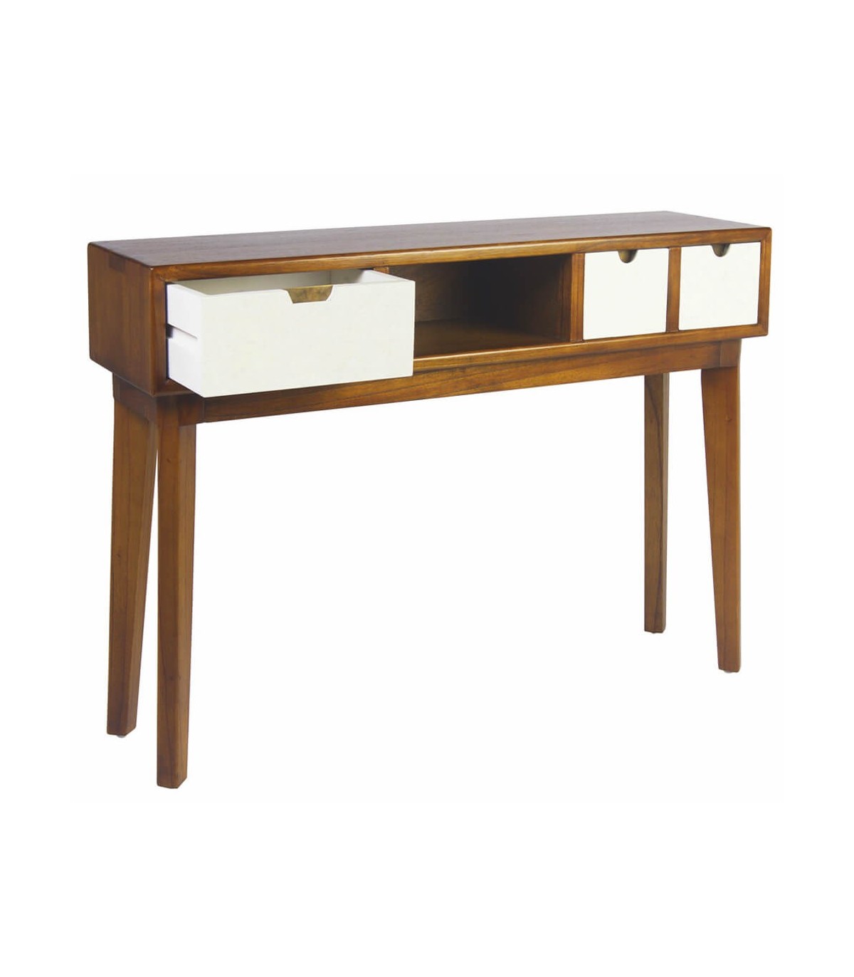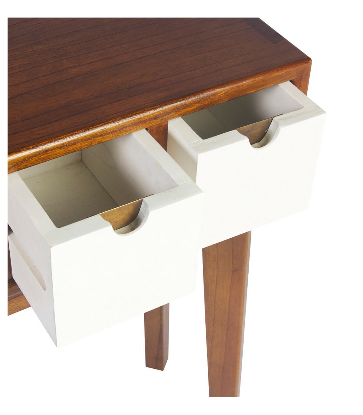 - Acabado, 100 % artesanal, hecho a mano. Madera maciza acabado teca, frente de cajones lacados en blanco, tiradores bronce.