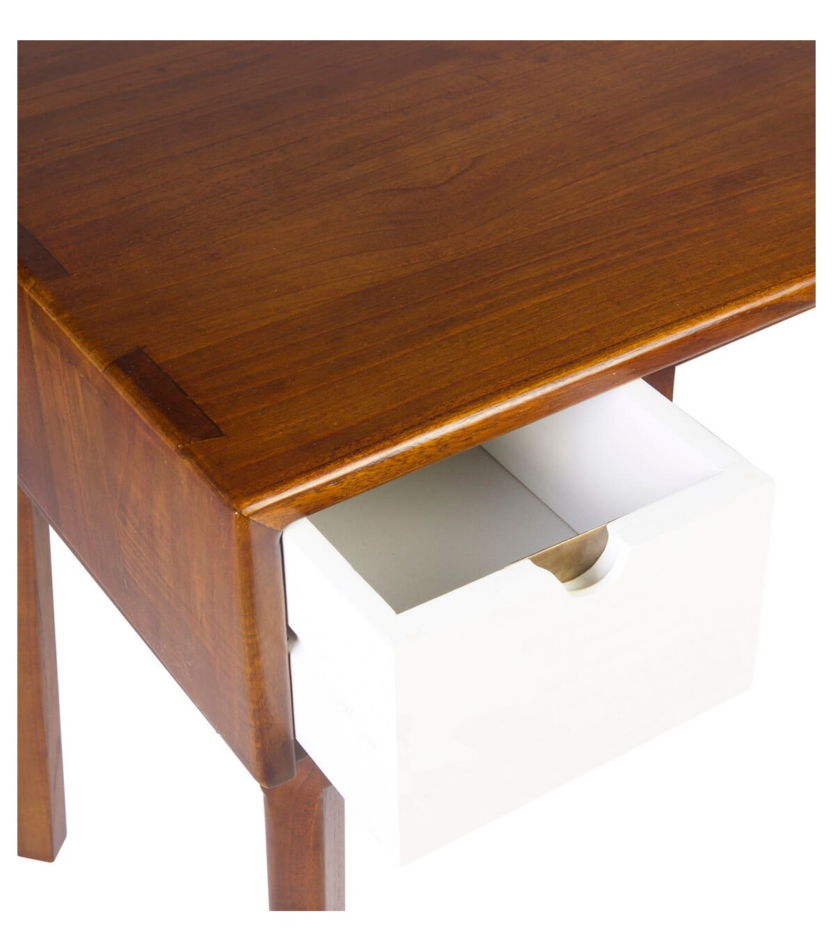 - Acabado, 100 % artesanal, hecho a mano. Madera maciza acabado teca, frente de cajones lacados en blanco, tiradores bronce.